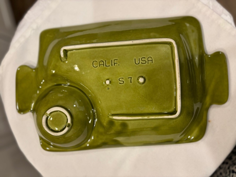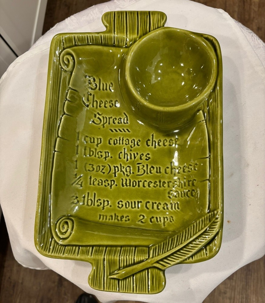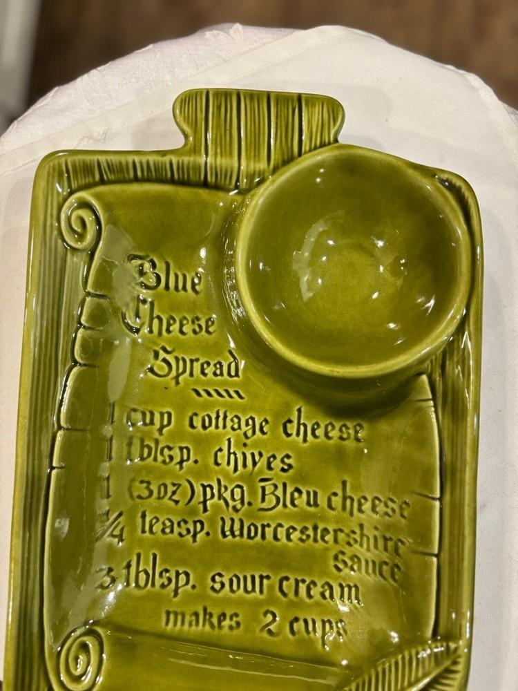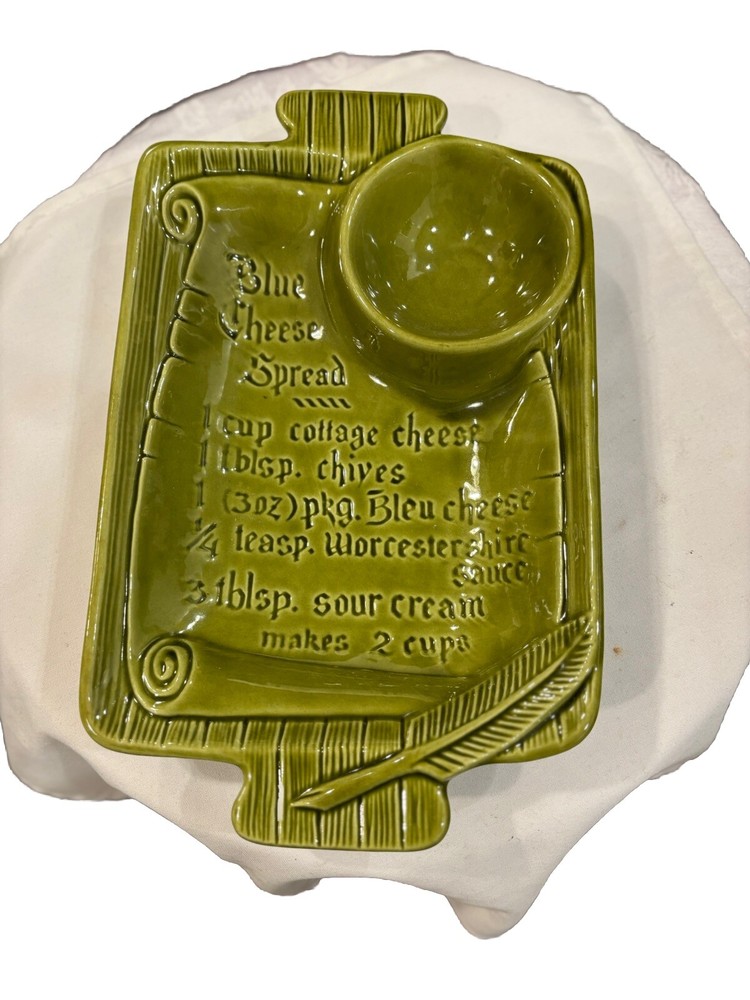 This vintage chip dip ceramic dish in olive green is the perfect addition to your collection. Made in the USA, it features a tray for easy serving and is perfect for any occasion. The dish is preowned but still has plenty of life left in it. Use it to serve your favorite dips or simply display it on your shelf. The color is a beautiful shade of green and the material is high-quality ceramic. This piece is a must-have for any collector or lover of vintage kitchenware. Recipe for dip imprinted on dish. Returns accepted within 30 days; buyer pays return shipping.