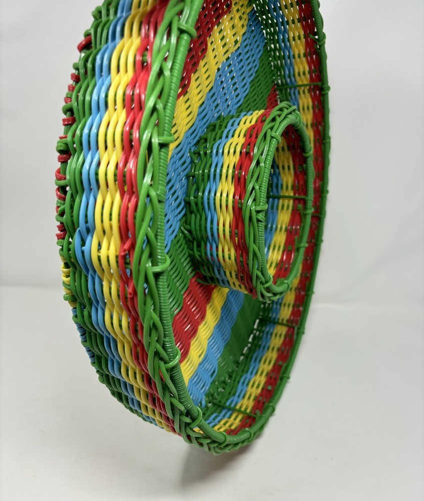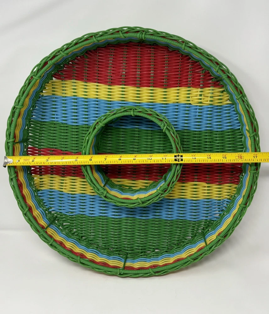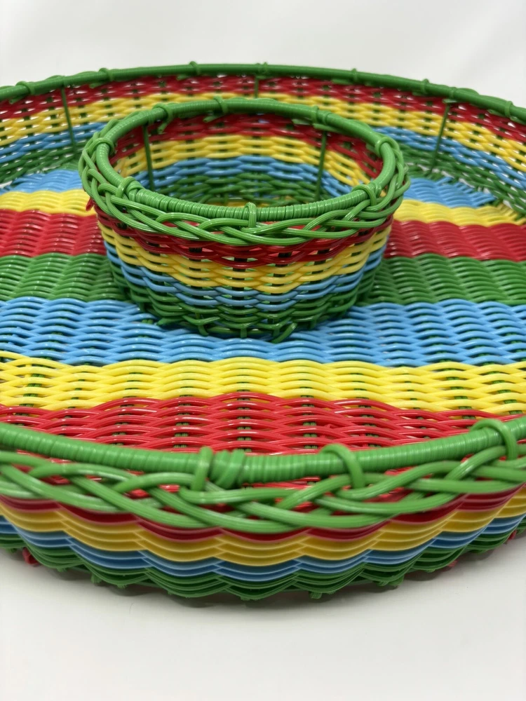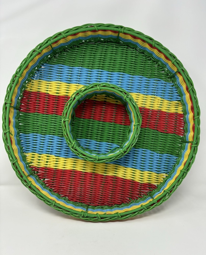 This vintage chip n dip snack serving tray is a unique addition to any collection. The round wire basket features a colorful woven design and is perfect for serving snacks or a meal. Measuring 17 inches this large basket is ideal for all occasions, both indoor and outdoor. Crafted from durable plastic and handmade. The production technique of weaving adds an interesting touch to the design. Nice decorative collectible, in great condition. Thank you for viewing.