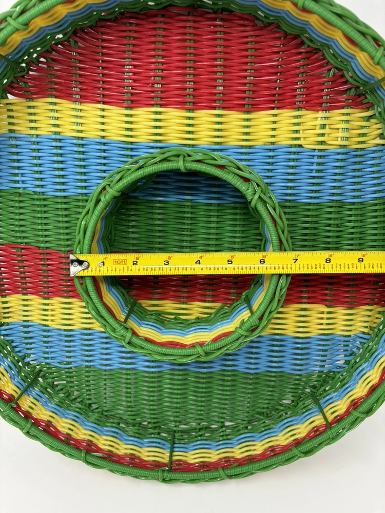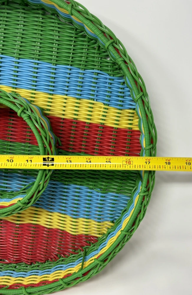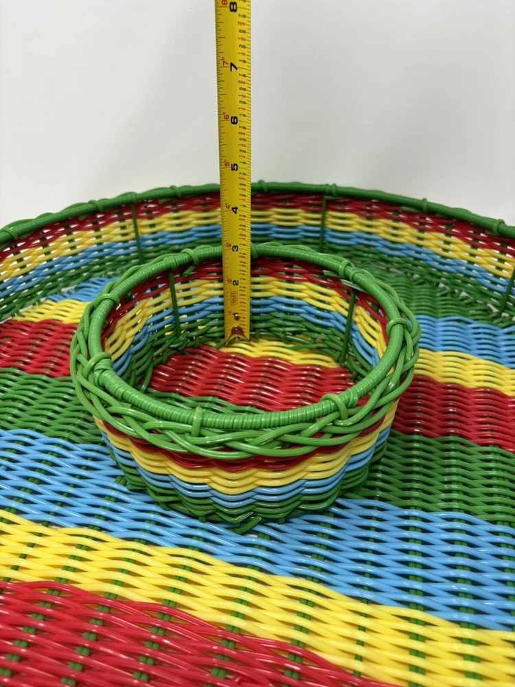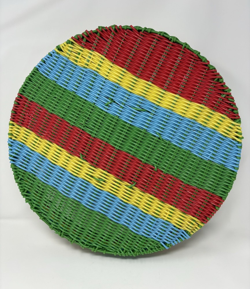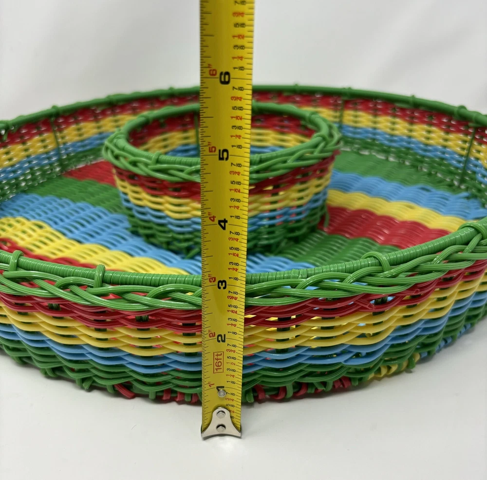 This vintage chip n dip snack serving tray is a unique addition to any collection. The round wire basket features a colorful woven design and is perfect for serving snacks or a meal. Measuring 17 inches this large basket is ideal for all occasions, both indoor and outdoor. Crafted from durable plastic and handmade. The production technique of weaving adds an interesting touch to the design. Nice decorative collectible, in great condition. Thank you for viewing.