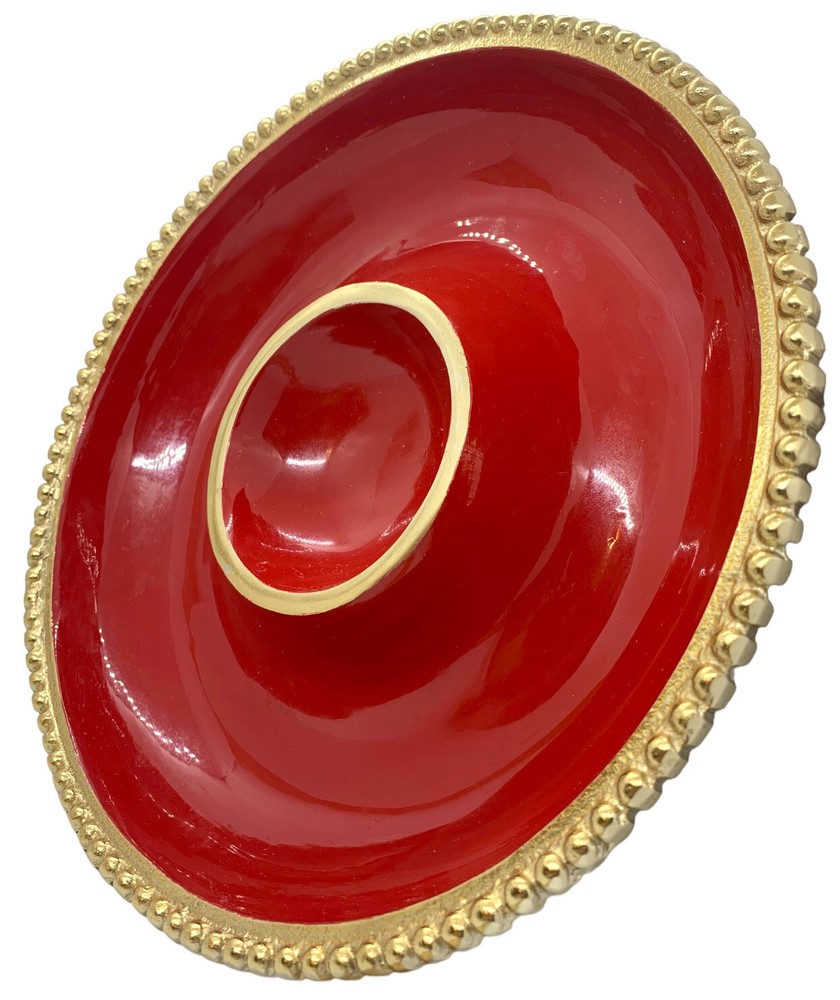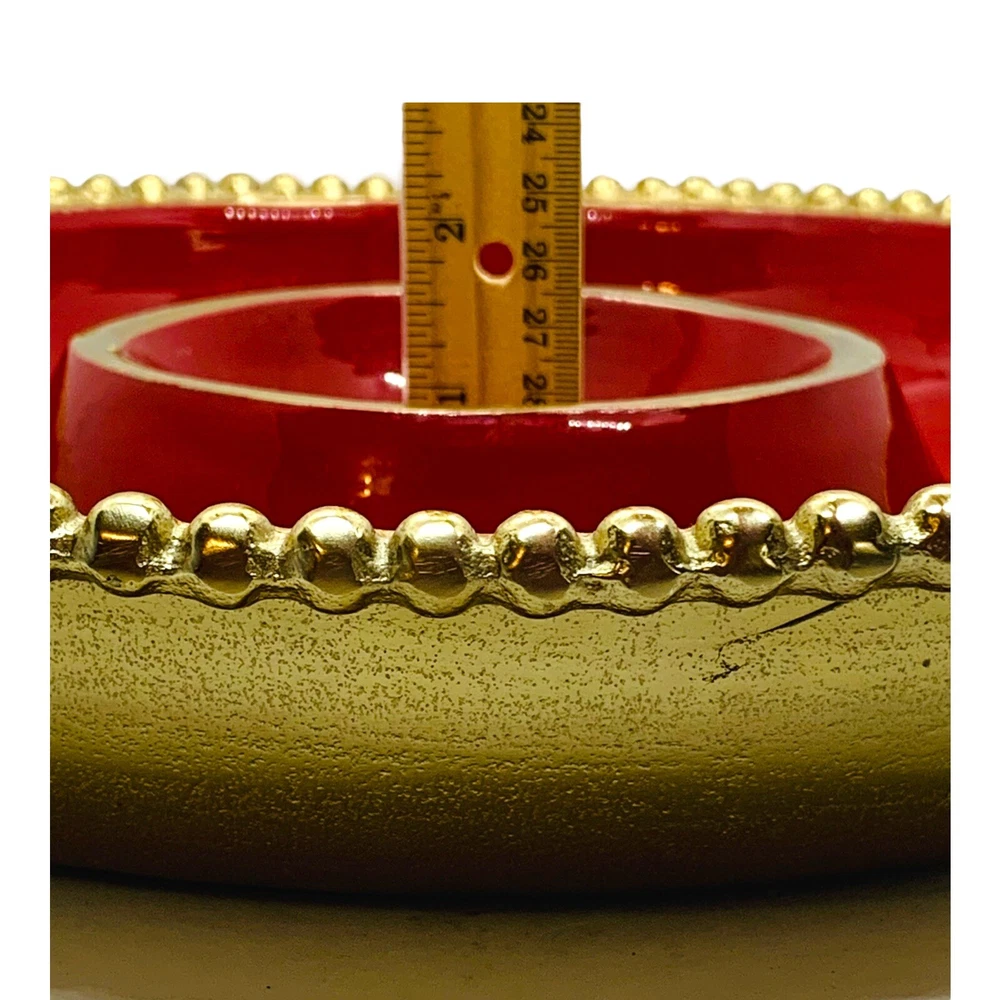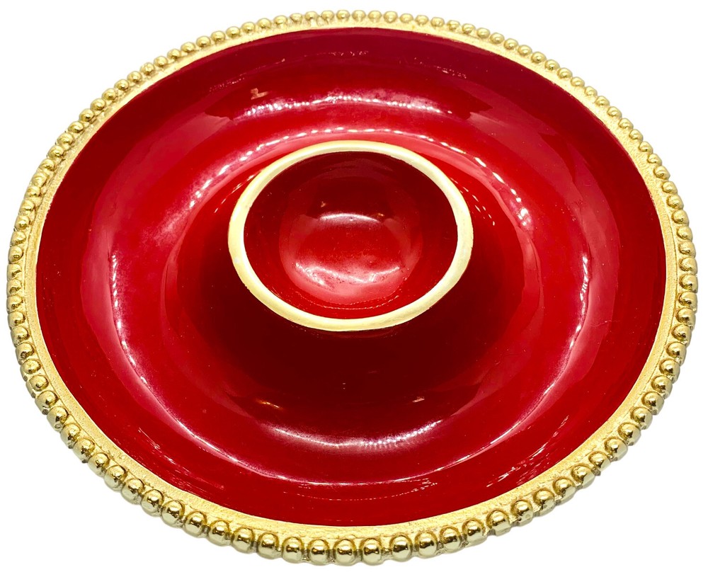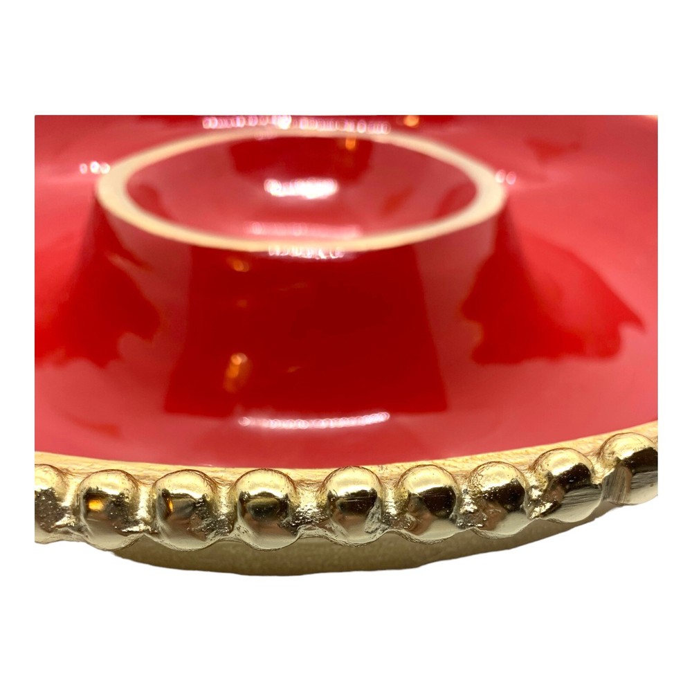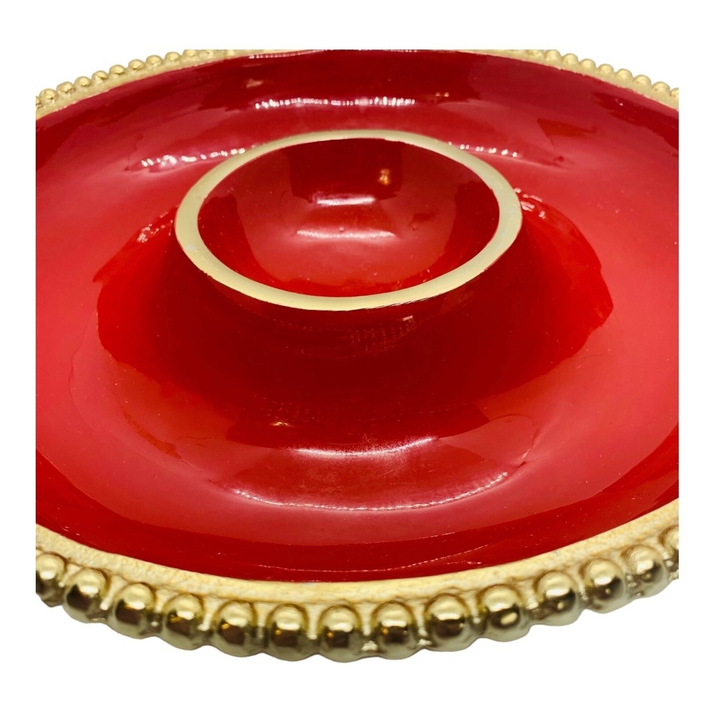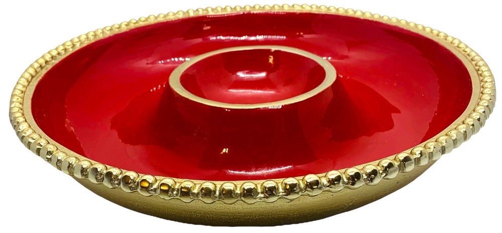 Large metal chip and dip tray red enamel with gold beaded edge and accents. Bottom is also gold. Unmarked Thank you for shopping at Play the Planet and helping us give new life to old stuff. When possible, we use recycled boxes and packing materials (such as packing peanuts, air bags, and paper). If you buy from Play the Planet, please be so kind as to leave us feedback. If you experience issues with your purchase, please contact us first so we have a chance to make things right before you contact eBay. The majority of our items are vintage or pre-owned. We try very hard to disclose any flaws we find and provide pictures so you can decide if the item is still right for you. We do not clean most of our vintage items, except for surface cleaning when taking pictures. We hope you enjoy your item(s)!