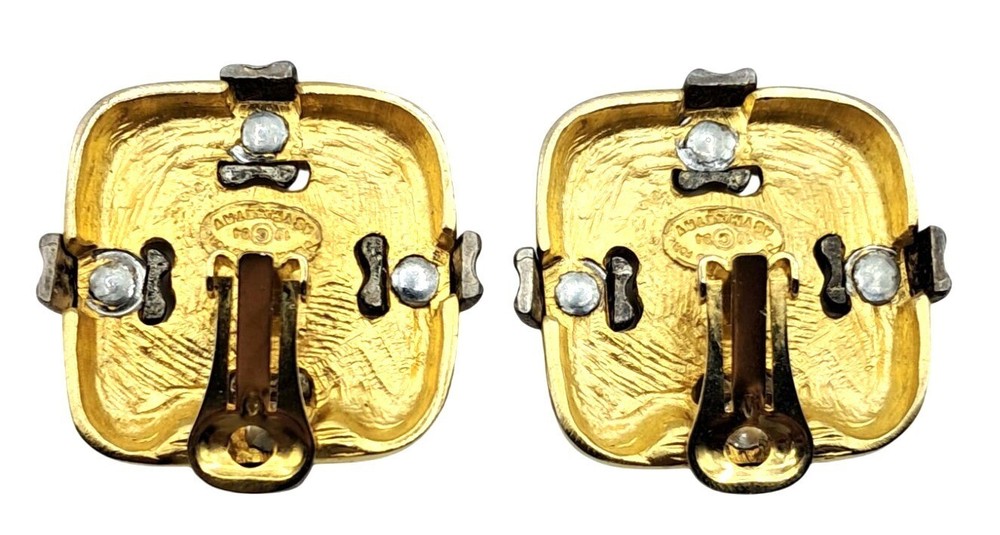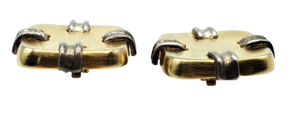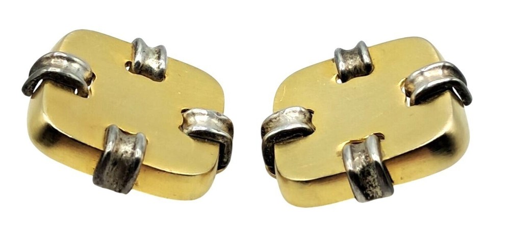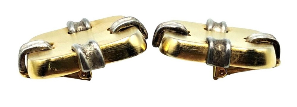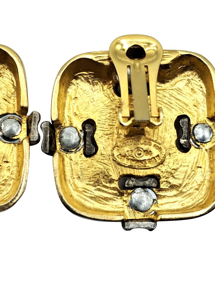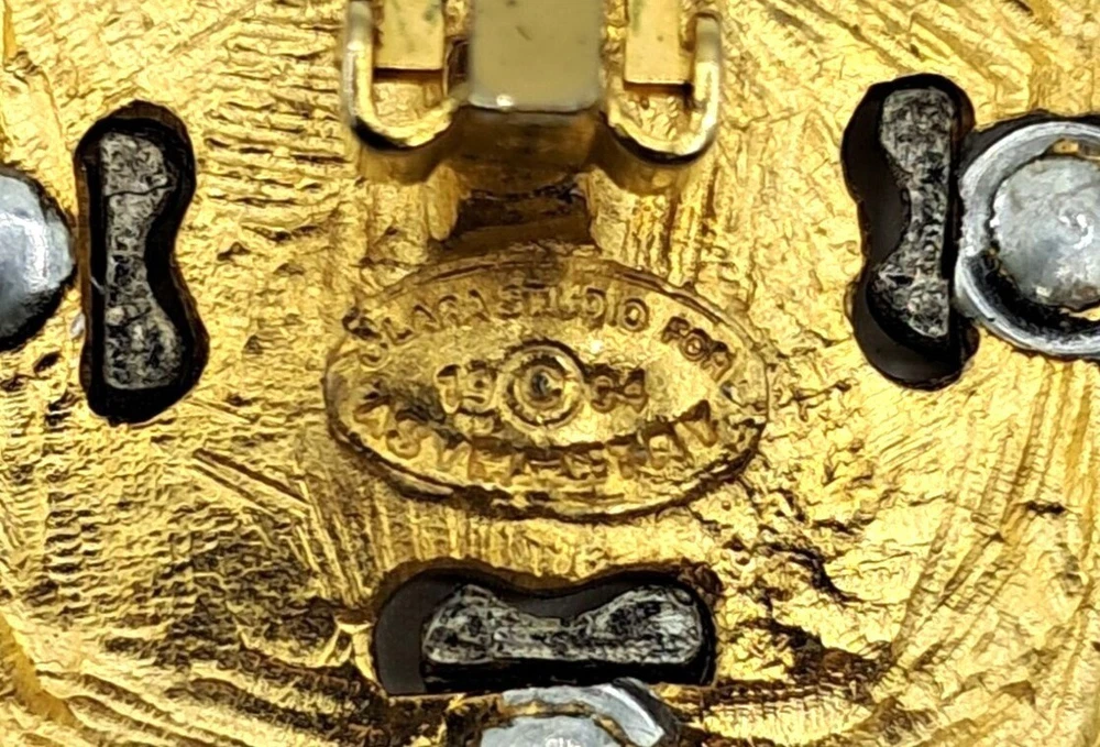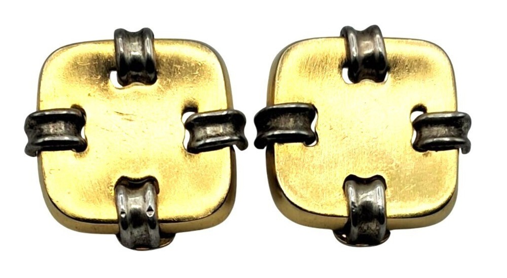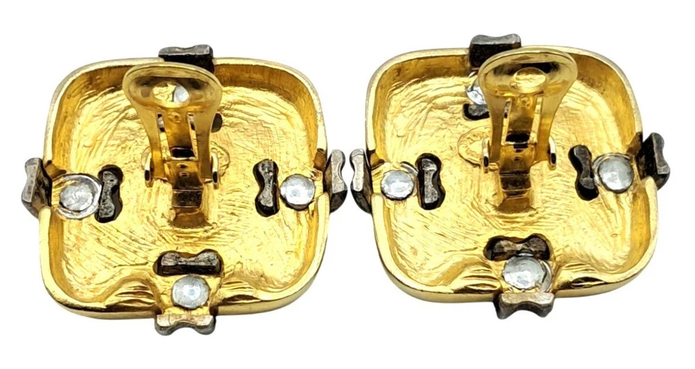Vintage Clara Studio Earrings 1994 for Asymmetry Gold Tone Large Chunky Clip Ons Jewelry Vintage Clara Studio for Asymmetry earrings from 1994, featuring a bold asymmetrical design. These large, chunky clip-on earrings have a gold-tone matte finish with silver tone accents, adding a touch of retro glamour to any outfit. Perfect for vintage jewelry enthusiasts. They measure 1.25" across. Light, superficial scratches on surface. Please see photos. • Vintage from 1994 • Asymmetrical design • Gold-tone finish • Large, chunky style • Clip-on earrings • Retro glamour