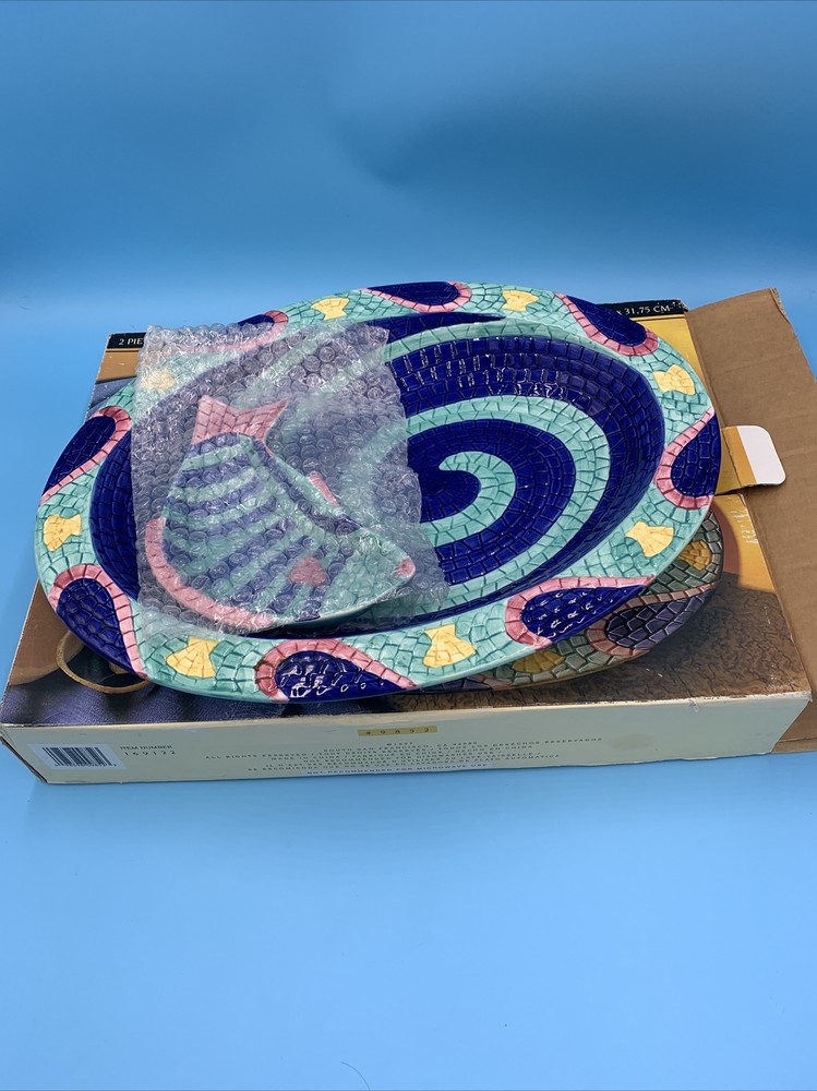 Vintage Clay Art 1995 Mosaic Fish Hand Painted Chip & Dip Set.....