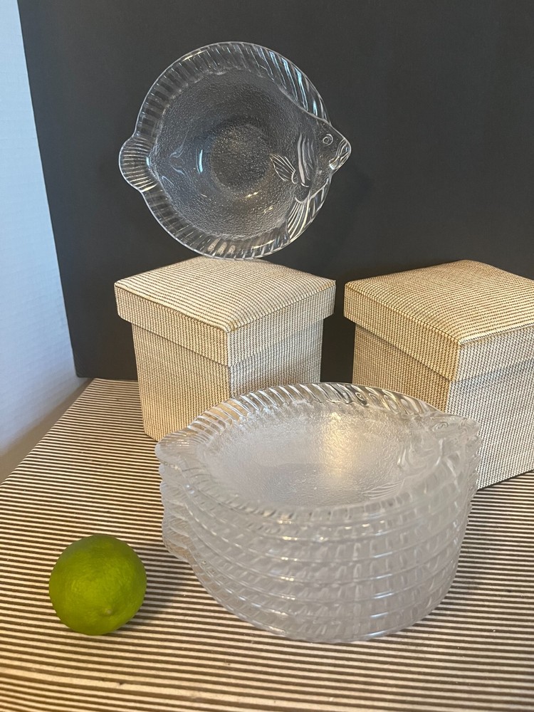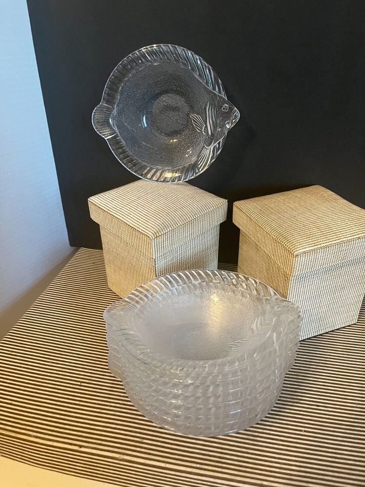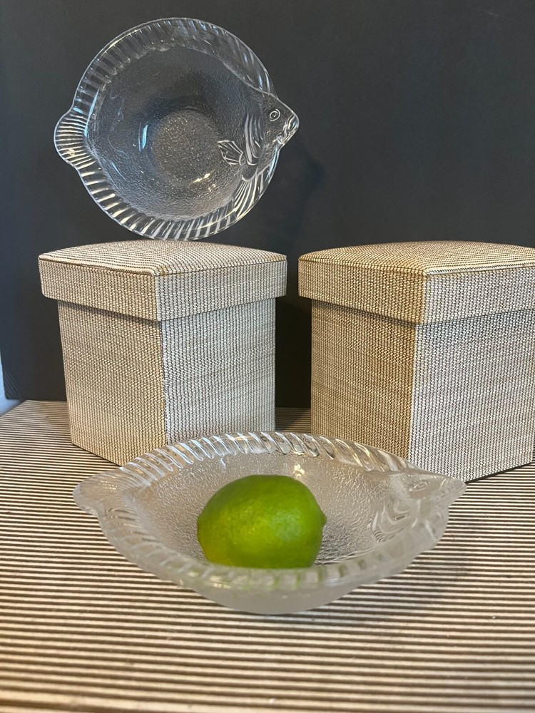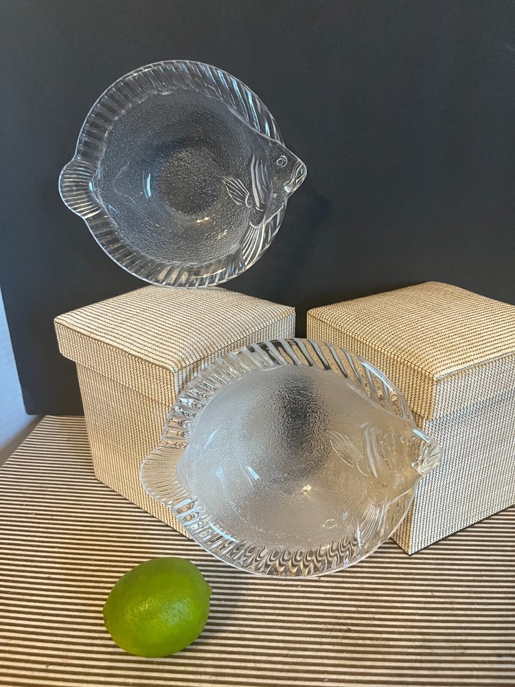 The product is a set of 2 vintage clear glass salad or fruit bowls in a fish-shaped design, featuring a frosted finish. Made of pressed glass by Studio Nova in Japan, these bowls are perfect for serving candies or nuts. The transparent clear color and fish-themed design add a decorative touch to any table setting. Ideal for collectors or those looking to add a unique and charming piece to their home decor.