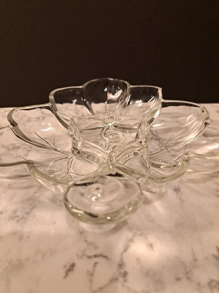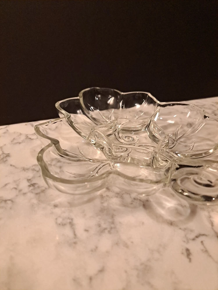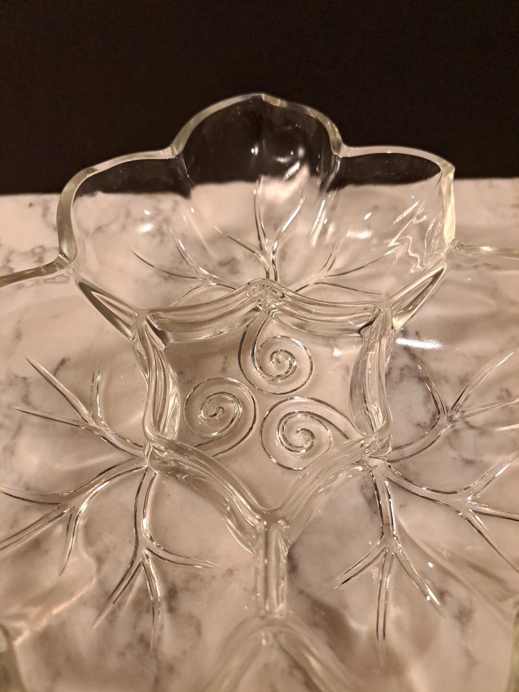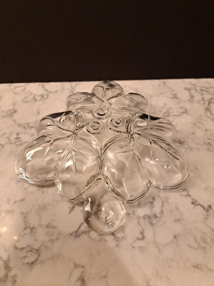 This vintage clear glass serving plate is a beautiful addition to any collection. The leaf-shaped design adds a touch of elegance to any table setting, and the olive relish dish dip bowl is perfect for serving your favorite dips and spreads. The plate is made of high-quality cut glass and was produced using studio crafting techniques in the 1970s. The plate is unmarked, but its production style and time period manufactured suggest that it is a rare find. The set includes a bowl and plate, and the material is 100% glass. The leaf theme adds a touch of nature to the plate, making it a perfect choice for any occasion. Whether you are looking for a unique piece of decorative cookware or a vintage addition to your dinnerware collection, this plate is sure to impress.