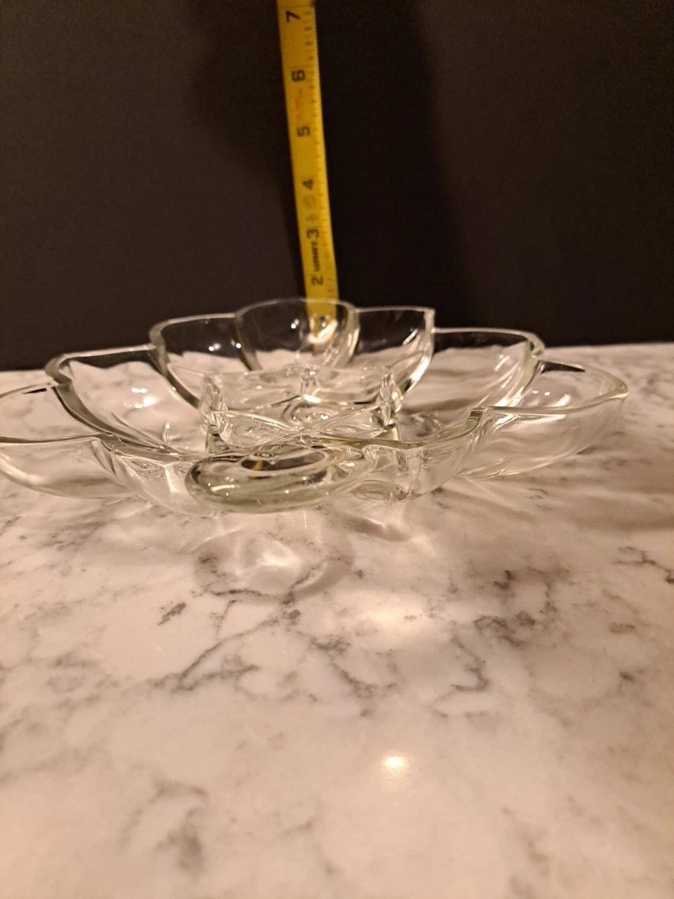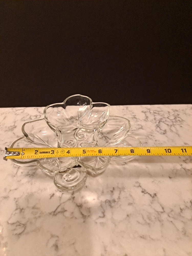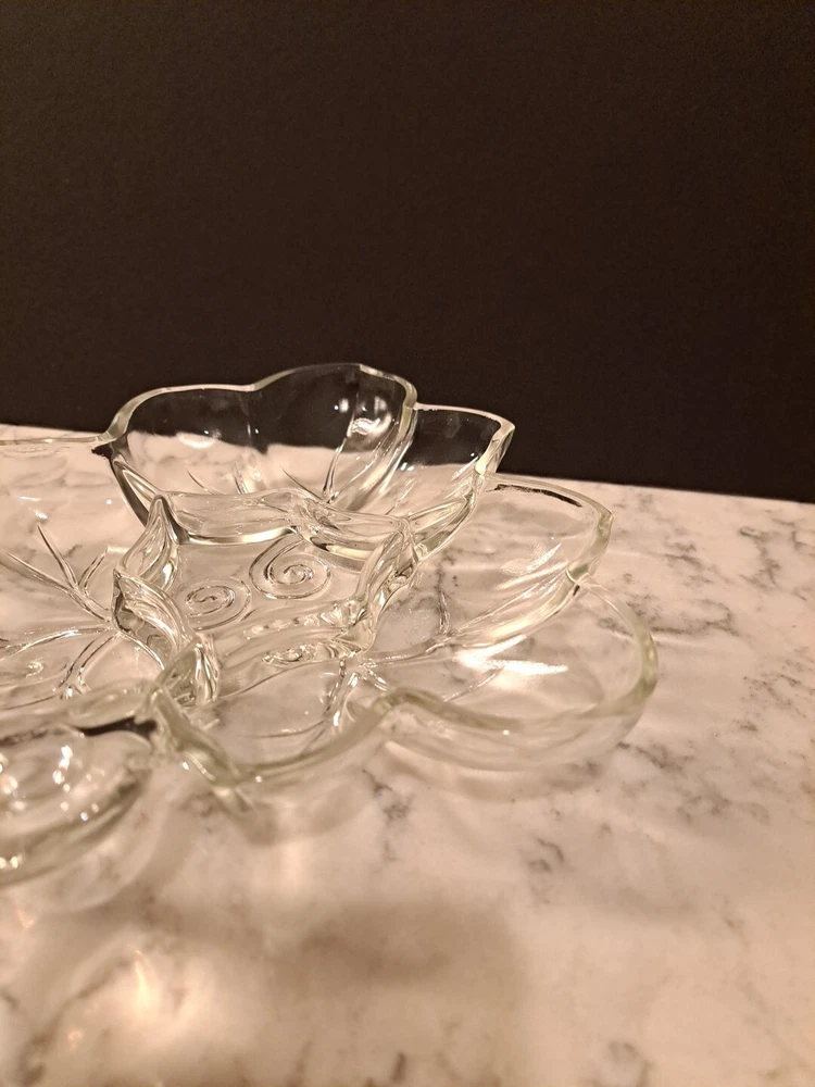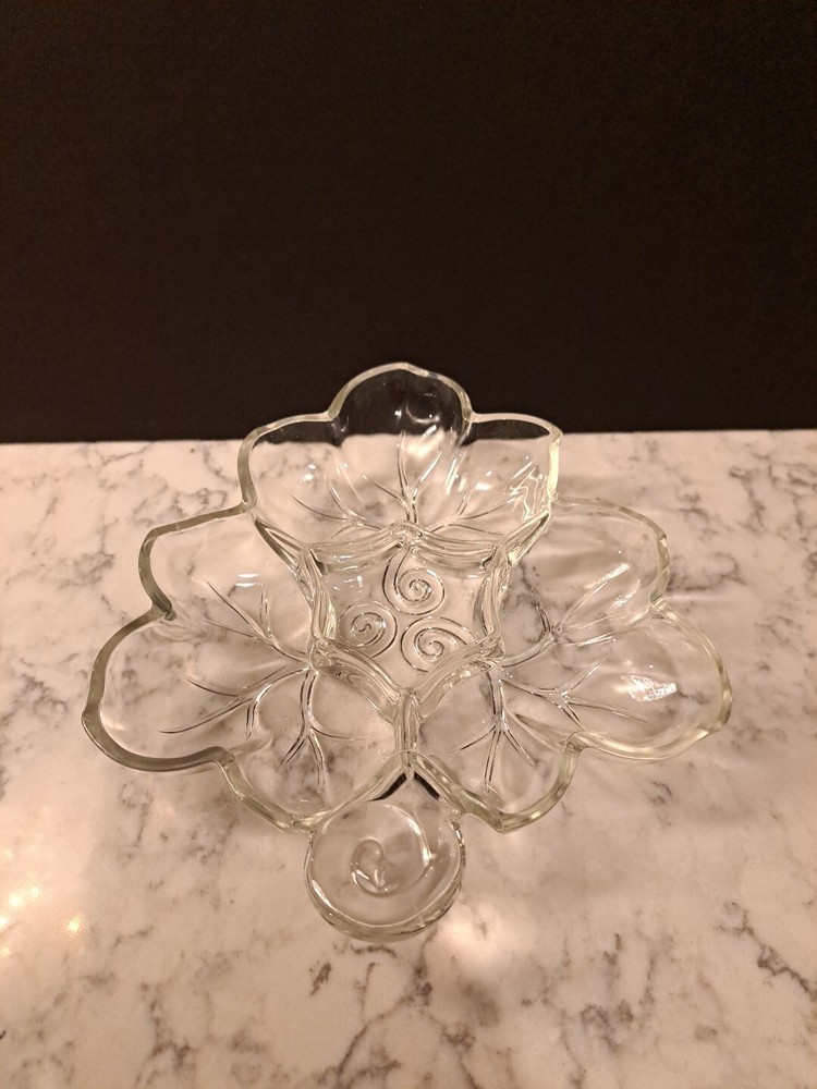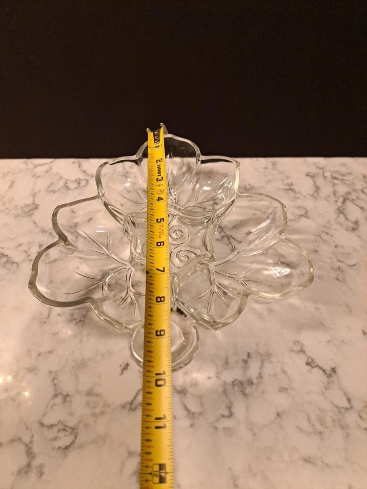 This vintage clear glass serving plate is a beautiful addition to any collection. The leaf-shaped design adds a touch of elegance to any table setting, and the olive relish dish dip bowl is perfect for serving your favorite dips and spreads. The plate is made of high-quality cut glass and was produced using studio crafting techniques in the 1970s. The plate is unmarked, but its production style and time period manufactured suggest that it is a rare find. The set includes a bowl and plate, and the material is 100% glass. The leaf theme adds a touch of nature to the plate, making it a perfect choice for any occasion. Whether you are looking for a unique piece of decorative cookware or a vintage addition to your dinnerware collection, this plate is sure to impress.