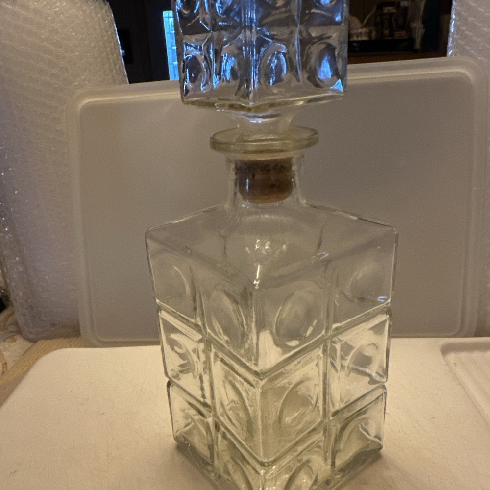 This vintage whiskey decanter is a clear, cube-shaped bottle from the 1960s, measuring 10 inches in height. It is an original piece of art glass, likely studio crafted, with a lid/stopper included. The decanter showcases a unique design with a square shape, making it a standout piece for any barware collection. The brand is unmarked, adding to its vintage appeal and adding to the mystery of its origins. A true collector's item for those who appreciate retro drinkware and glassware from the mid-20th century.