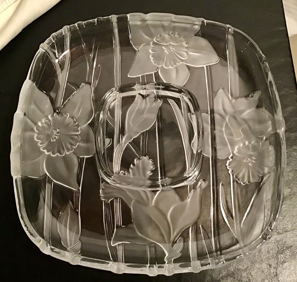 Vintage Crystal Clear Studios Narcissus Divided Sectional Platter from 1988. This square serving tray measures 13" x 13" with a center section for serving. Made of clear crystal with a glossy finish, it features a pattern of Narcissus flowers. The item is a contemporary piece of art glass, weighing 4.5 lbs. This original piece was studio crafted in Japan during the 1980s.