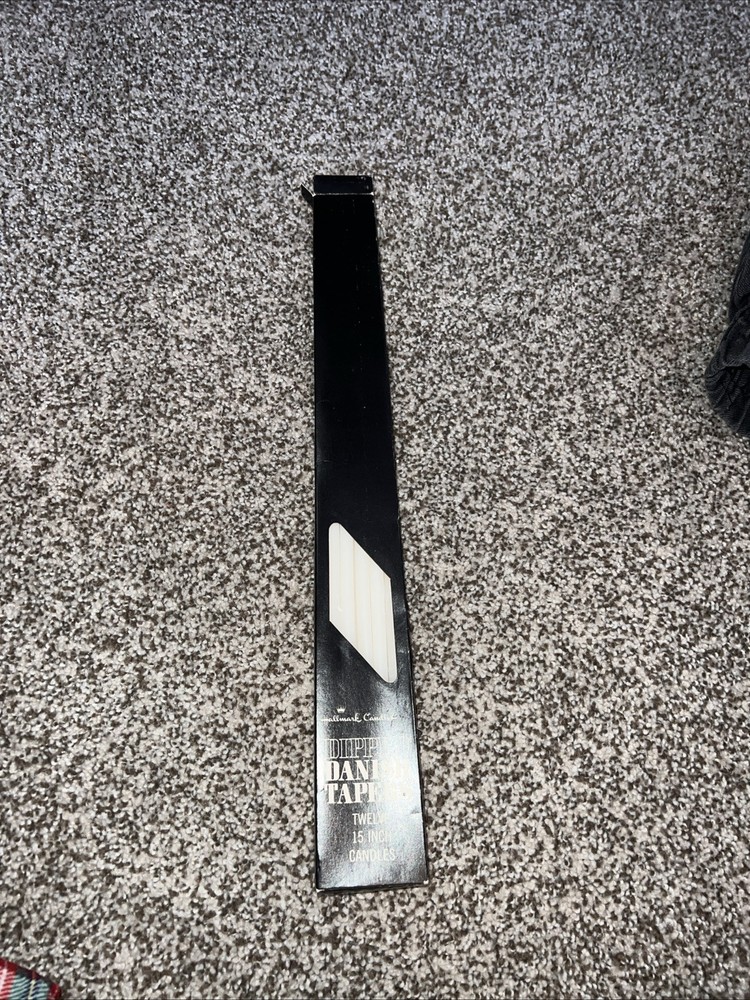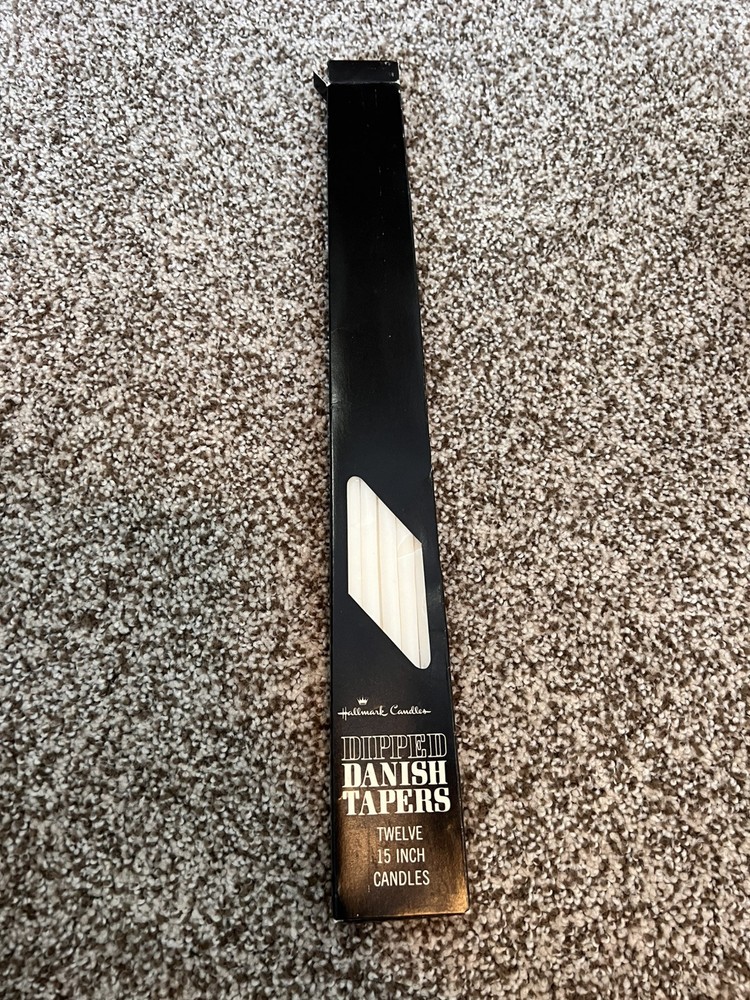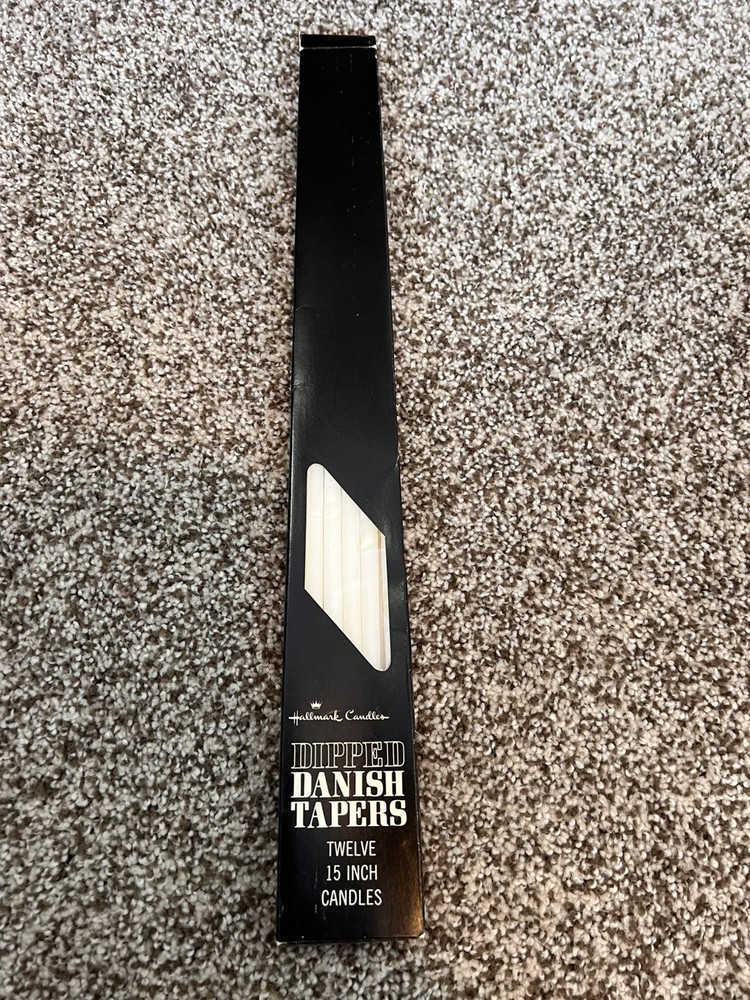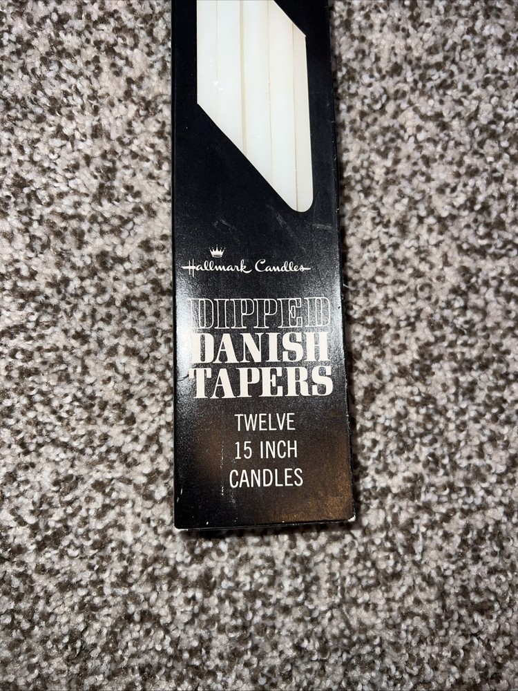 Vintage Danish 15" Tiny Taper Slim Skinny White Candles by Hallmark. This set of 12 hand-dipped candles is made of wax in Denmark. With a mid-century modern style, these unscented candles are perfect for any room. The taper/dinner candles have a slender 1/2" width and a classic white color. Each candle measures 15" in length and is powered by fire for a warm ambiance.