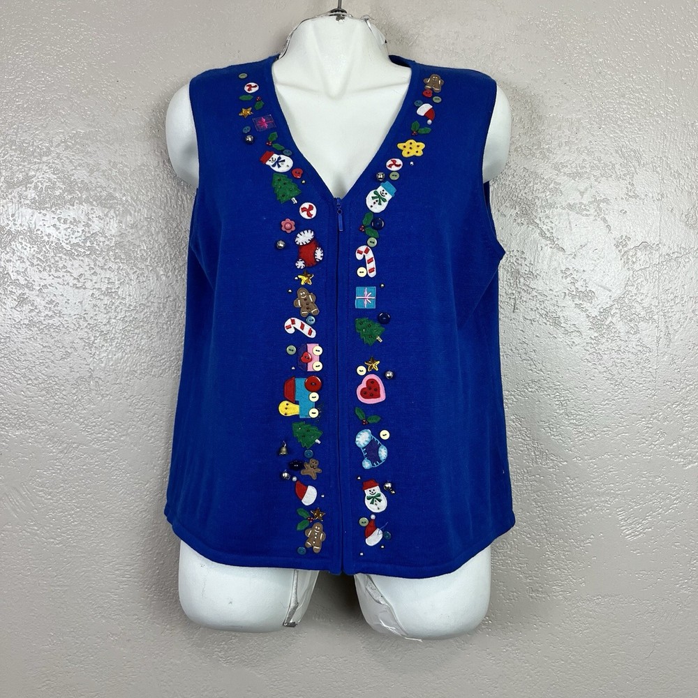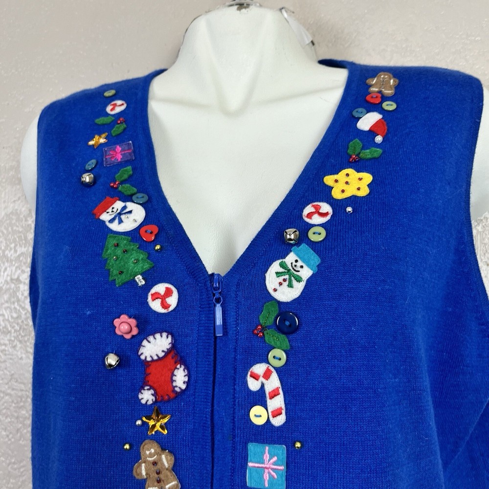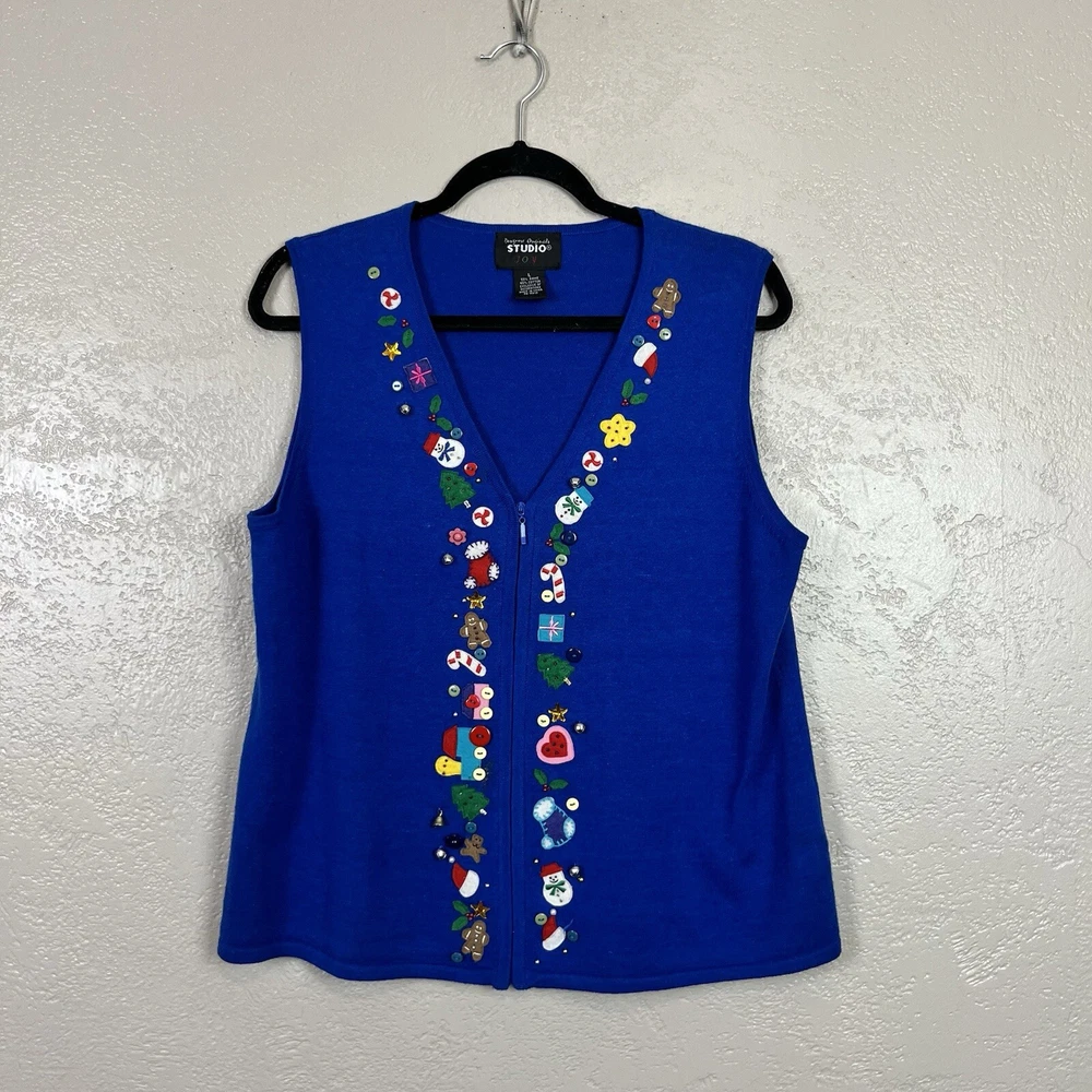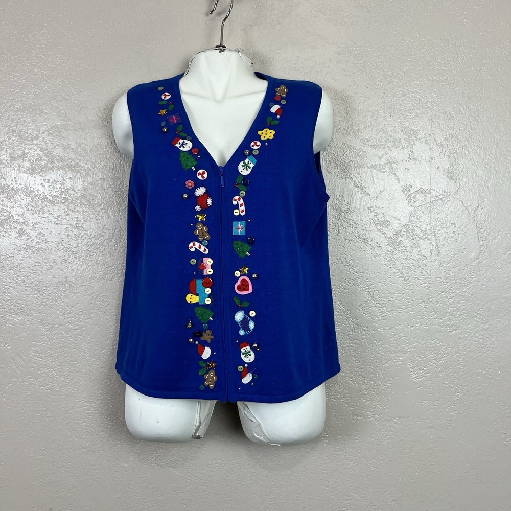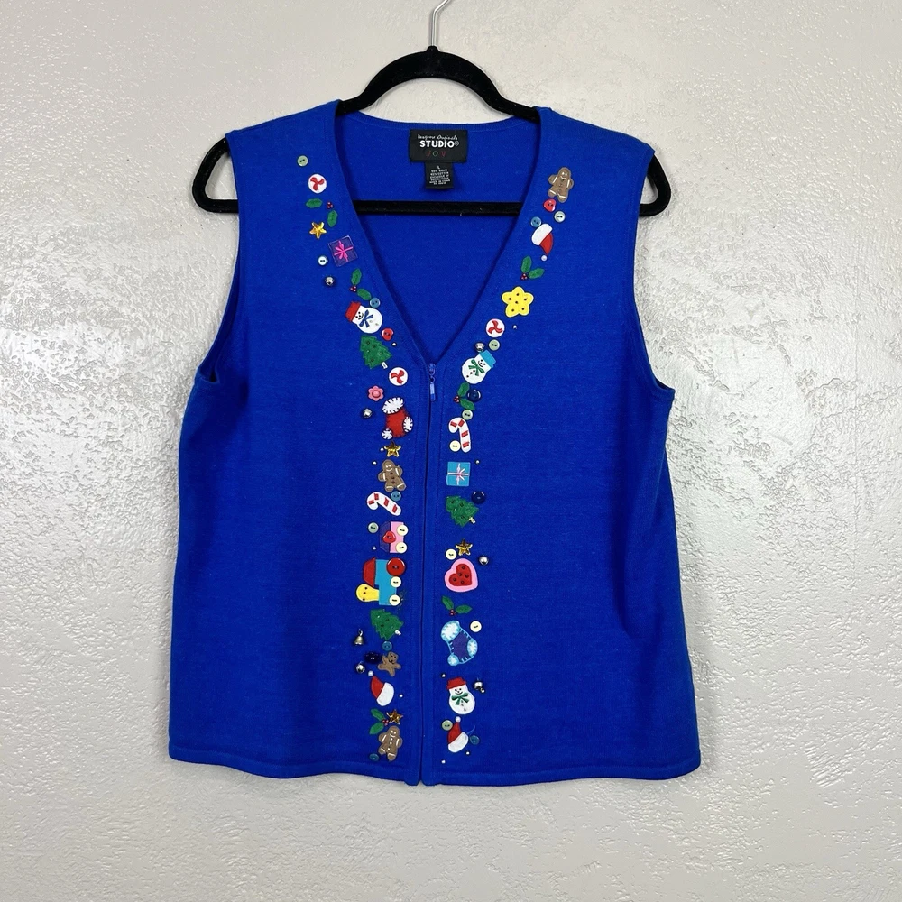 This vintage Designers Originals Studio JOY Vest features a festive holiday theme with snowmen and Christmas trees. The blue knit fabric is adorned with bells and a zipper closure. Handmade with ramie and cotton materials, this sleeveless mid-length vest is perfect for parties, casual wear, or business settings during the fall and winter seasons. Perfect for adding a touch of holiday cheer with its jingle bell accents.