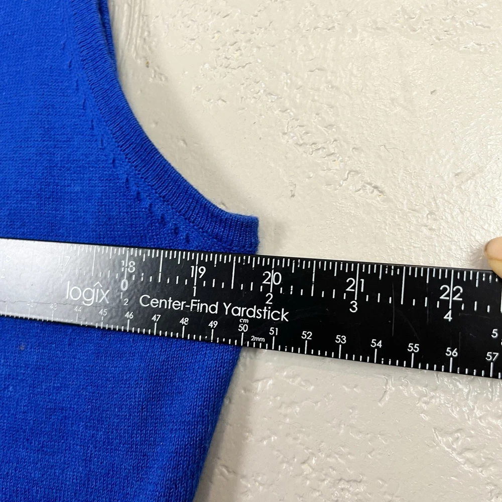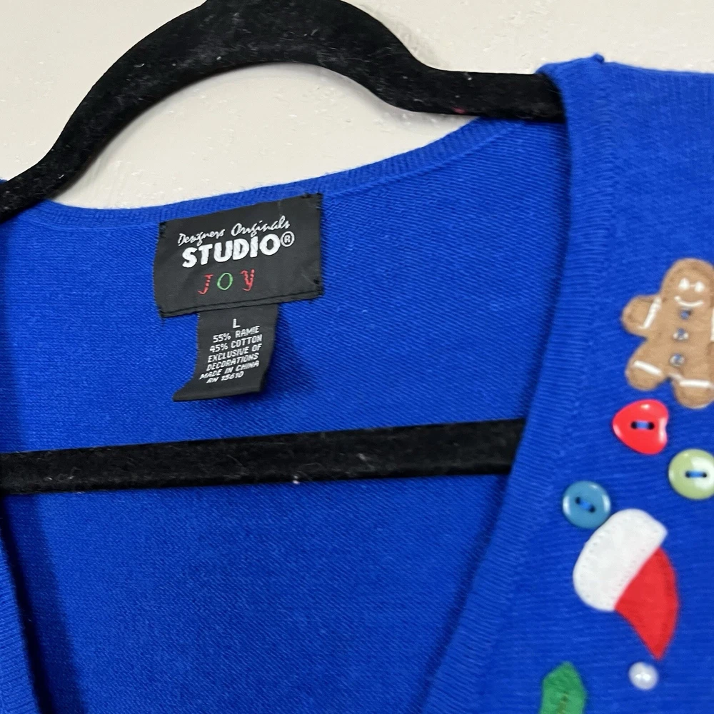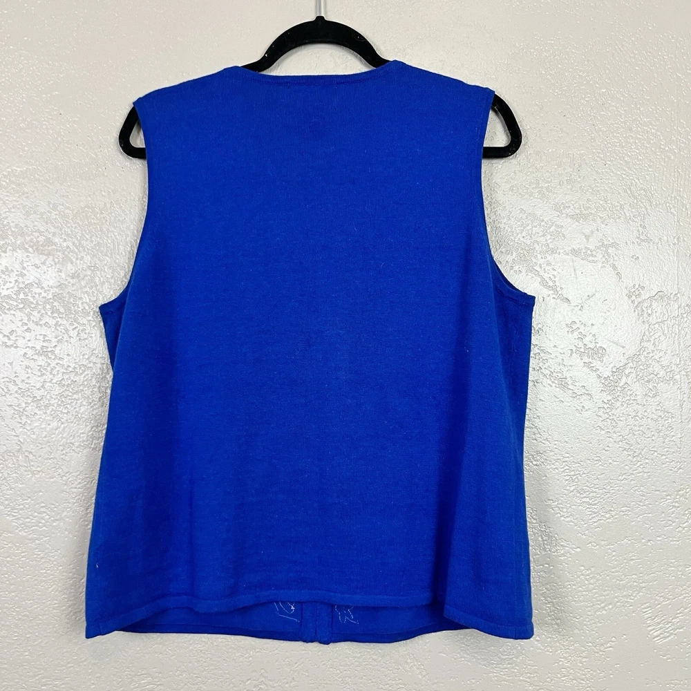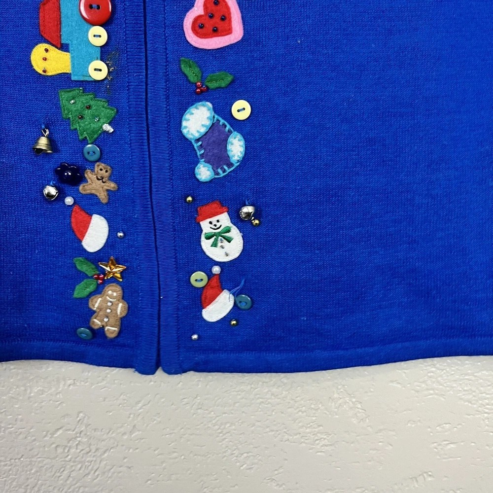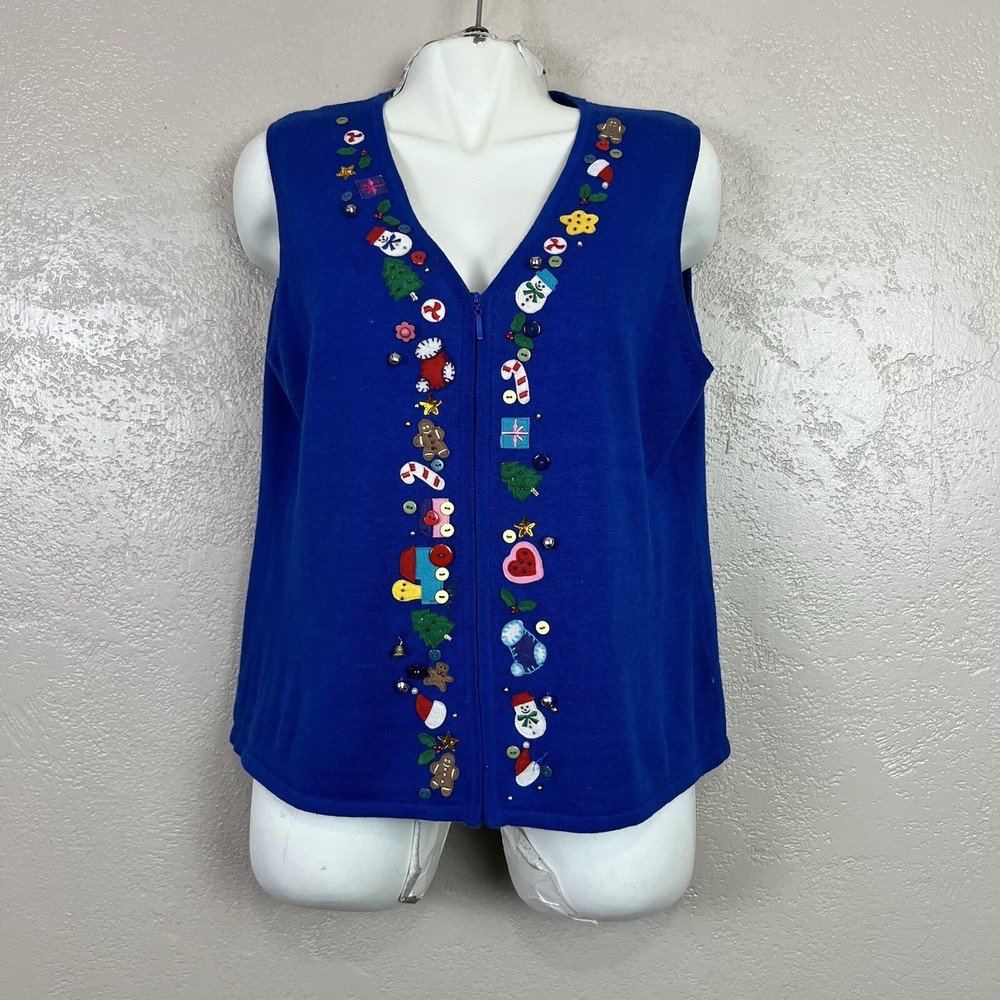 This vintage Designers Originals Studio JOY Vest features a festive holiday theme with snowmen and Christmas trees. The blue knit fabric is adorned with bells and a zipper closure. Handmade with ramie and cotton materials, this sleeveless mid-length vest is perfect for parties, casual wear, or business settings during the fall and winter seasons. Perfect for adding a touch of holiday cheer with its jingle bell accents.