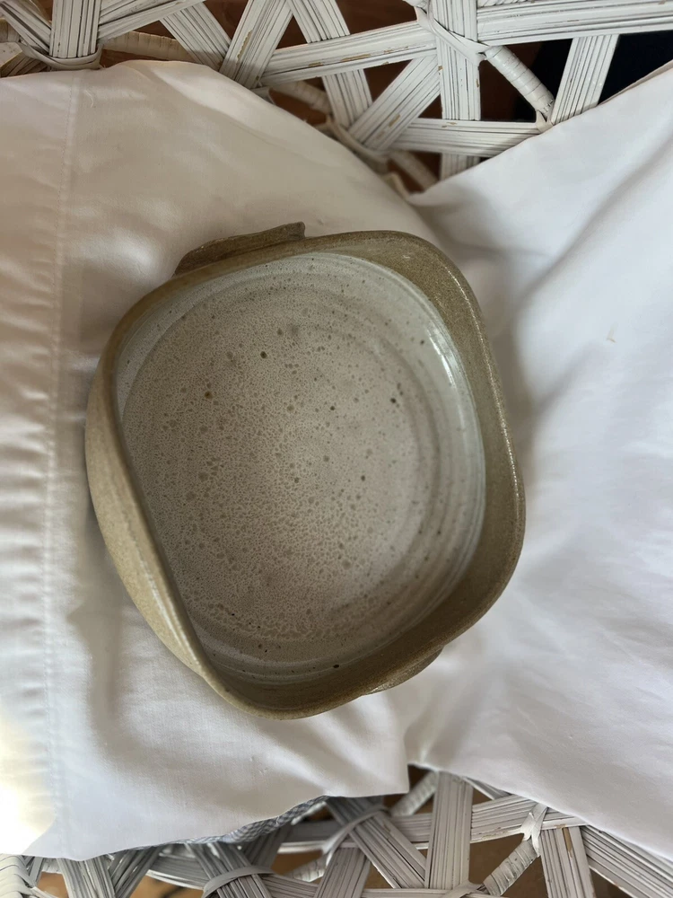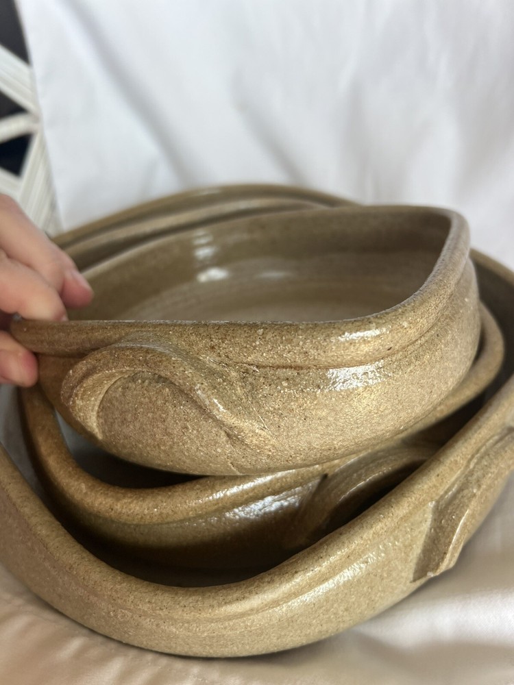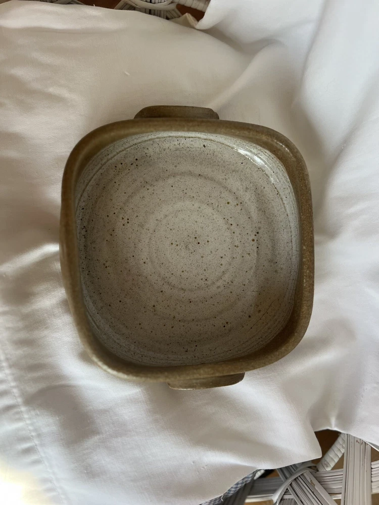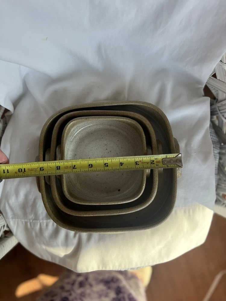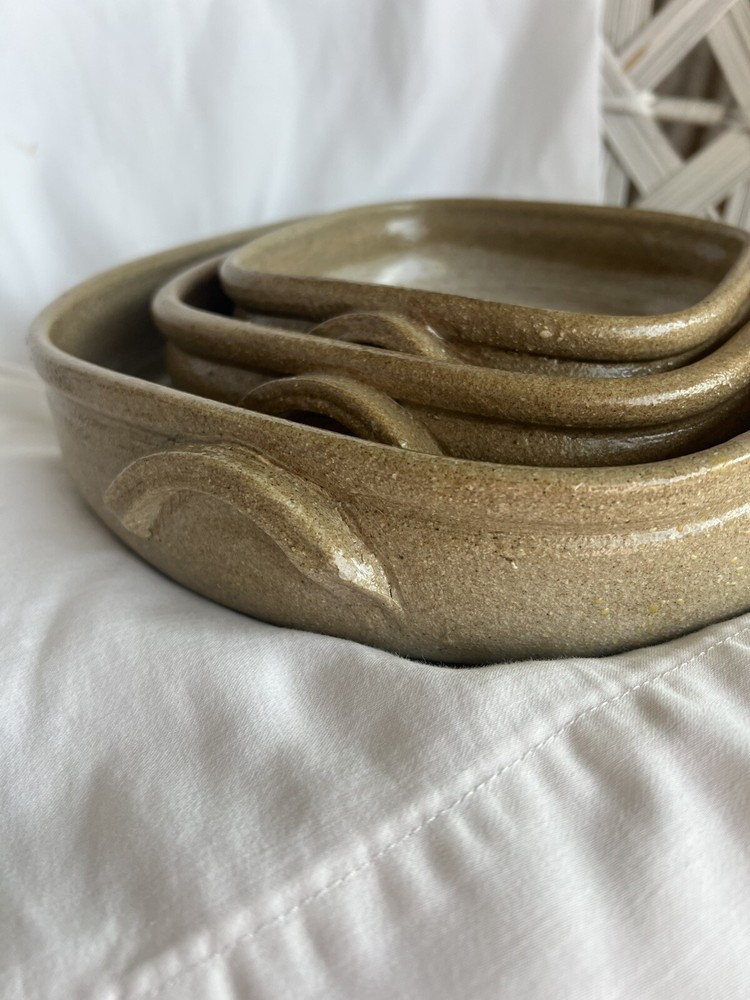 Vintage Devica Gres de Viana Portuguese Studio Art Pottery 3 Nesting Bake Dishes A set of 3 vintage studio art pottery bake dishes with beautiful speckled earthy glazes and rounded square shapes; each one with handles formed on the sides. Nest neatly into each other for storage. Vintage Handcrafted Made in Portugal Style: Organic Modern Type: Art studio pottery Material: Earthenware Manufacturer: Devica Gres de Viana Color(s): Earth tones Finish: Glazed and speckled Measurements: Bake dish A Width 6- 3/4” Length 6- 1/8” Height 2” Bake dish B Width 8” Length 8- 3/8” Height 2- 1/4” Bake dish C Width 9- 3/4” Length 10” Height 2- 1/4” Weight of complete set: 6 Lbs- 7.9 oz Disclaimer Please note that all items in my collection are pre-owned and sourced from a variety of locations, including thrift stores, yard sales, estate sales, and similar venues. While I take great care in researching and curating each piece, I am a self-taught amateur antique collector. Descriptions and attributions are based on my personal research and best knowledge, but I am still learning, and my expertise is not professional. I strive to provide detailed descriptions of each item’s condition, including any imperfections, which are either clearly noted in the description or shown in the accompanying photographs. However, vintage and antique items often show signs of age and prior use, so please review all images carefully and ask any questions before purchasing. All sales are final. If you need additional information, measurements, or photographs to make your decision, I am more than happy to assist. Thank you for your interest in my collection! I genuinely enjoy sharing these unique vintage finds and hope they bring you the same joy and excitement they’ve brought me.