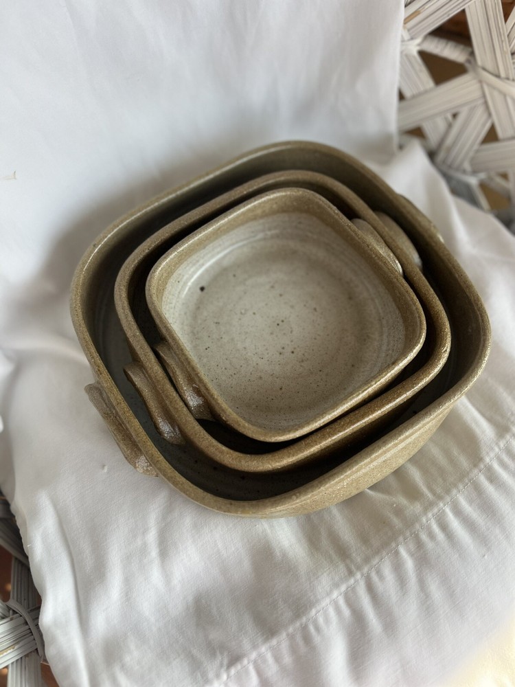 Absolutely love this set! The earthy speckled glaze gives them a warm, rustic charm, and the rounded square shape with side handles makes them both stylish and practical. They nest perfectly for easy storage, and the handcrafted quality is evident in every detail. The organic modern design fits beautifully in any kitchen, and the earthenware feels sturdy yet elegant. Perfect for baking, serving, or just displaying—such a unique find! Made in Portugal with such care, these pieces are a must-have for pottery lovers.
