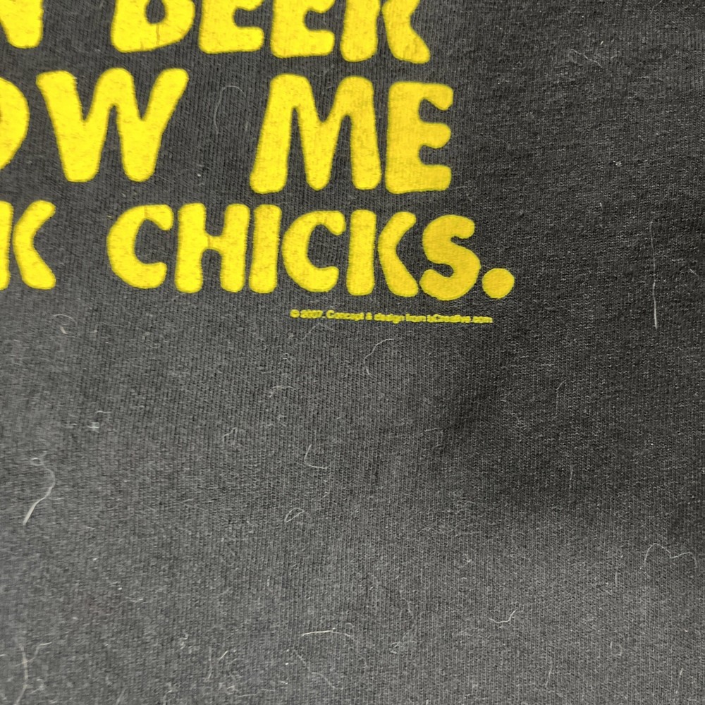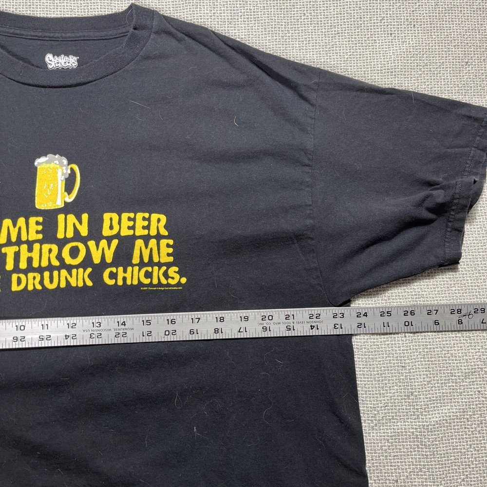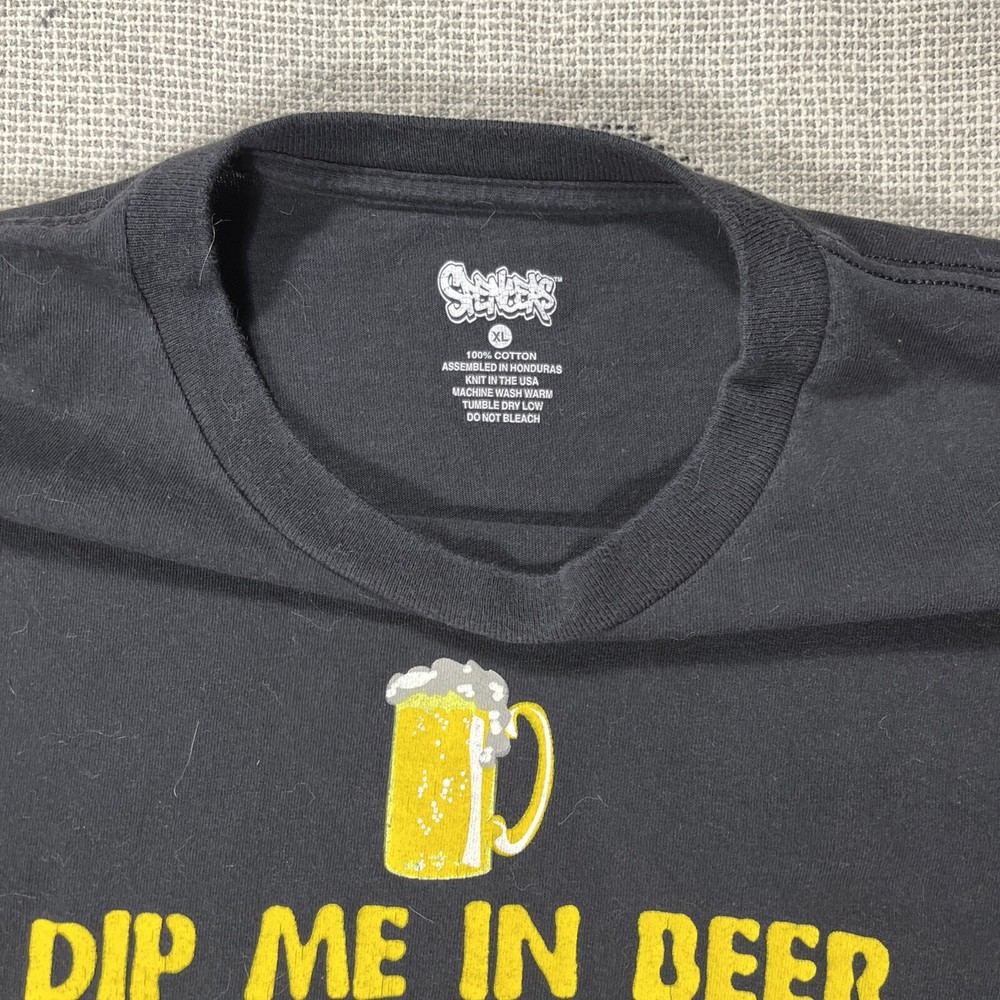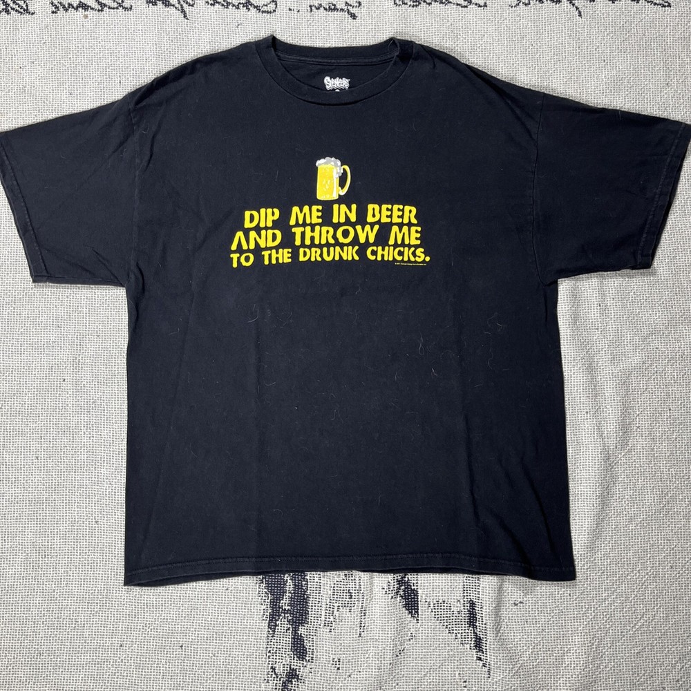 This black Spencers T-shirt is a Y2K gem with a hilarious graphic print featuring a beer character and the funny line "Dip Me In Beer And Throw Me To The Drunk Chicks." Made from comfortable cotton knit fabric, this short sleeve shirt has a regular fit and a crew neckline. It's perfect for any season and can be easily cared for with machine washing. The shirt is a size XL and is not personalized or handmade. It's a great addition to any men's clothing collection and is sure to turn heads with its unique design.