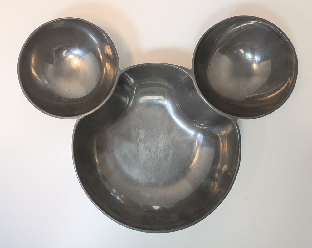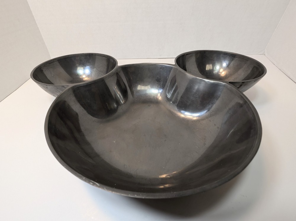 Awesome, aluminum Mickey Mouse, chip and dip, aluminum bowl. Bowl is substantial, weight over 1 1/2 lbs and measuring 14 1/2" wide. Bowl is stamped with Disney on the back....