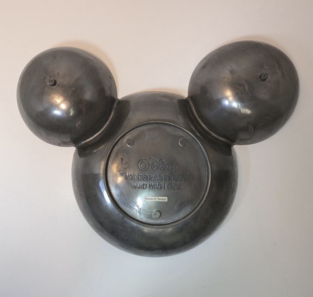 Awesome, aluminum Mickey Mouse, chip and dip, aluminum bowl. Bowl is substantial, weight over 1 1/2 lbs and measuring 14 1/2" wide. Bowl is stamped with Disney on the back.