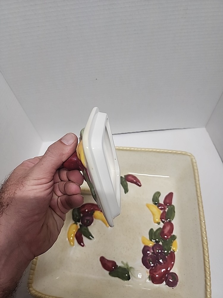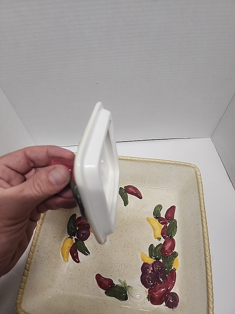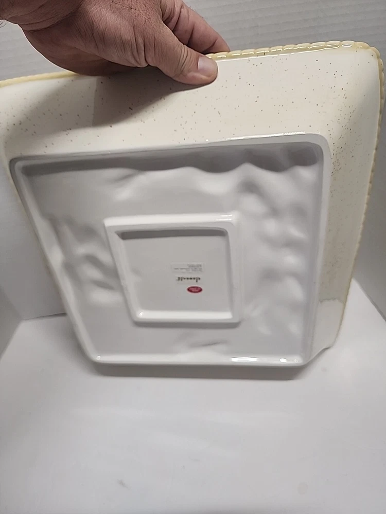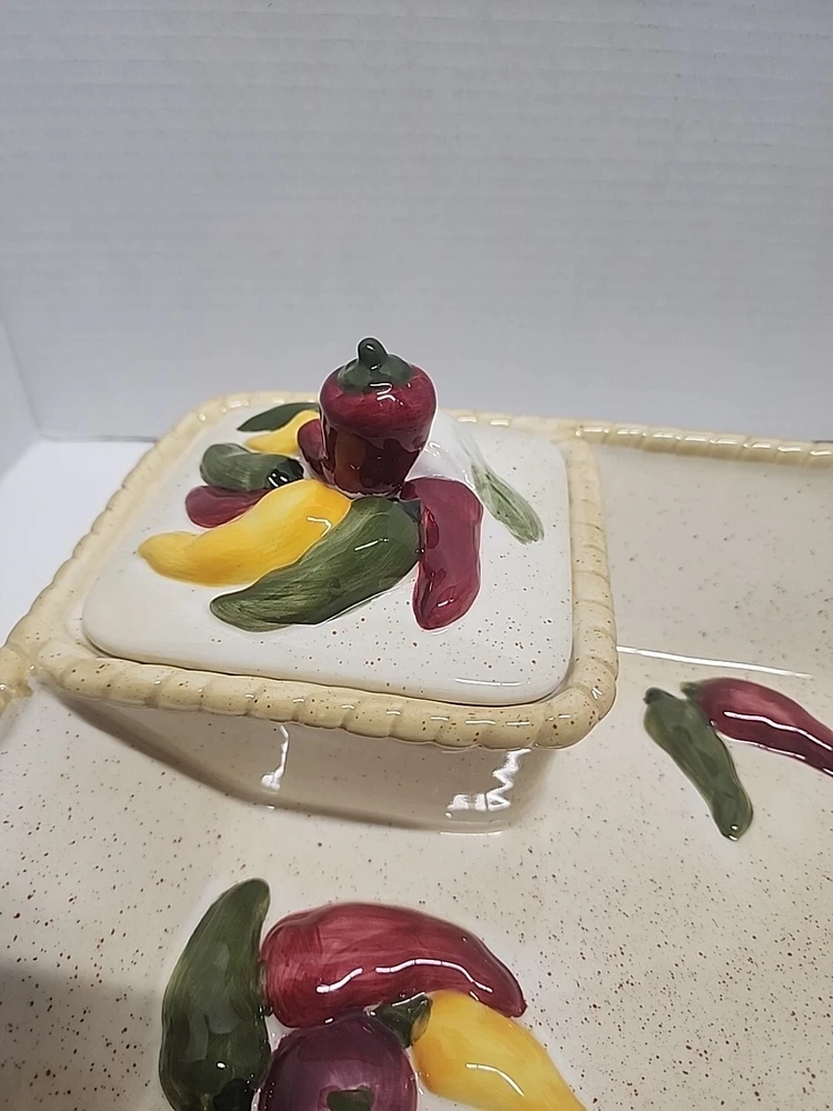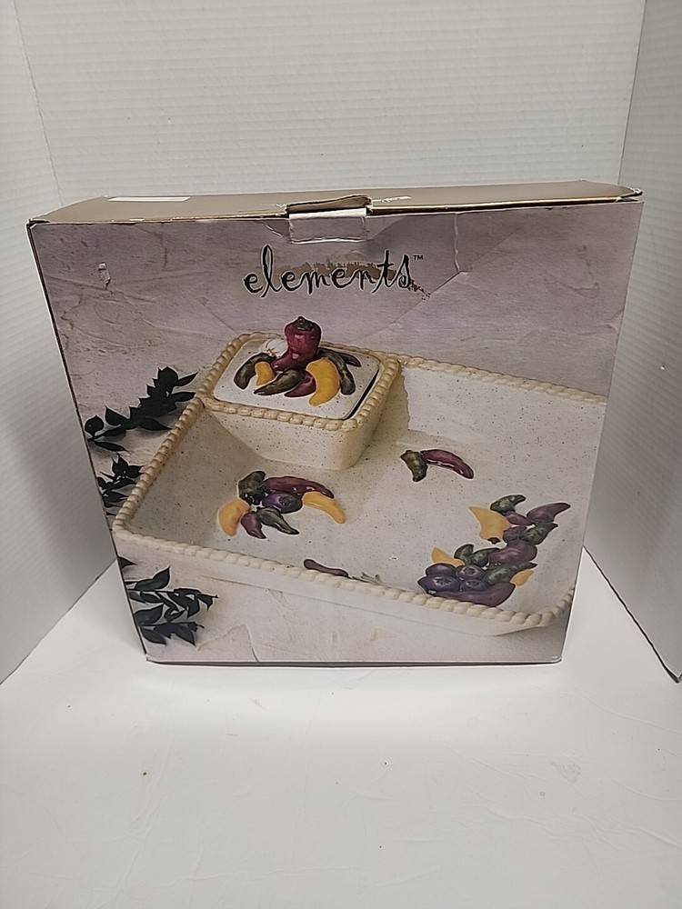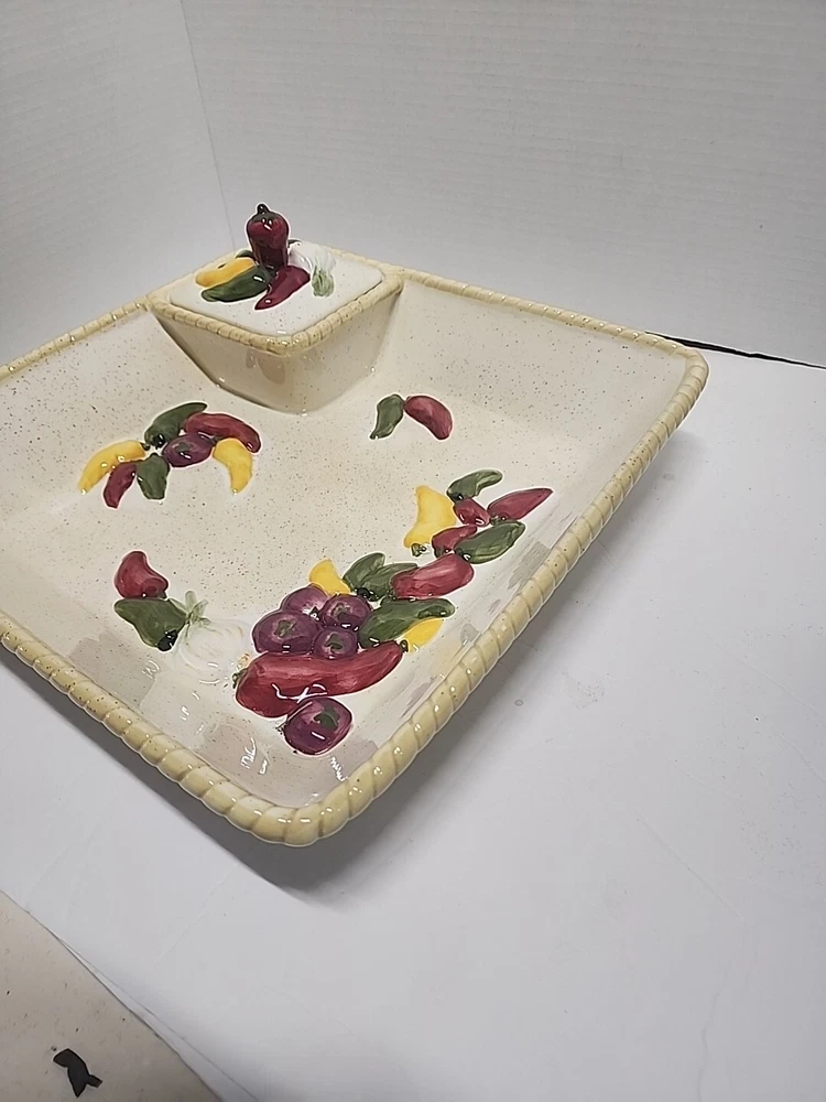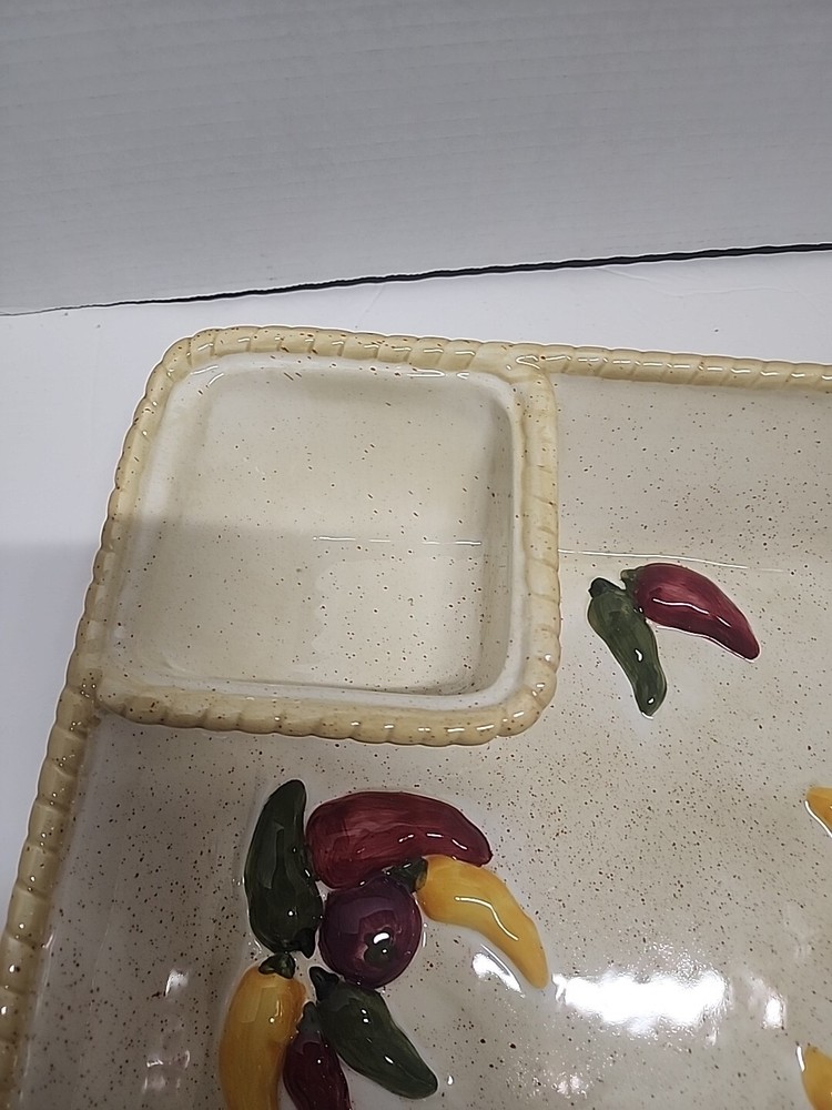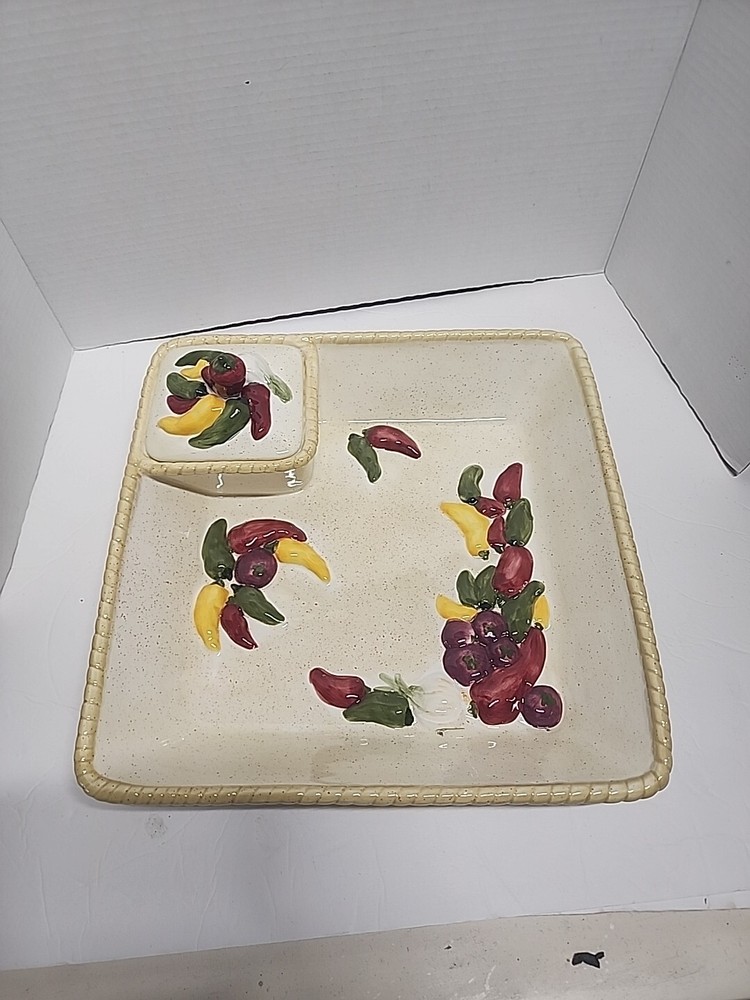 Add some spice to your dining table with this vintage serving bowl from ELEMENTS. Featuring a colorful hot chili pepper pattern and a square shape, this bowl is perfect for serving chips, dips, or other small dishes. Measuring 13.5 inches in diameter and 3 inches in depth, it is made of ceramic material and is suitable for all occasions. This two-piece set includes a chip and a dip, both adorned with the same chili pepper theme. The bowl is easy to clean, but please note that it is hand wash only. The model number is 204343, and the style is unknown. This serving bowl is a great addition to any kitchen or dining set and is sure to impress your guests. Great shape.