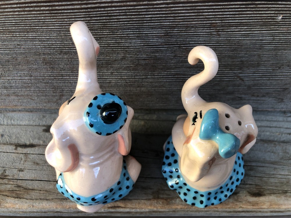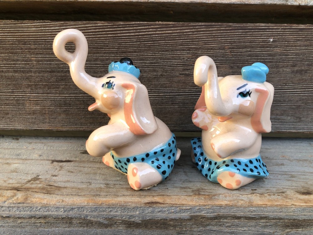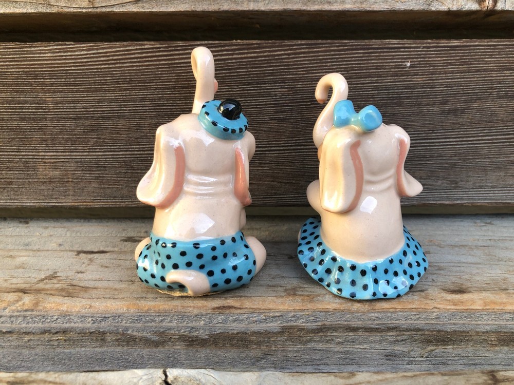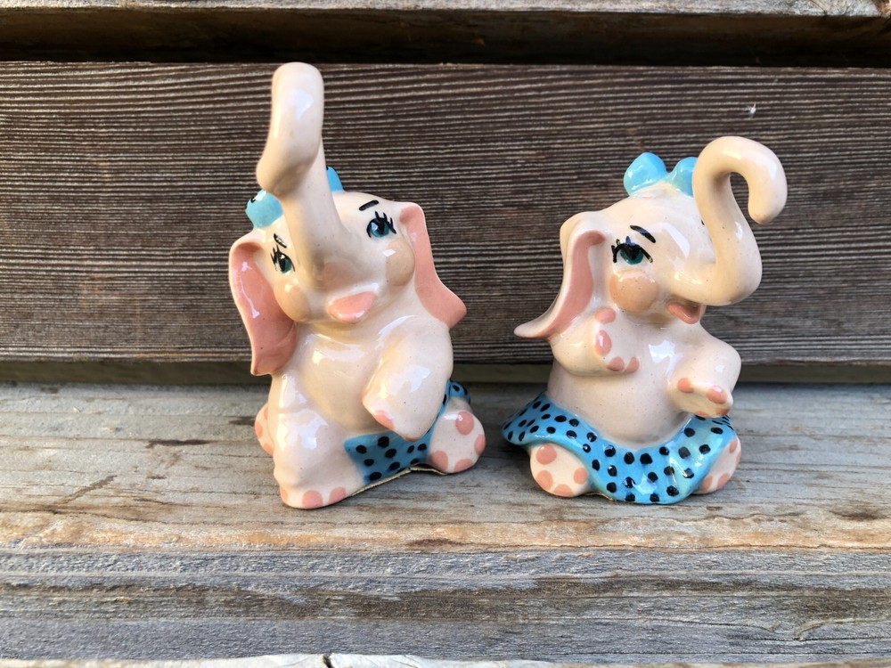 Vintage Ceramic Art Studio, Madison Wisconsin (in operation from 1942-1956) Elephant, boy & girl, Salt and Pepper Shakers. With Trunk they measure about 4" tall. No chips or cracks. There is a pink tape on the bottom. See photos for details.