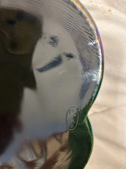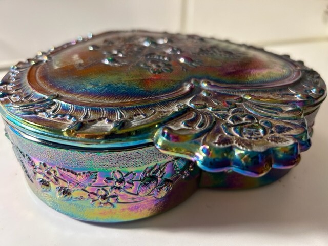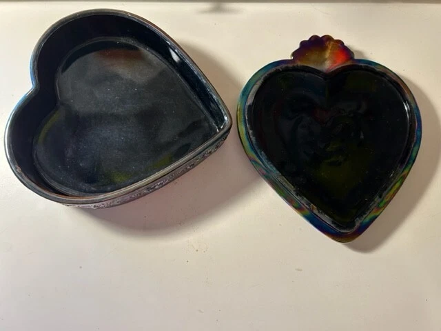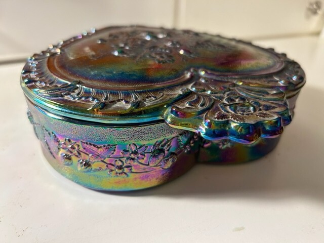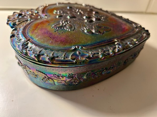 Add a touch of vintage charm to your kitchen with this beautiful Fenton candy dish. The heart-shaped glass dish features a stunning amethyst carnival glass production style that is sure to catch the eye. The dish comes with a lid and is perfect for storing your favorite treats or serving up sweets to guests. The dish is a part of the Fenton product line and is made from high-quality glass material. It features one compartment and is adorned with a multicolor design that adds a unique and playful touch. This set includes two pieces and would make a wonderful addition to any glassware collection. Measures 2"H x 7.5" Dia, 8.5"L. 8#.