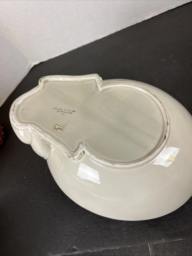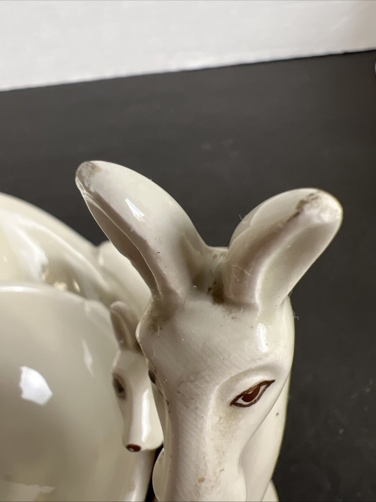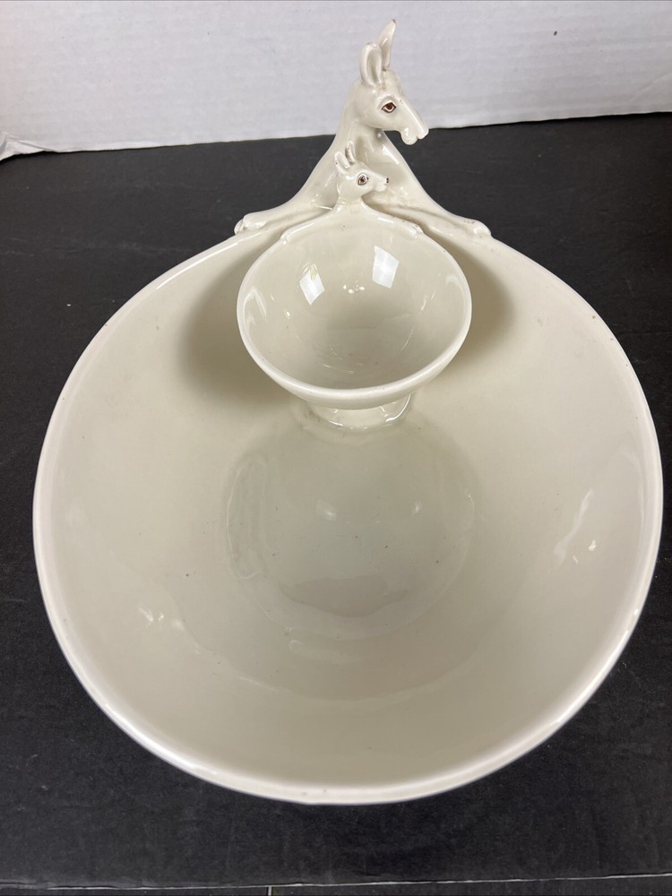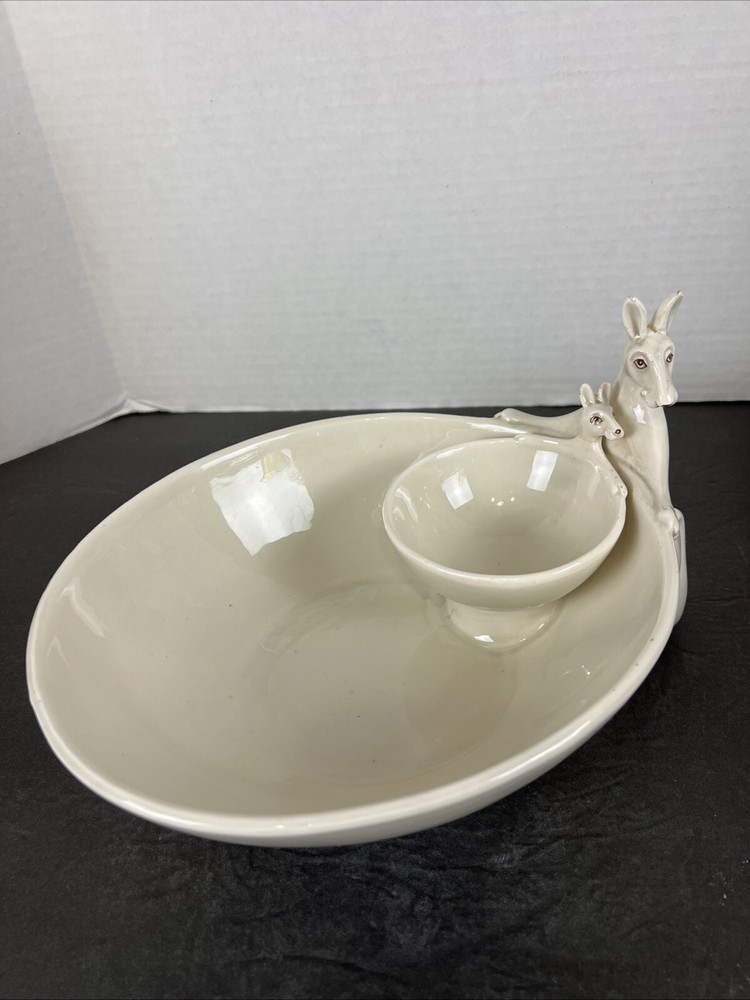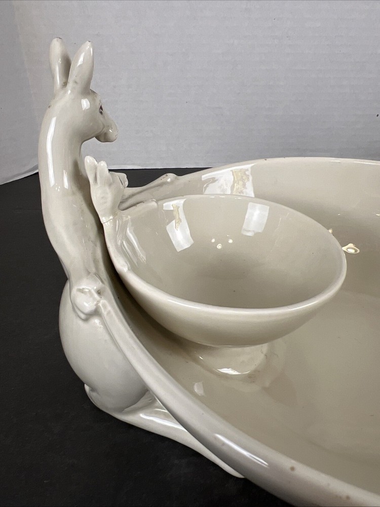 The bowl is in excellent condition with no chips cracks or crazing. The only issue to point out is the larger kangaroo has roughness to the tip of each ear. Sort of like a glazed flake. Measures approximately 11 inches long by 9 inches wide by 6 inches tall to top of kangaroo ear.