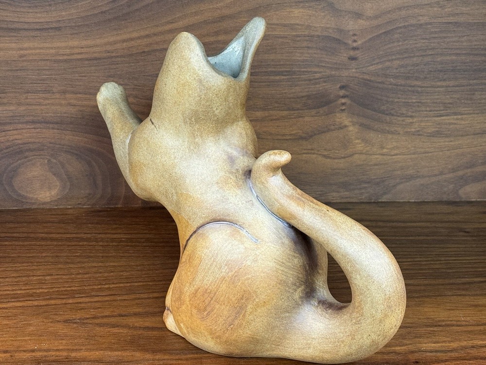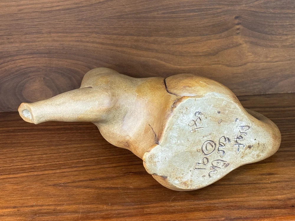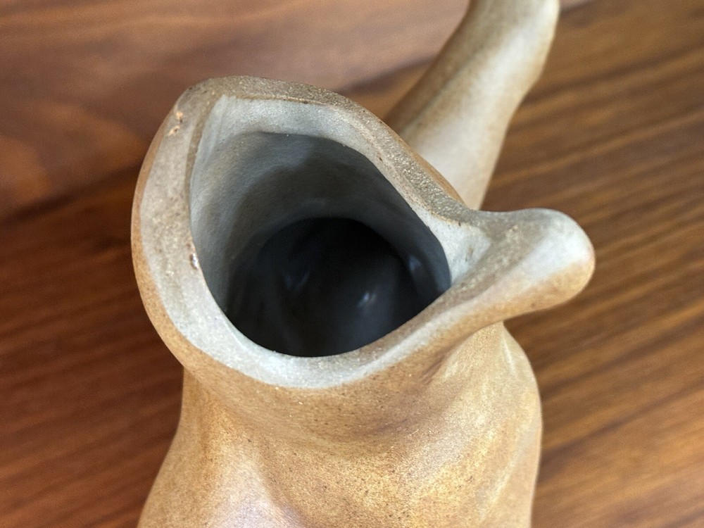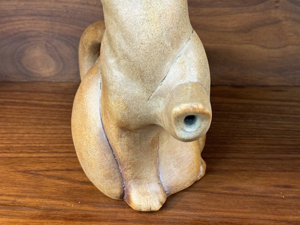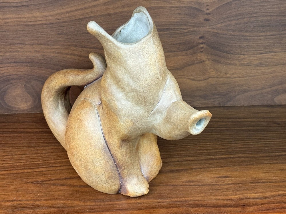 Vintage flat earth pottery figural elephant studio pottery pitcher. Signed on base and dated 1991. Measures 8 tall, 4" wide and 10" long from spout handle. Excellent condition with no issues.