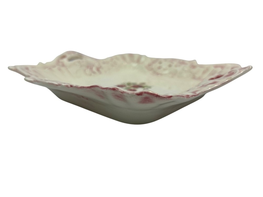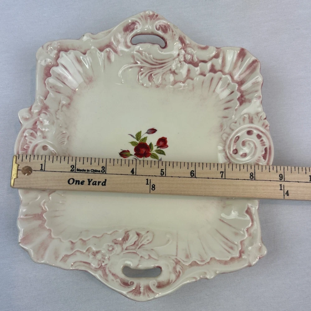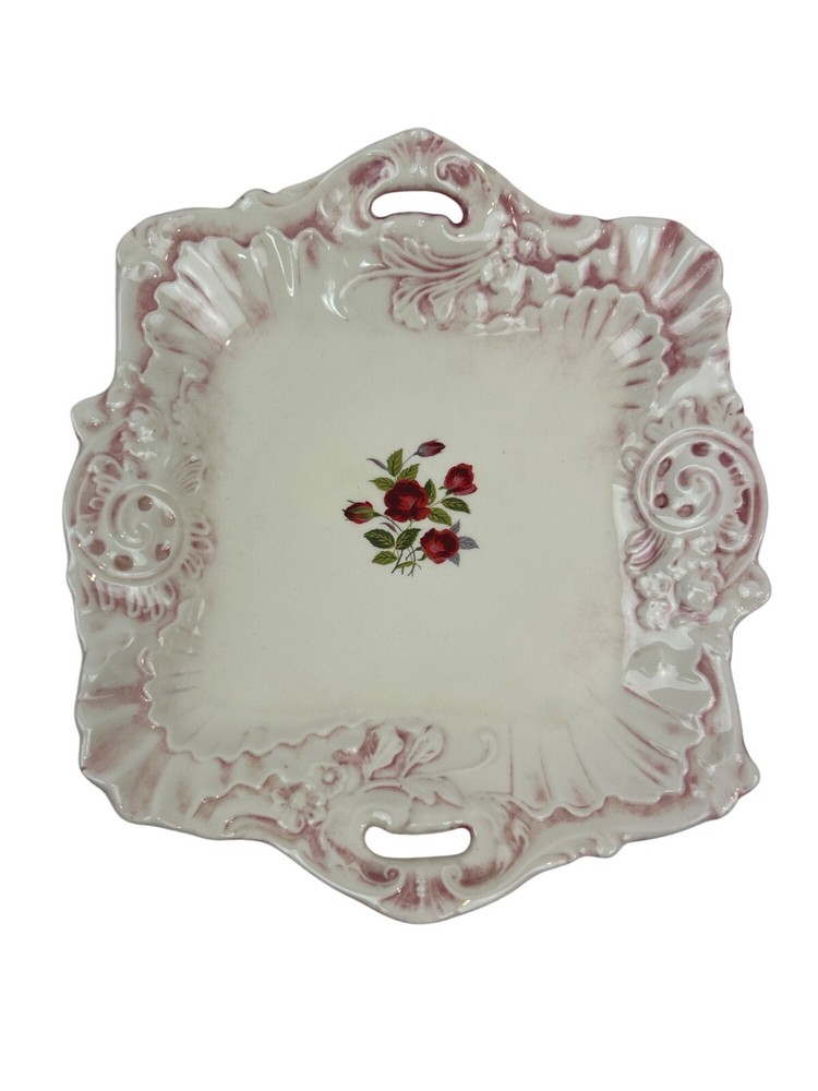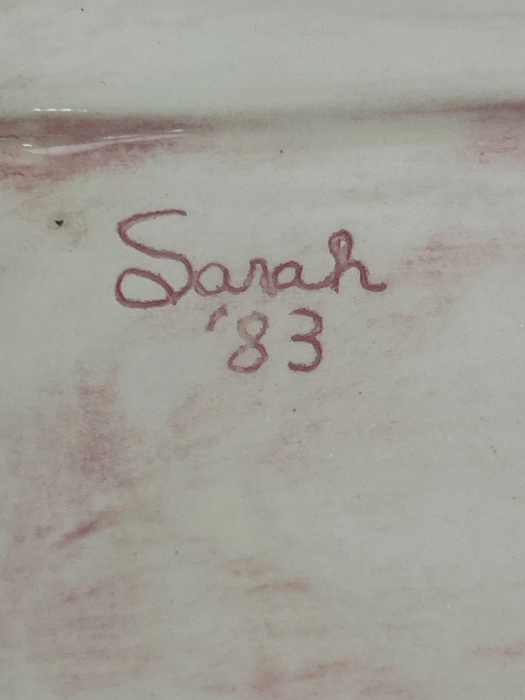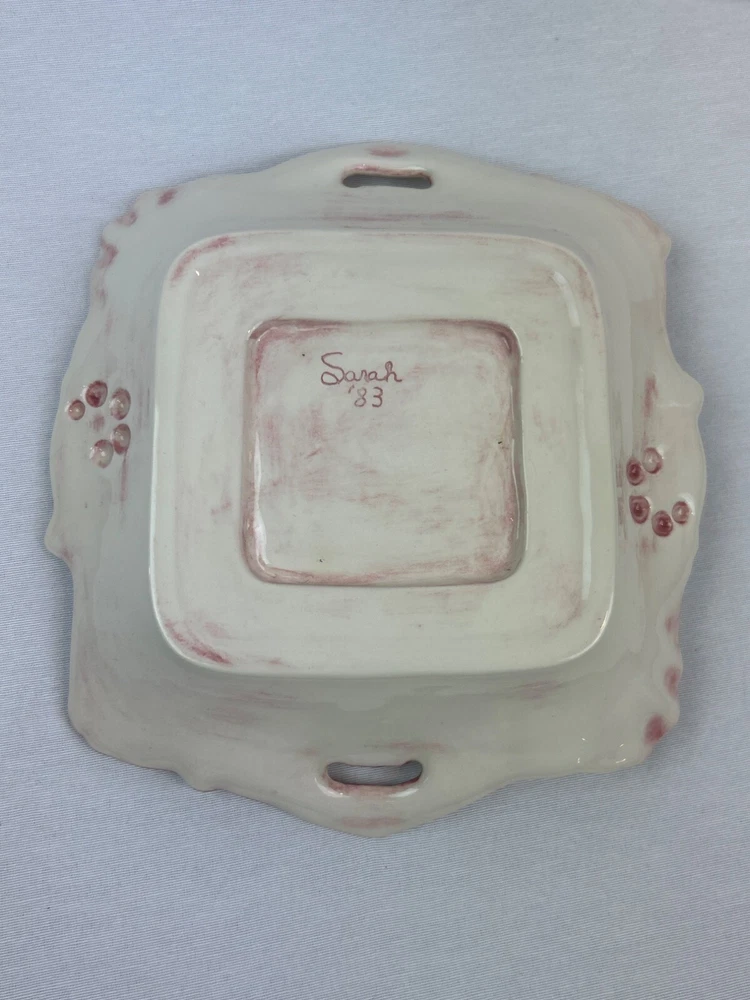 This vintage ceramic dish features a beautiful floral design with pink accents. The square shape and handle openings enhance its aesthetic appeal. • Square shape with intricate details • Central red rose floral design • Decorative handle openings • Pink and white color scheme • Vintage ceramic studio art piece signed "Sarah '83" Some minor use wear, a small chip or two, not very noticeable, no major flaws that I can find. Please see images for details. All the items in our store are properly cleaned according to eBay's policies.