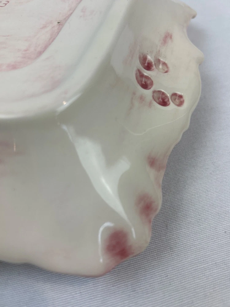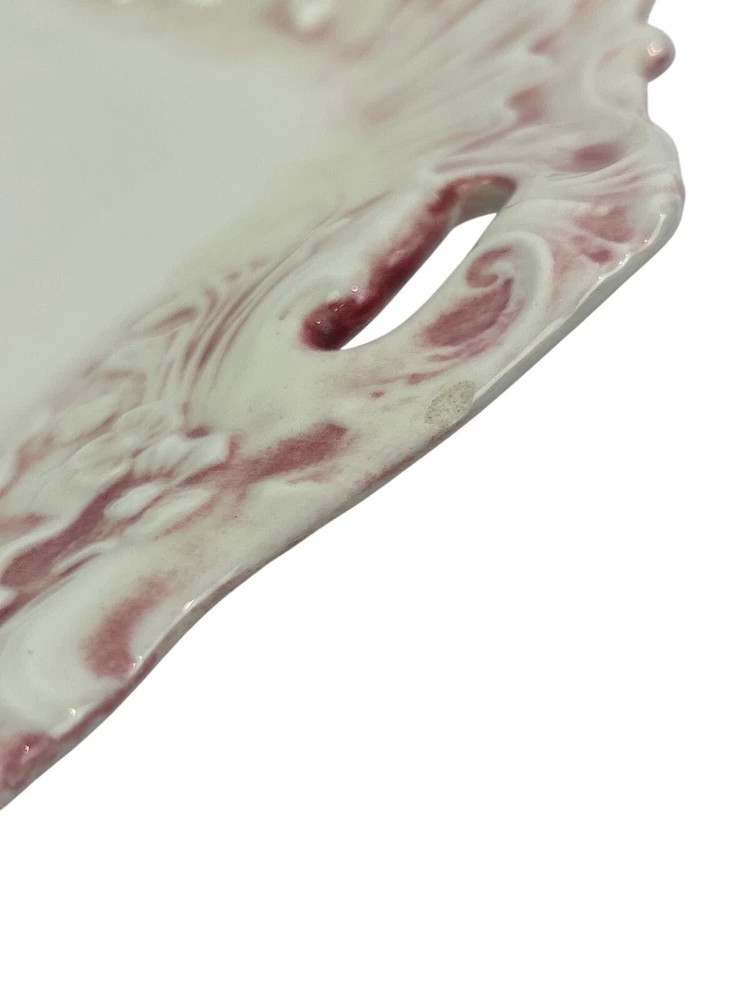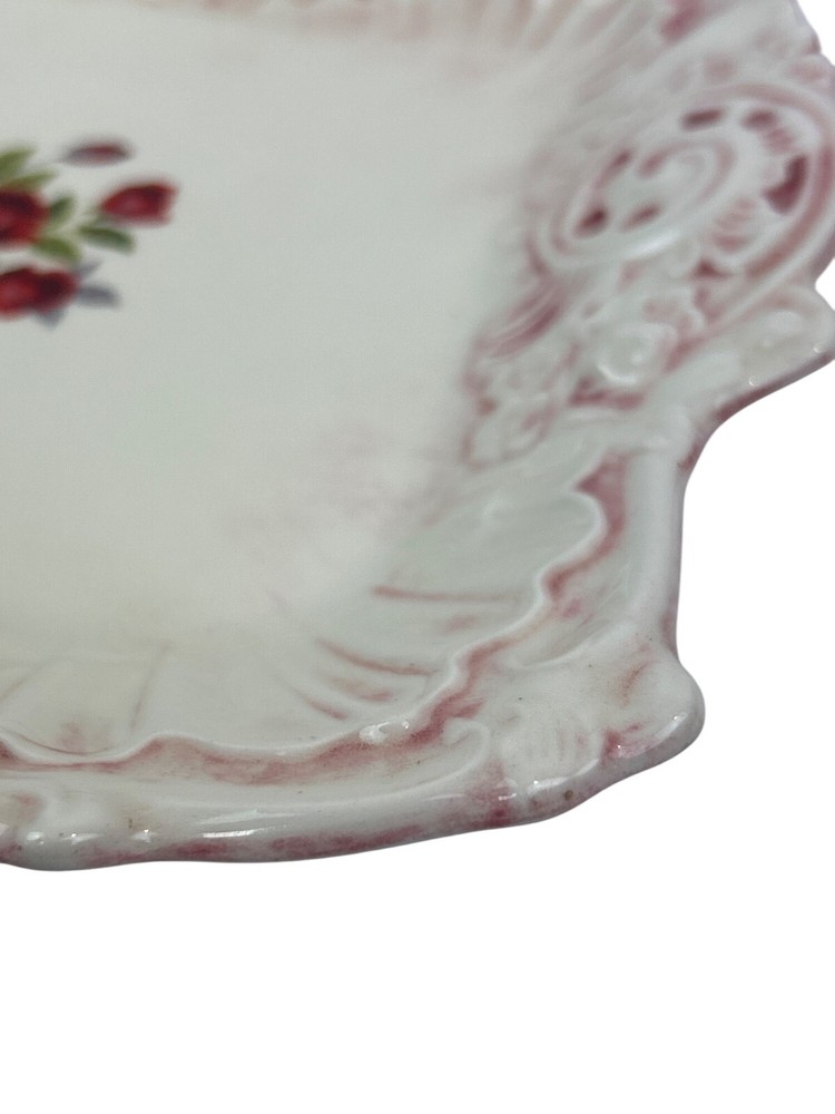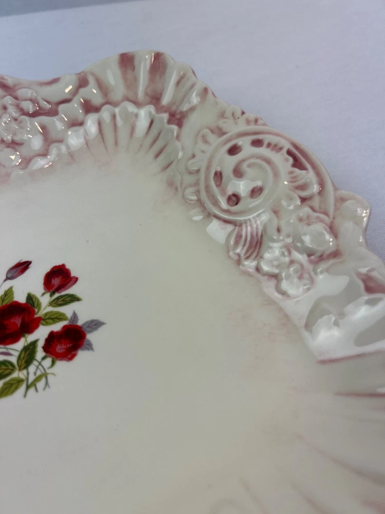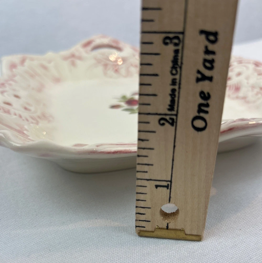 This vintage ceramic dish features a beautiful floral design with pink accents. The square shape and handle openings enhance its aesthetic appeal. • Square shape with intricate details • Central red rose floral design • Decorative handle openings • Pink and white color scheme • Vintage ceramic studio art piece signed "Sarah '83" Some minor use wear, a small chip or two, not very noticeable, no major flaws that I can find. Please see images for details. All the items in our store are properly cleaned according to eBay's policies.