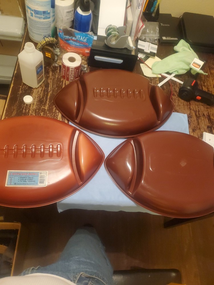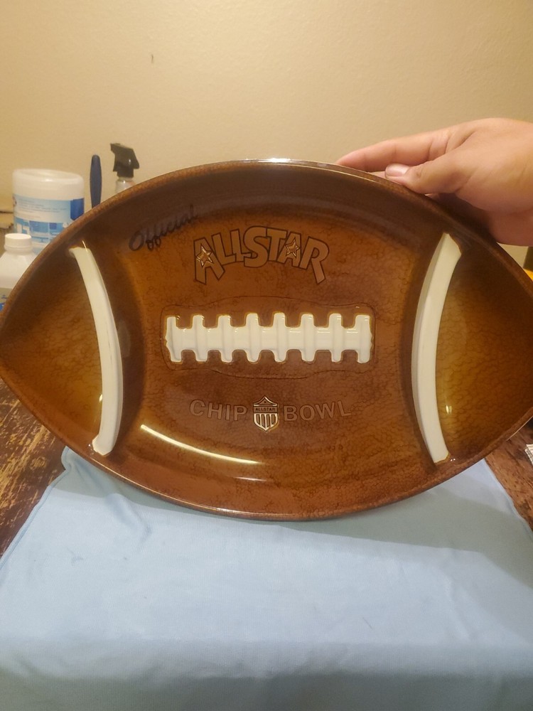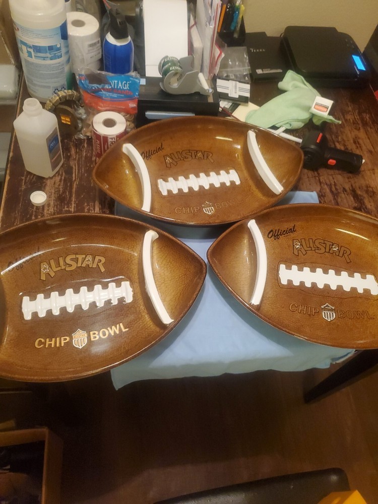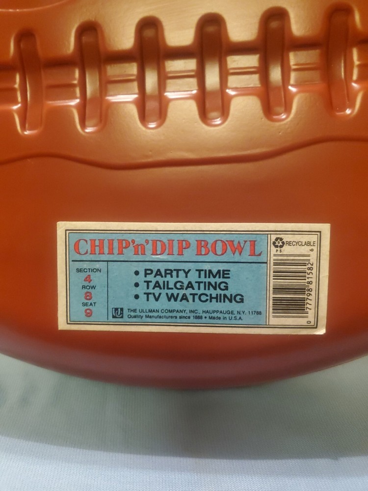 Get ready for your next game day with this vintage Football Chip 'N' Dip Party Trays from The Ullman Company. Made of glossy plastic, this large serving tray has three compartments for your favorite snacks and is shaped like a football. Perfect for sports occasions and man caves, this unique tray features a brown football pattern and has easy-to-fill features. The set includes three trays, each with a number of compartments for your convenience. Don't miss this chance to bring some football fun to your next party! Comes with 1 new tray never used and 2 used trays. Selling them cheaper for that reason.