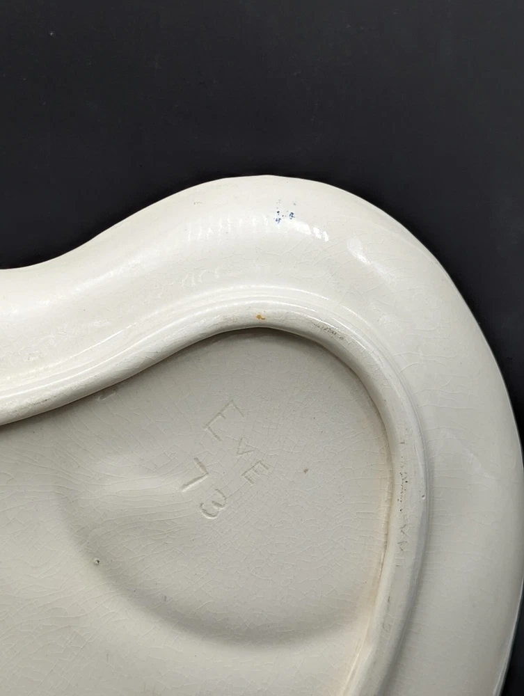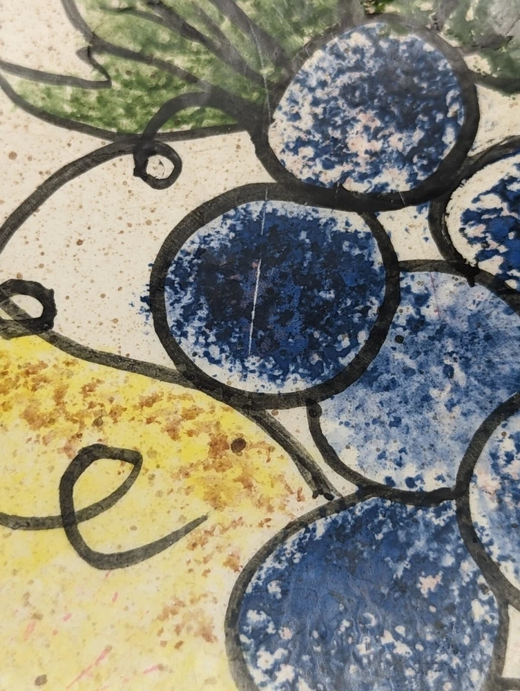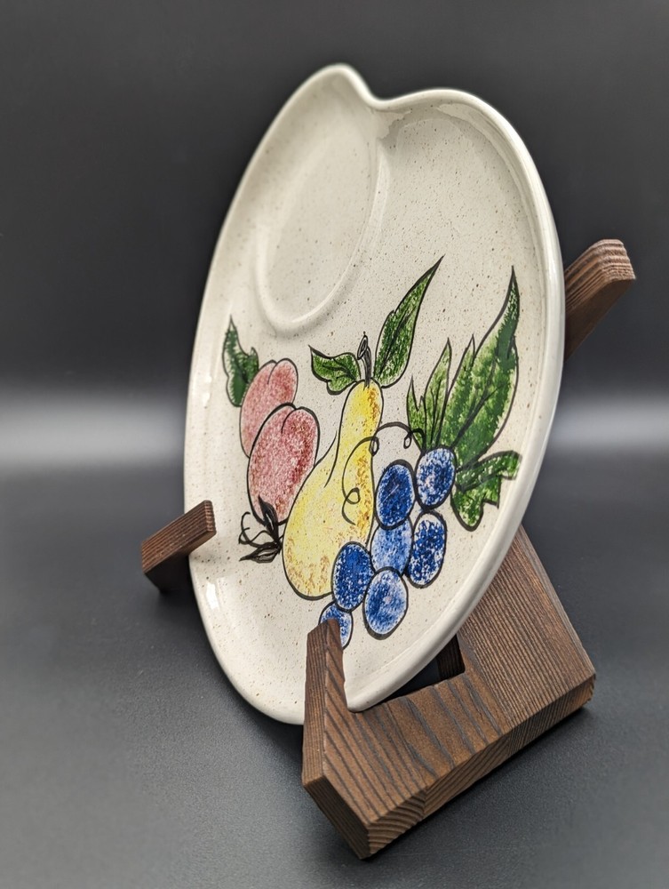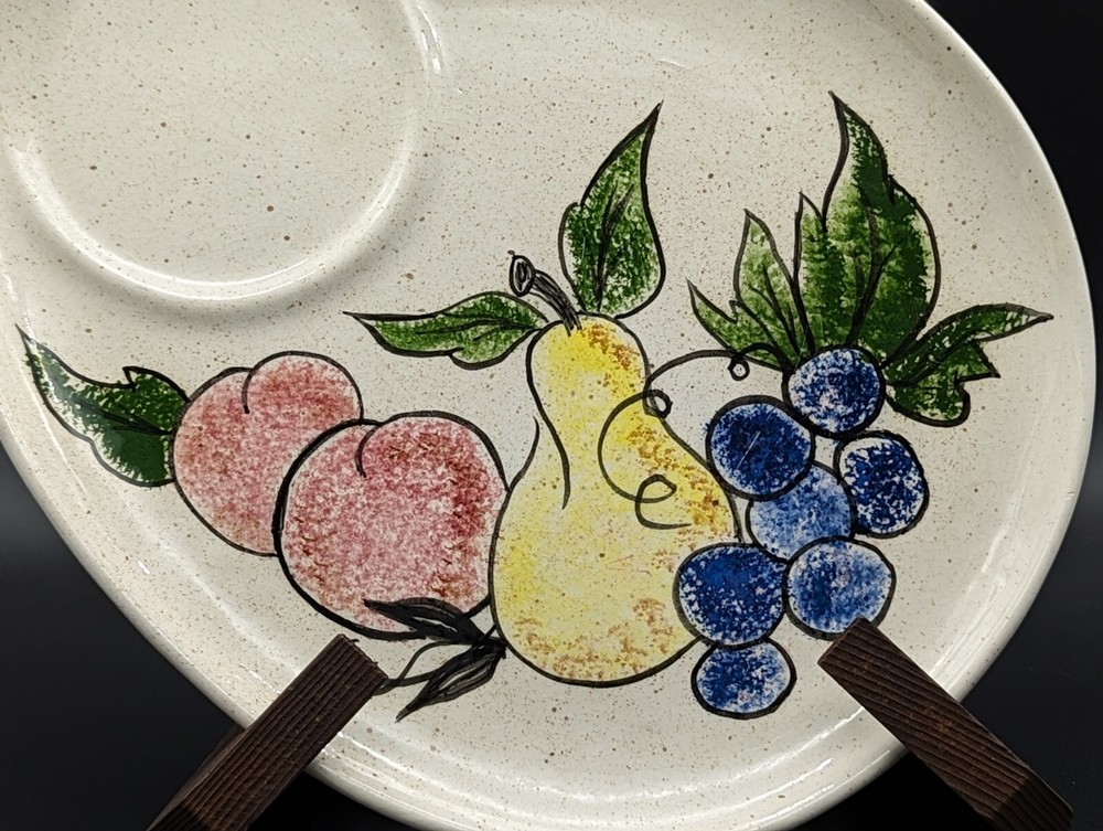 Vintage Fruit Hand Painted Kidney Shaped Studio Pottery Serving Platter Signed Condition: Excellent Origin: Unknown Brand: Signed "EVE 73" Product Description Delight your guests and elevate your table setting with this unique, vintage studio pottery serving platter. This charming piece features a large kidney-shaped design, adorned with a vibrant fruit pattern that includes apples, pears, and blueberries, set against a speckled natural background. Perfect for any collector or as a functional piece in your dining collection. Details: Color : Speckled beige with blue, red, yellow and green Pattern : Fruit (peaches, blueberries & a pear) Material : Ceramic Dimensions : Approximately 10.75 inches by 8.75 inches Shipping : Items will be carefully packaged and shipped via USPS Ground Advantage. Returns : Returns are accepted within 14 days of purchase, provided the items are returned in the same condition as sent. Buyer pays return shipping. Note : Please keep in mind that this is an authentic vintage item, and minor signs of wear are to be expected. Pl ease examine the photos for a closer look at the condition, and do not hesitate to reach out for more information or additional images before making your purchase. Thank you for stopping by and check out our other listings if you love vintage!