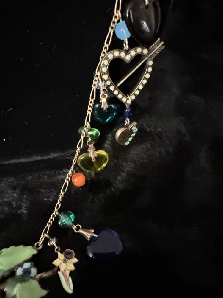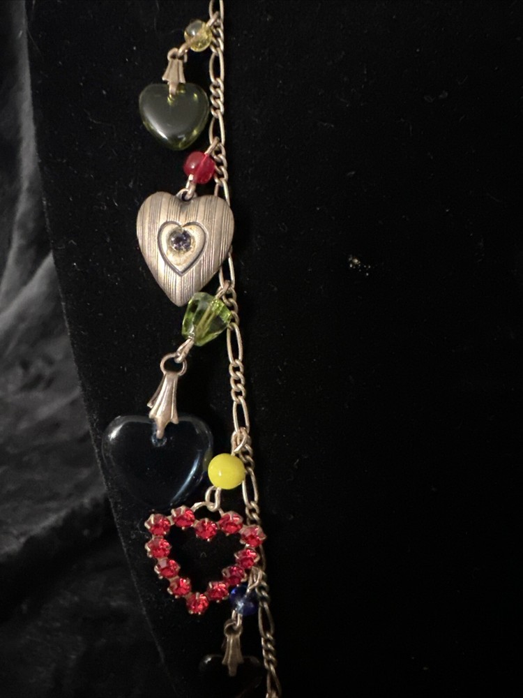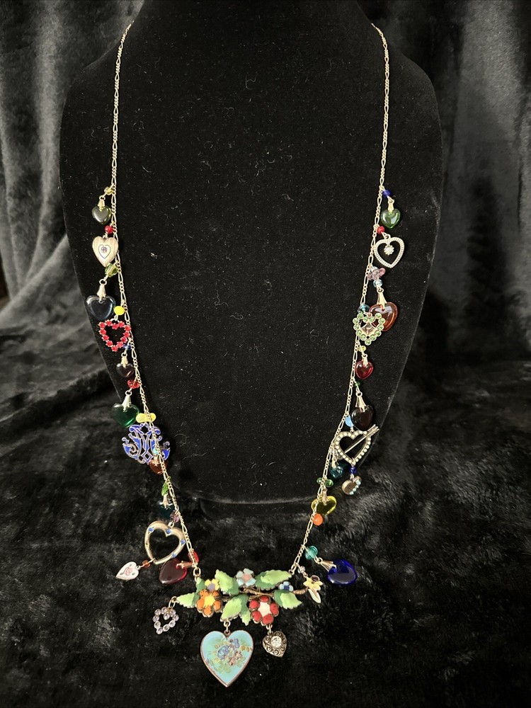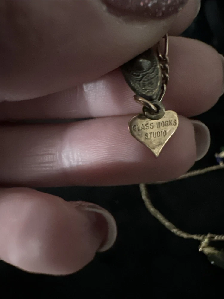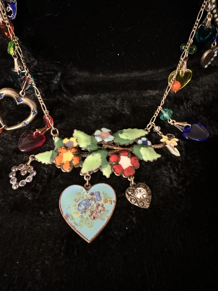 Add a touch of vintage charm to your outfit with this stunning necklace from Glass Works Studio. The colorful glass hearts and enamel detailing make it a perfect statement piece, while the brass chain adds a touch of elegance. The necklace measures 38 inches in length and features a charming heart-shaped pendant. Ideal for those who love unique and vintage jewelry, this necklace is perfect for any occasion.