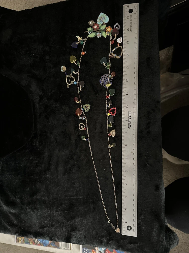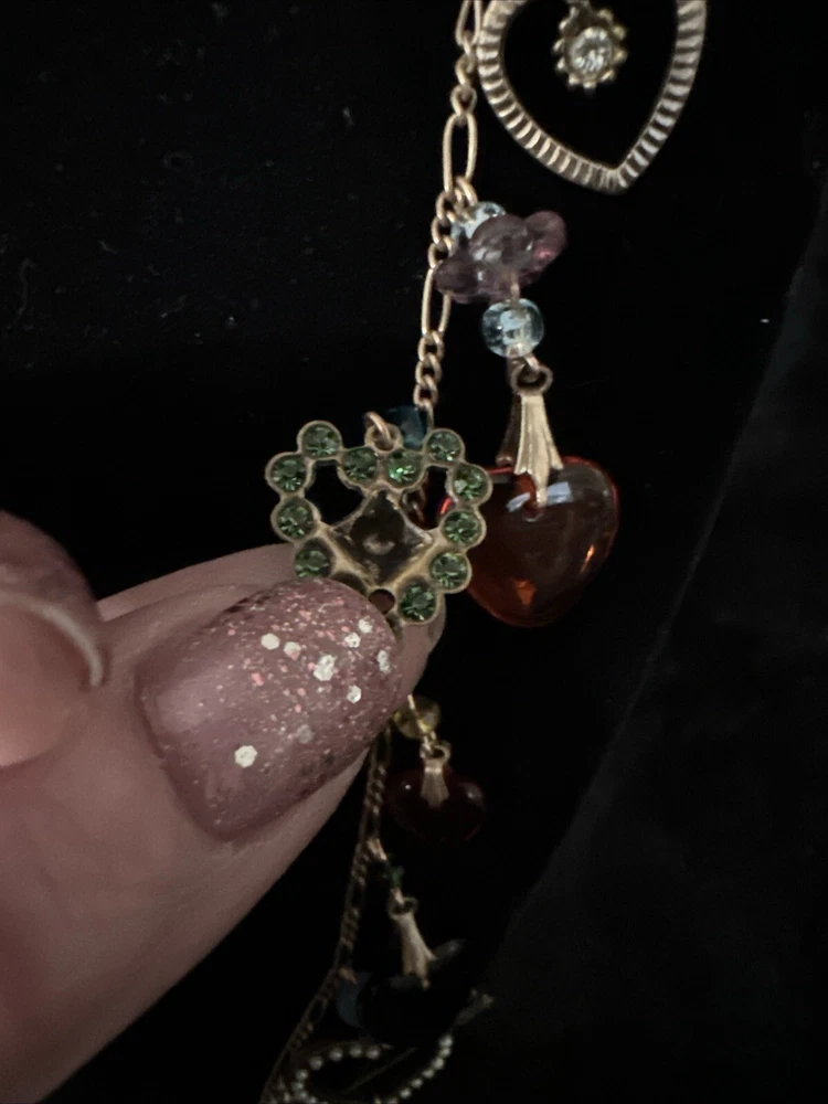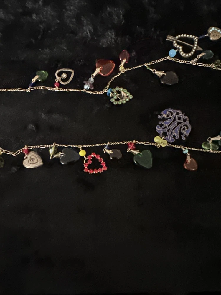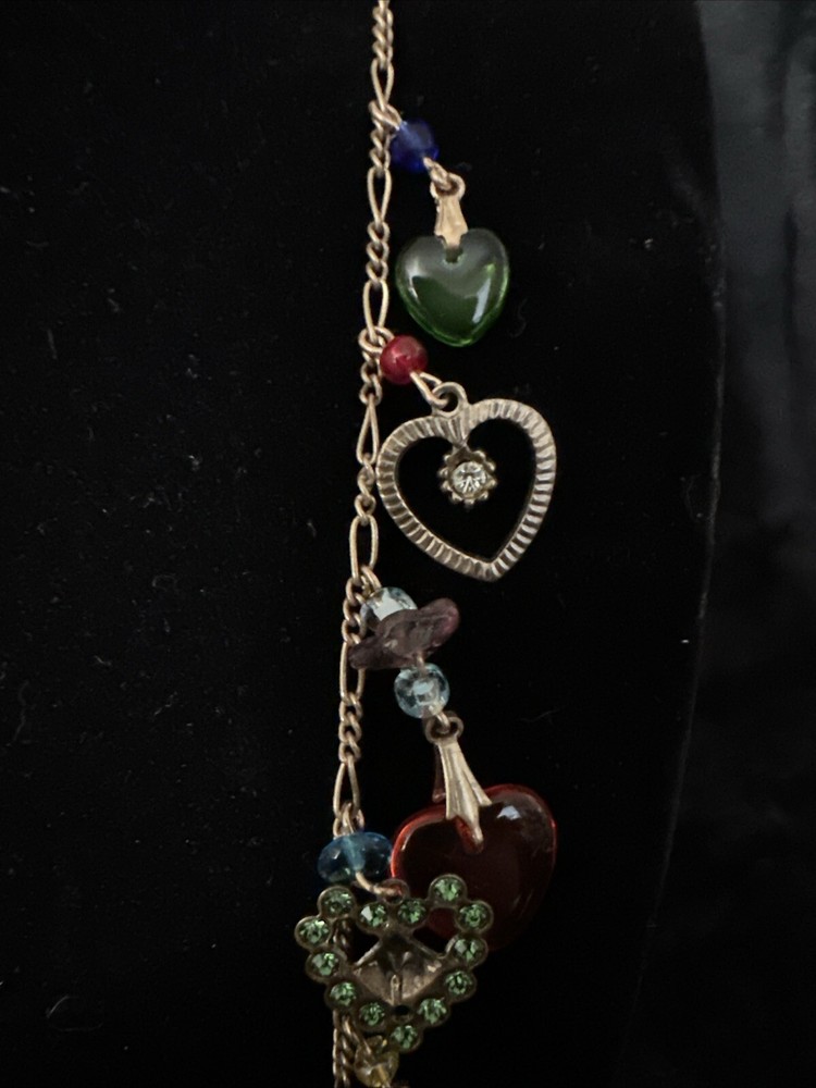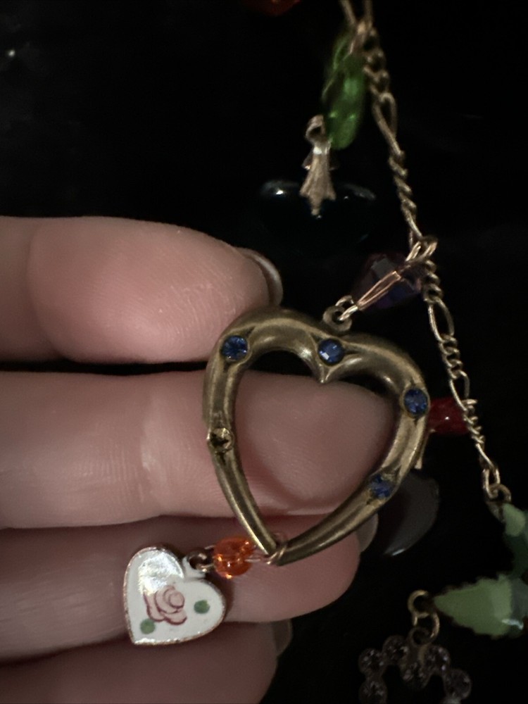 Add a touch of vintage charm to your outfit with this stunning necklace from Glass Works Studio. The colorful glass hearts and enamel detailing make it a perfect statement piece, while the brass chain adds a touch of elegance. The necklace measures 38 inches in length and features a charming heart-shaped pendant. Ideal for those who love unique and vintage jewelry, this necklace is perfect for any occasion.