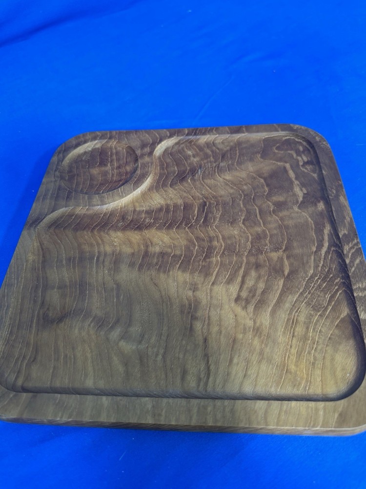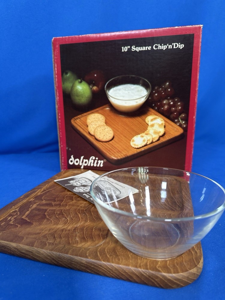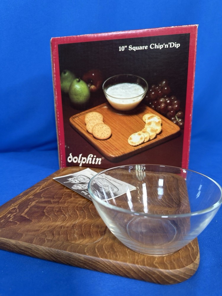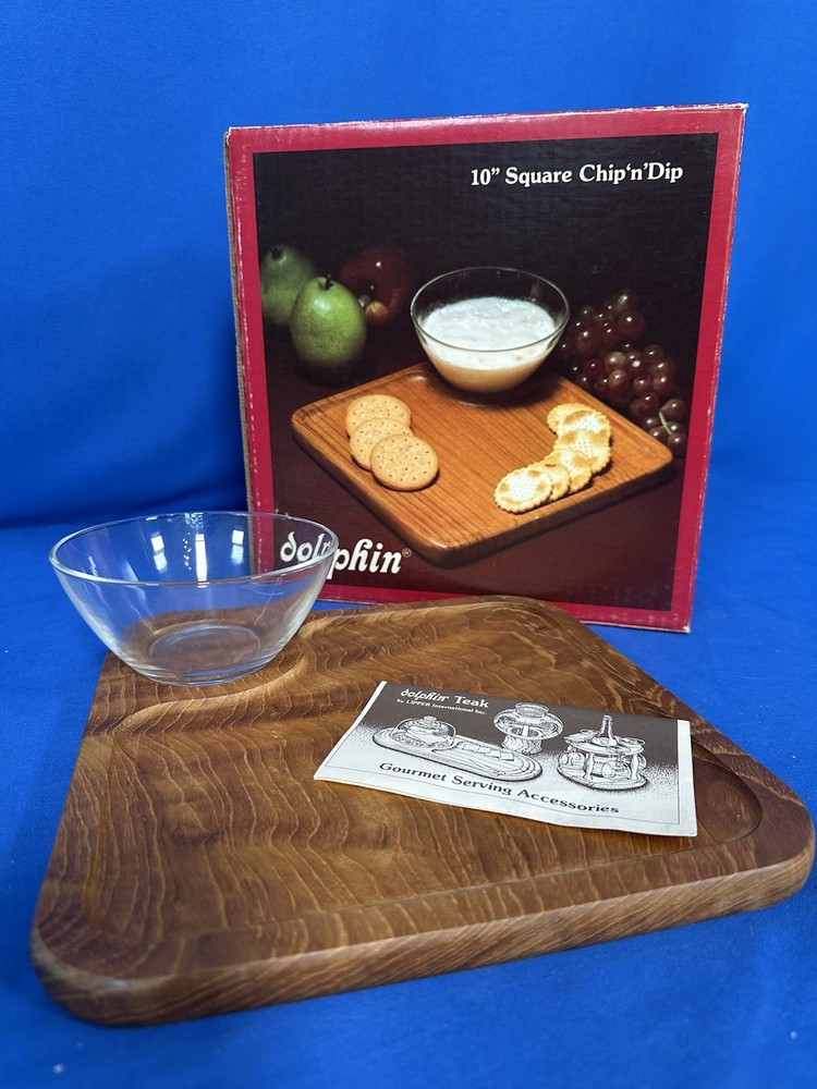10 inch solid teak, wood serving board with glass dip bowl This Vintage Genuine Solid Teakwood Serving Tray with Glass Dip Bowl is a stylish and practical addition to any dining set. Made from high-quality teakwood with a teakwood grain pattern, this large square tray features a shiny glass bowl for dipping sauces or oils. The set is custom bundled and has never been used, making it a unique and authentic piece for your home decor. The Dolphin brand ensures quality, and the tray is easy to clean with a wash by hand. Made in Thailand, this serving tray adds a touch of elegance to your dining experience.