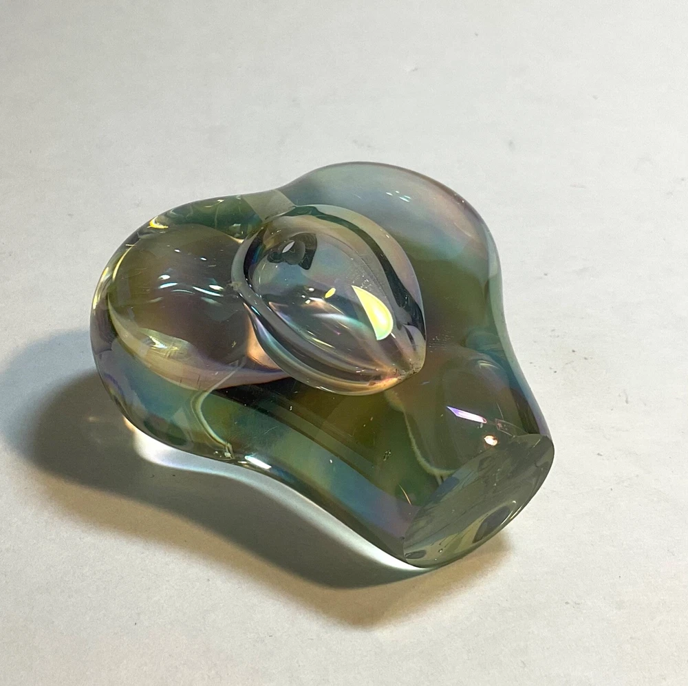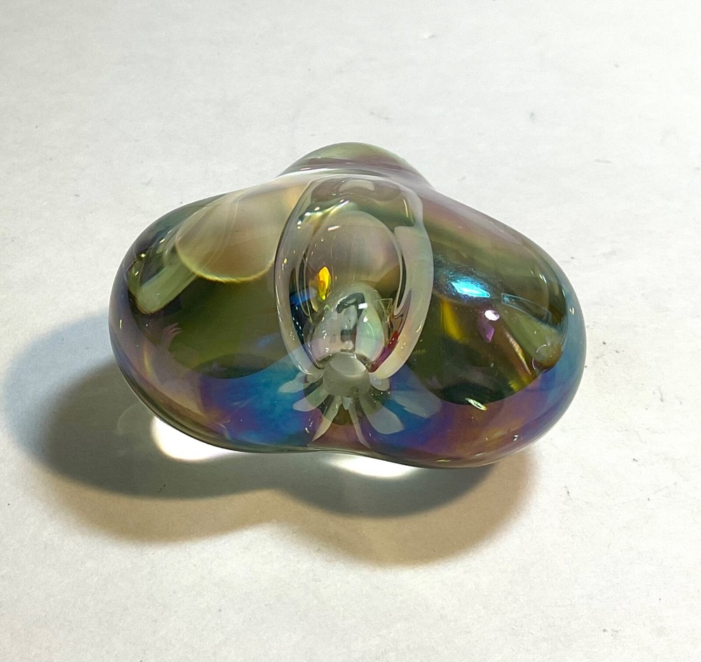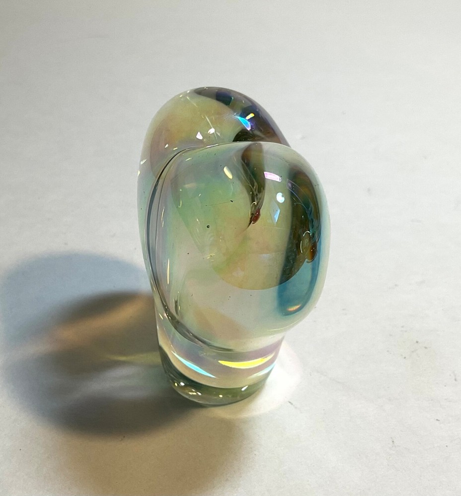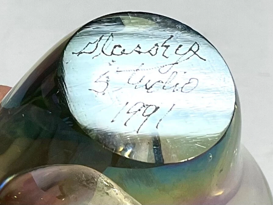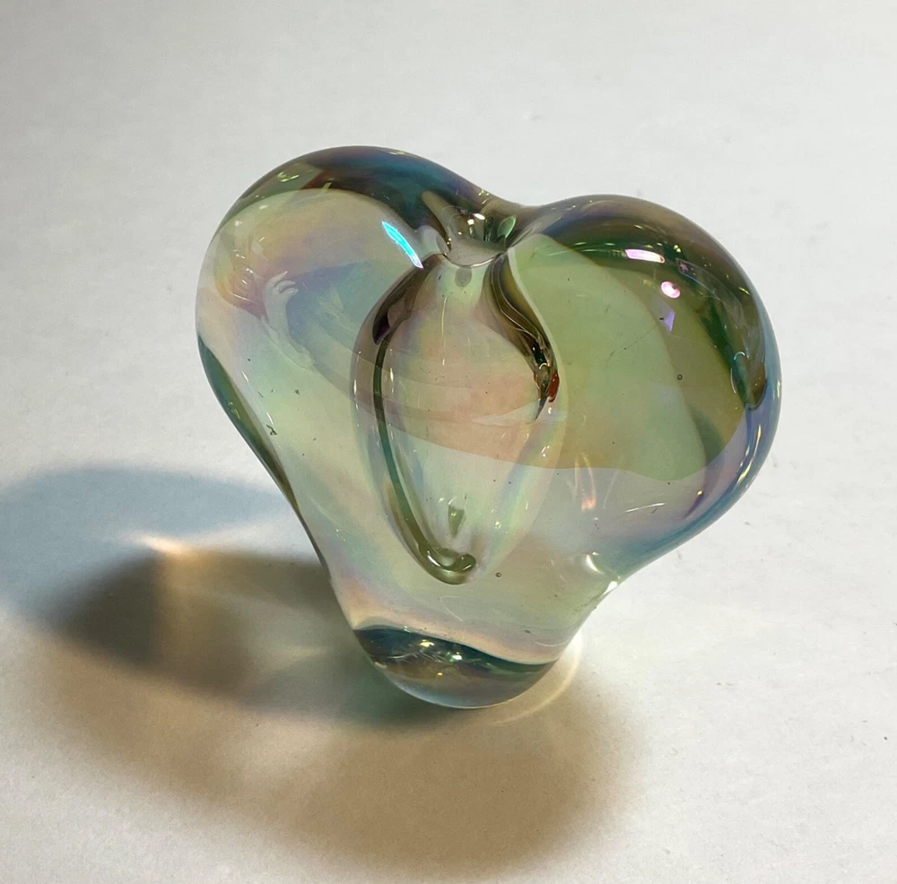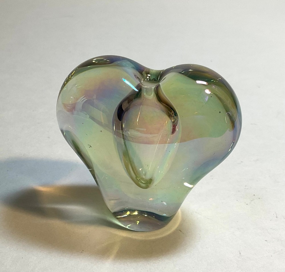 Lovely Vintage Glass Eye Studios Heart Shaped Perfume Bottle with a few small scratches and missing stopper. It measures 2 1/2 inches tall and wide. It is a nice green iridescent color that picks up light and purple.