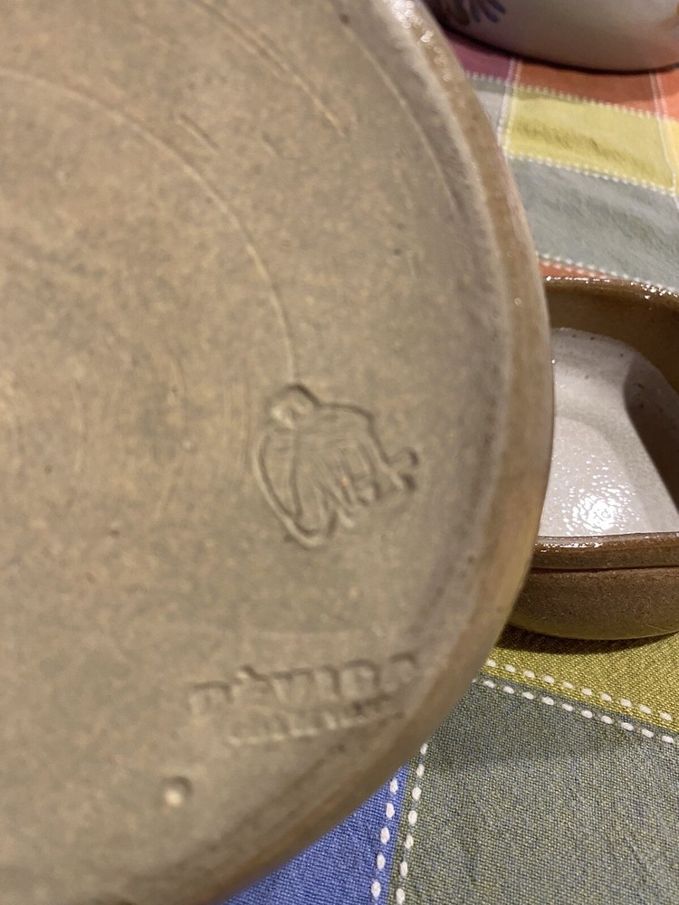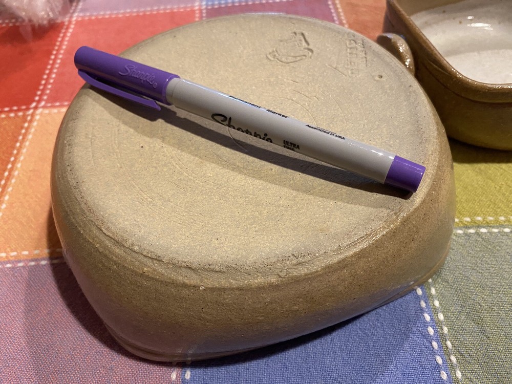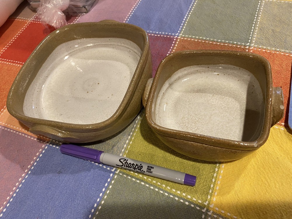 Vintage Gres de Viana Portuguese Studio Art Pottery 2 Nesting Bake Dishes. Used, I suppose. But in cupboard for years. Part of my sister’s estate. ***Has a slight small imperfection, chip, as shown in picture. *** Great looking small pottery dishes. Good for the upcoming holiday gatherings for small items. Marked on bottom with pottery mark. Size is shown by example (pen in pics)