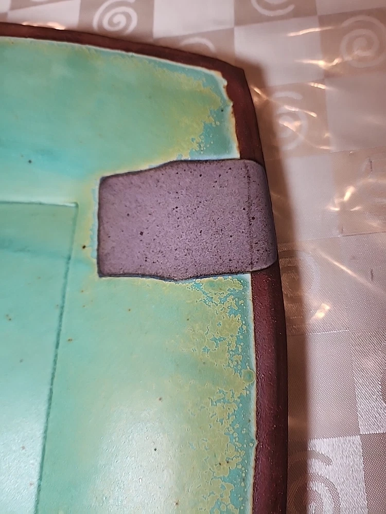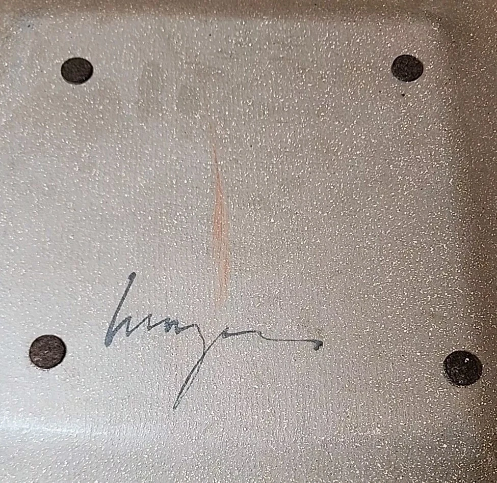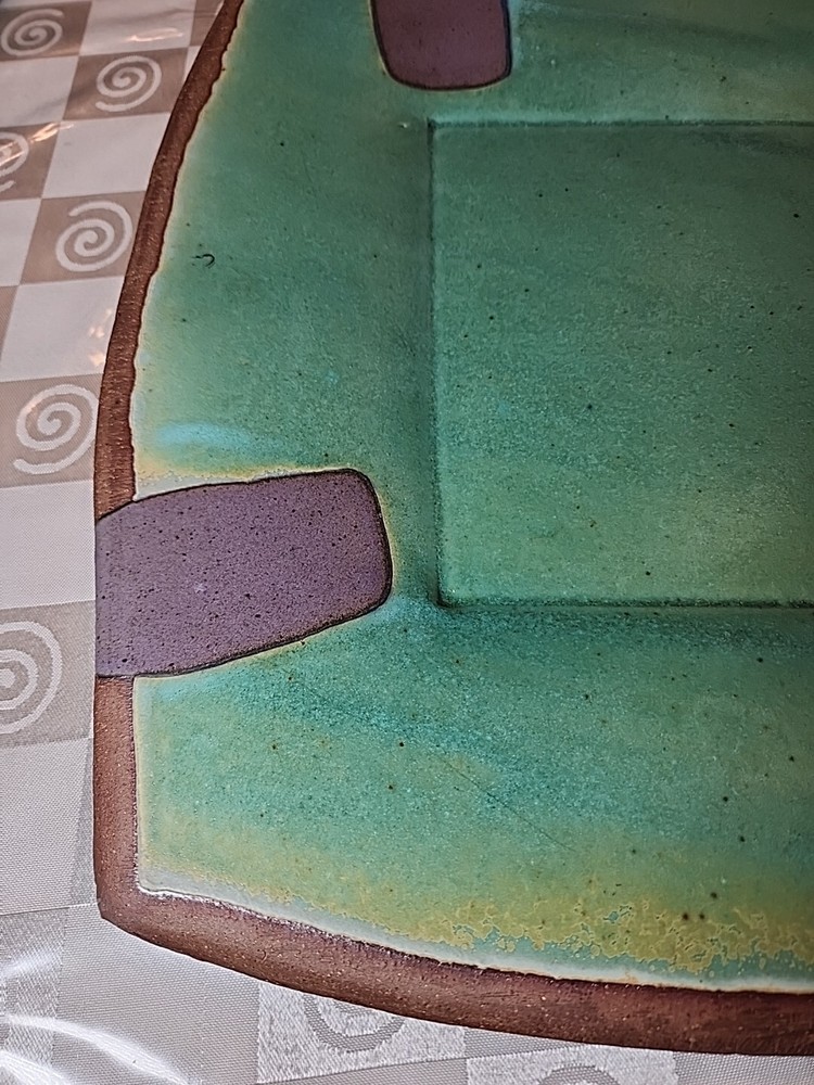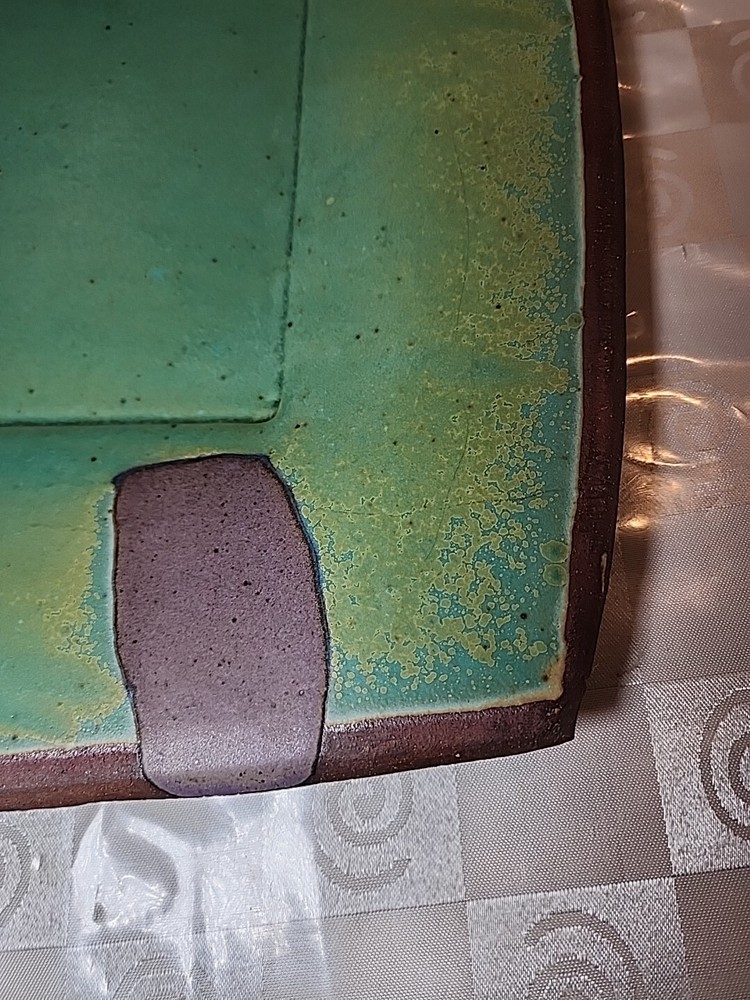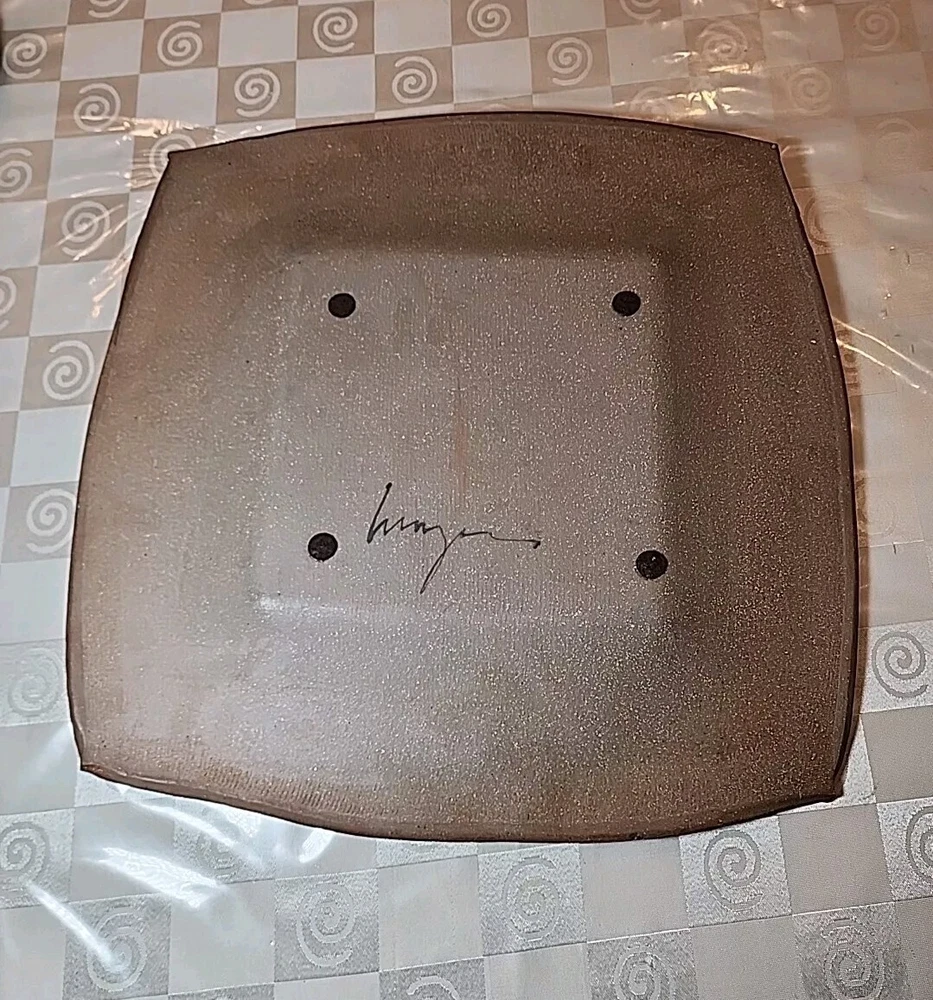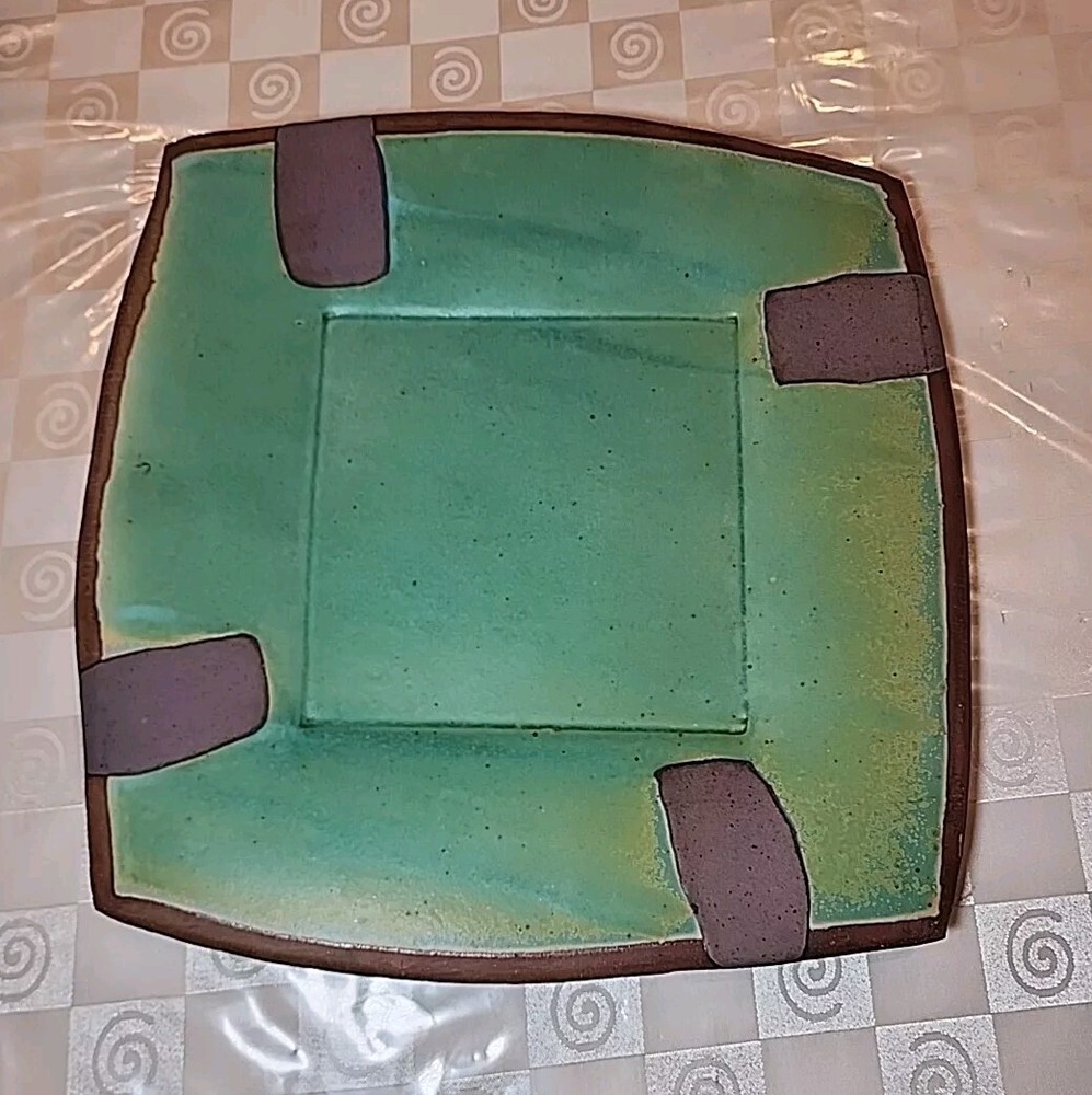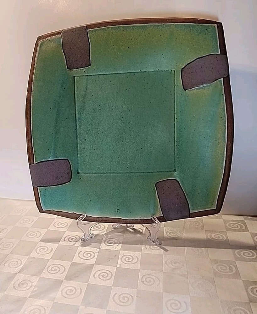 This vintage Studio pottery tray by HAYNE BAYLESS is made of green and gray stoneware, with a square shape and matte finish. Measuring 15.5 inches in height and width, it bears the artist's signature. This original art piece was crafted in the United States using traditional pottery techniques, weighing approximately 6 pounds.