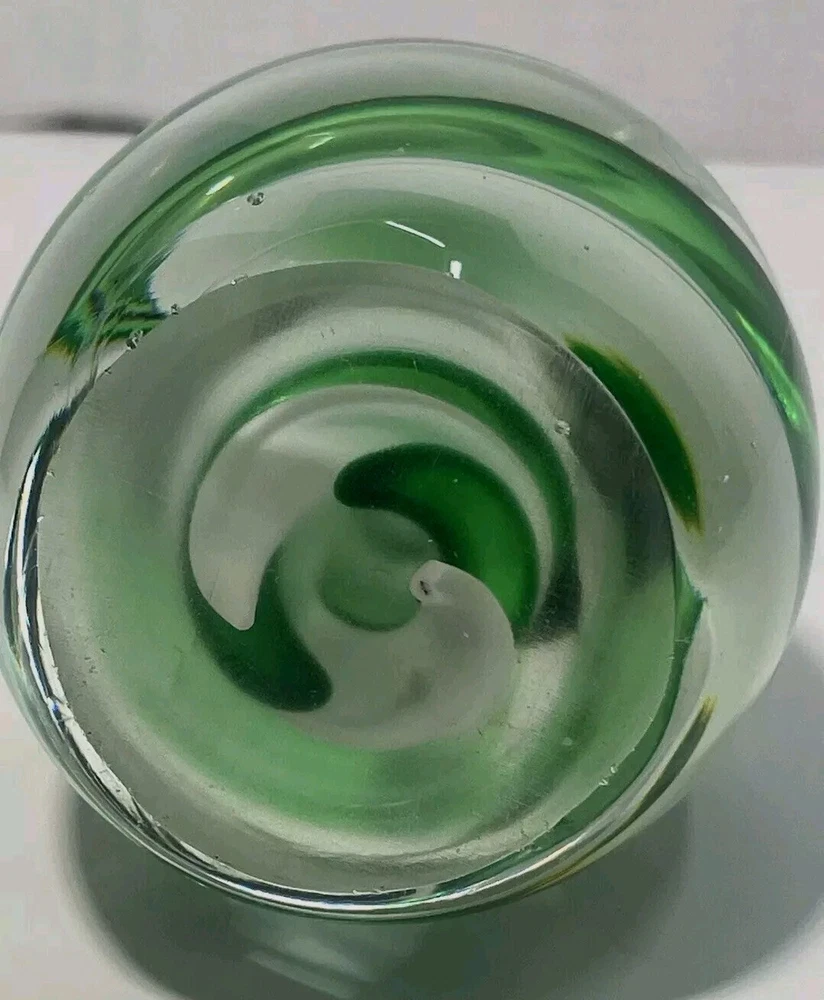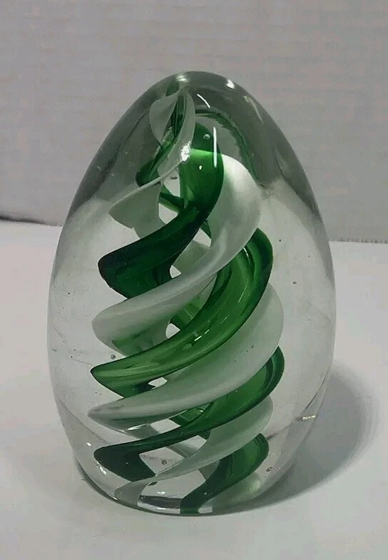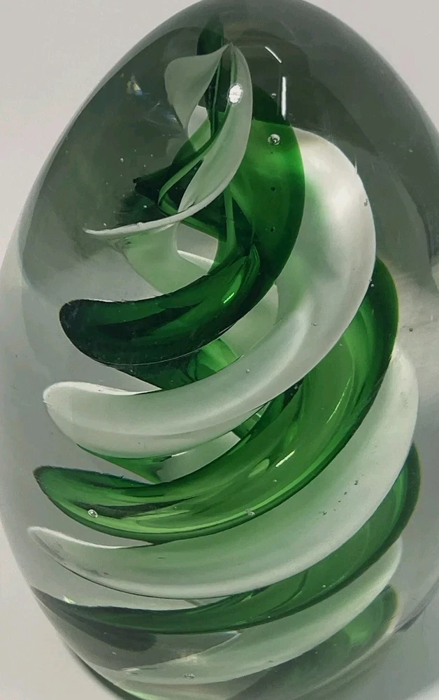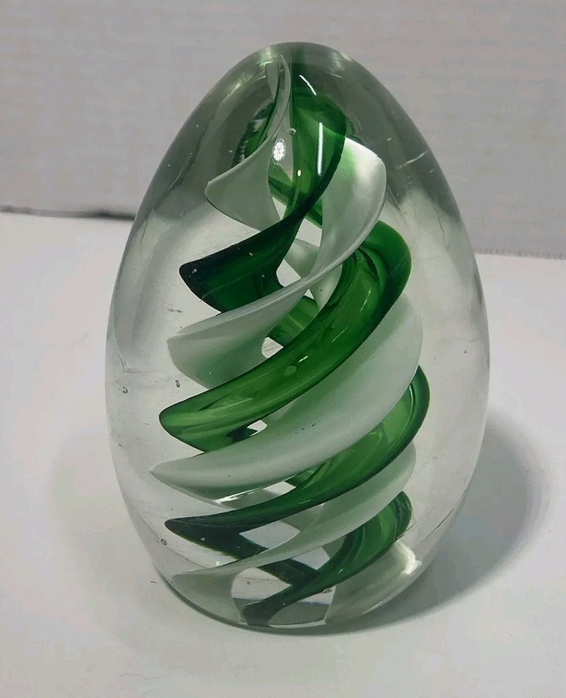 This vintage paperweight is a true work of art. The hand blown glass egg shape features a stunning green and white swirl pattern, making it a unique addition to any collection. The glossy finish adds to its beauty and the mid-century modern style is sure to impress. Crafted in the mid 20th century, this original piece is a rare find for collectors. The artist is unknown, but the hand blown glassmaking technique is evident in the production style. This paperweight is perfect for those who appreciate vintage, handmade items and want to add a touch of art glass to their decor.