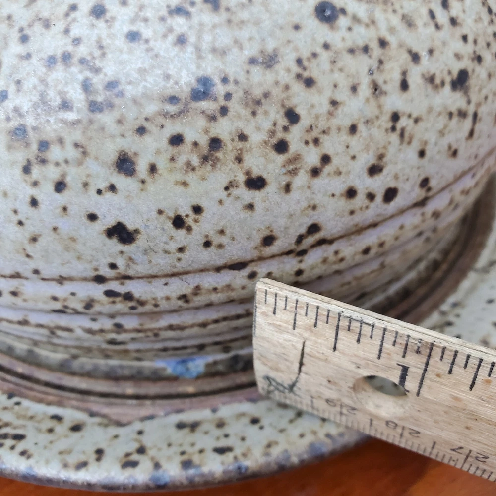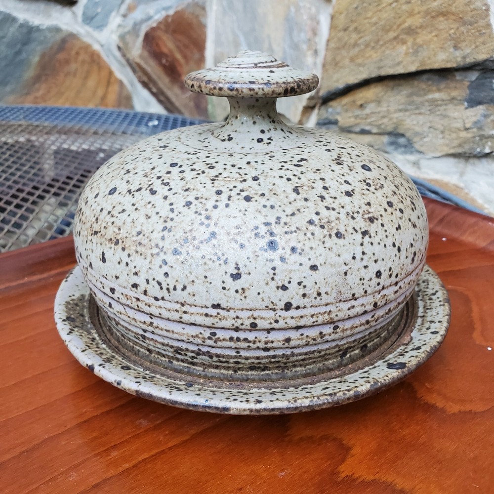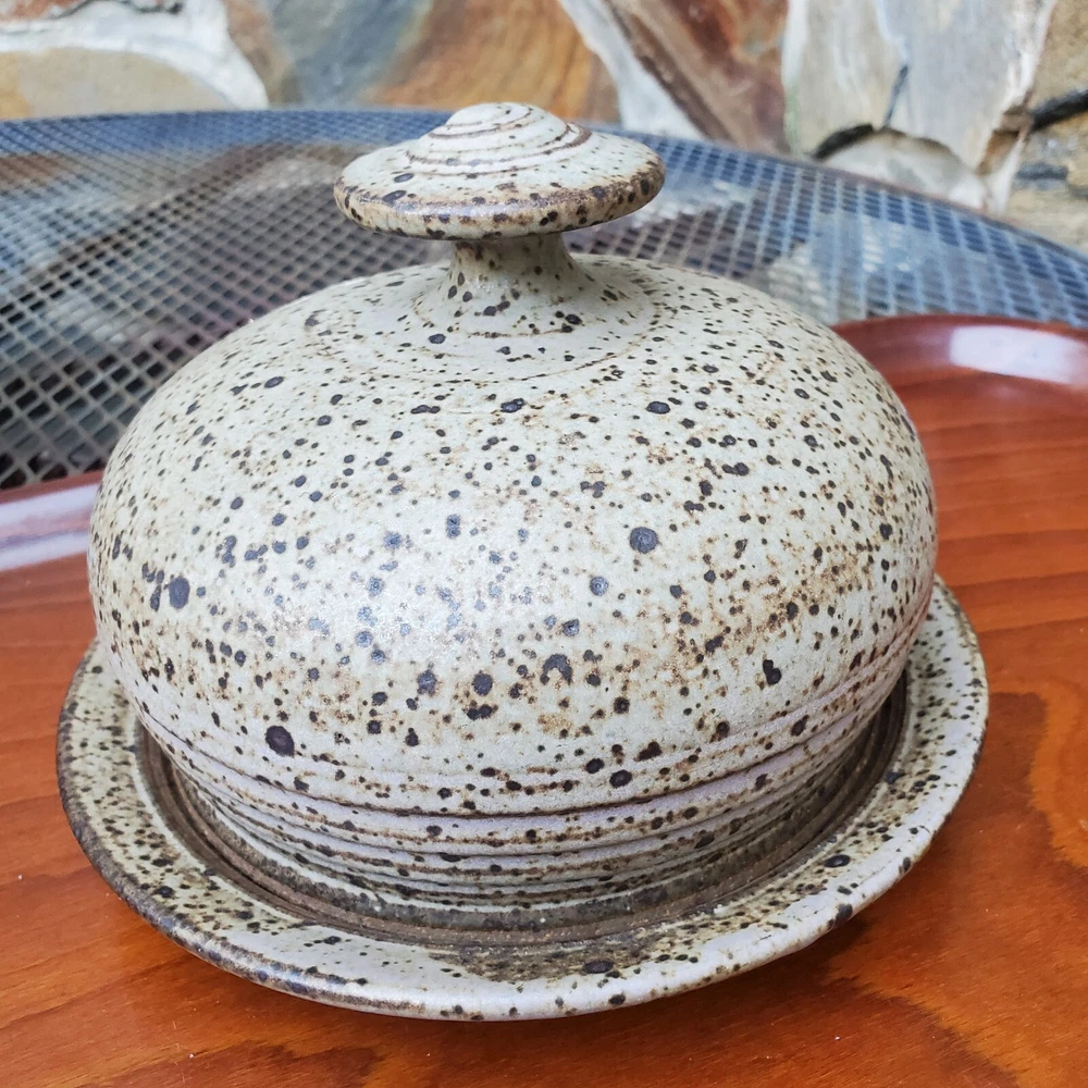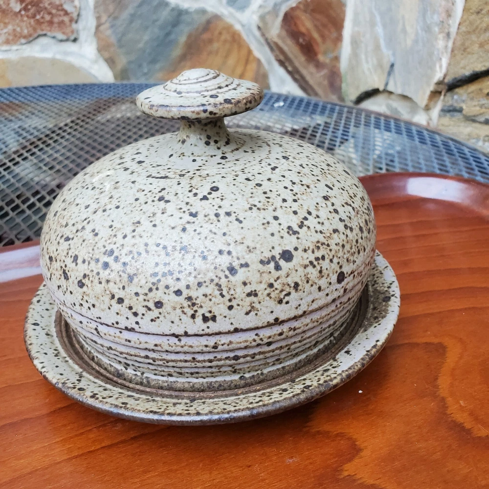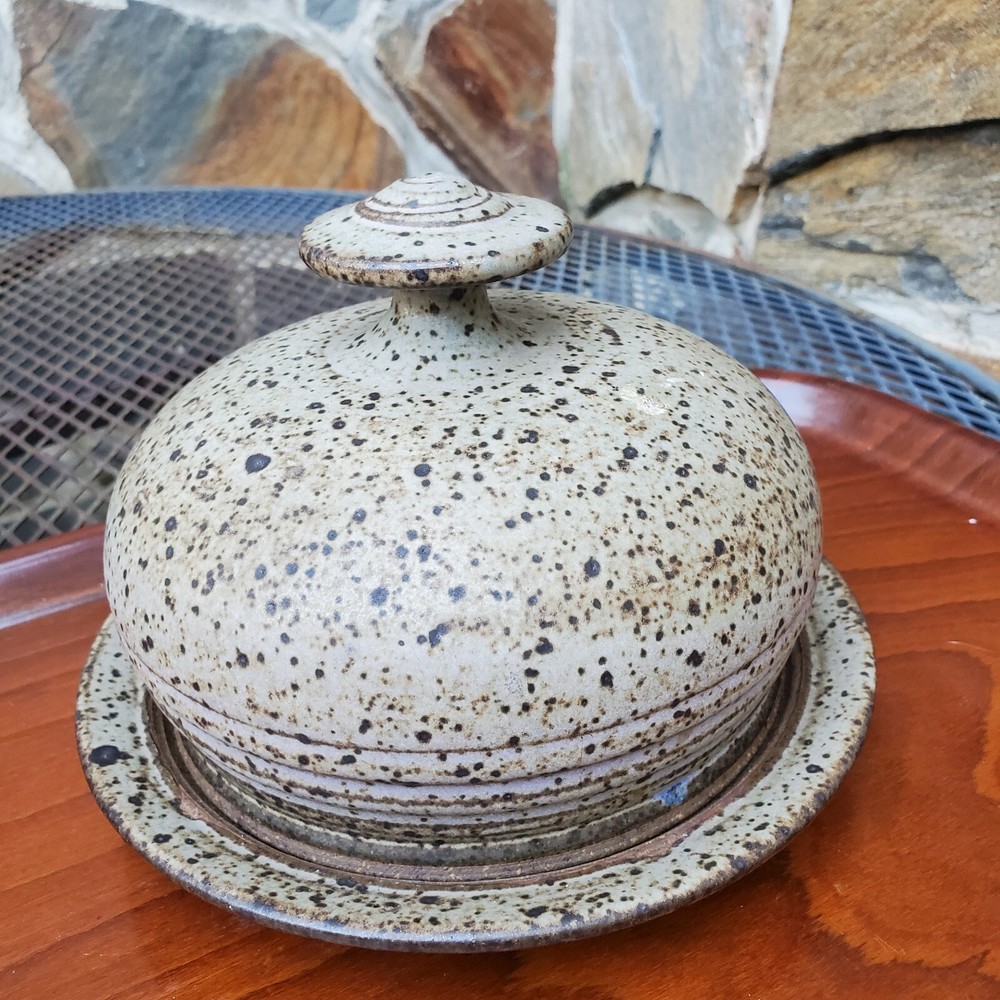 This vintage stoneware cheese dish is a unique addition to any kitchen. The domed shape and speckled pattern give it a rustic, yet elegant look. The dish is 6 inches in diameter and has an impressed backstamp. Made by an unknown origin, this American-themed dish is perfect for serving butter or cheese at a dinner party. The dish is handcrafted and signed, making it a one-of-a-kind piece. Add this decorative cookware to your collection today!