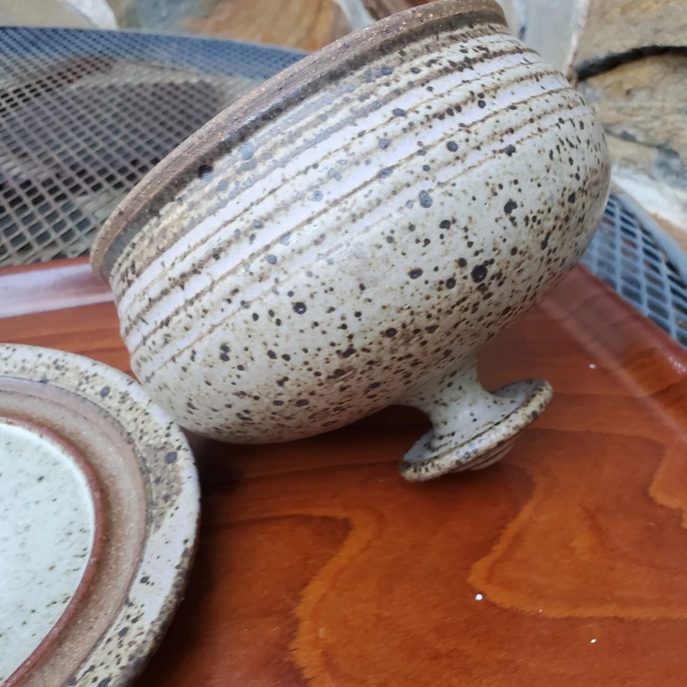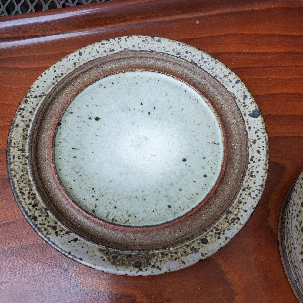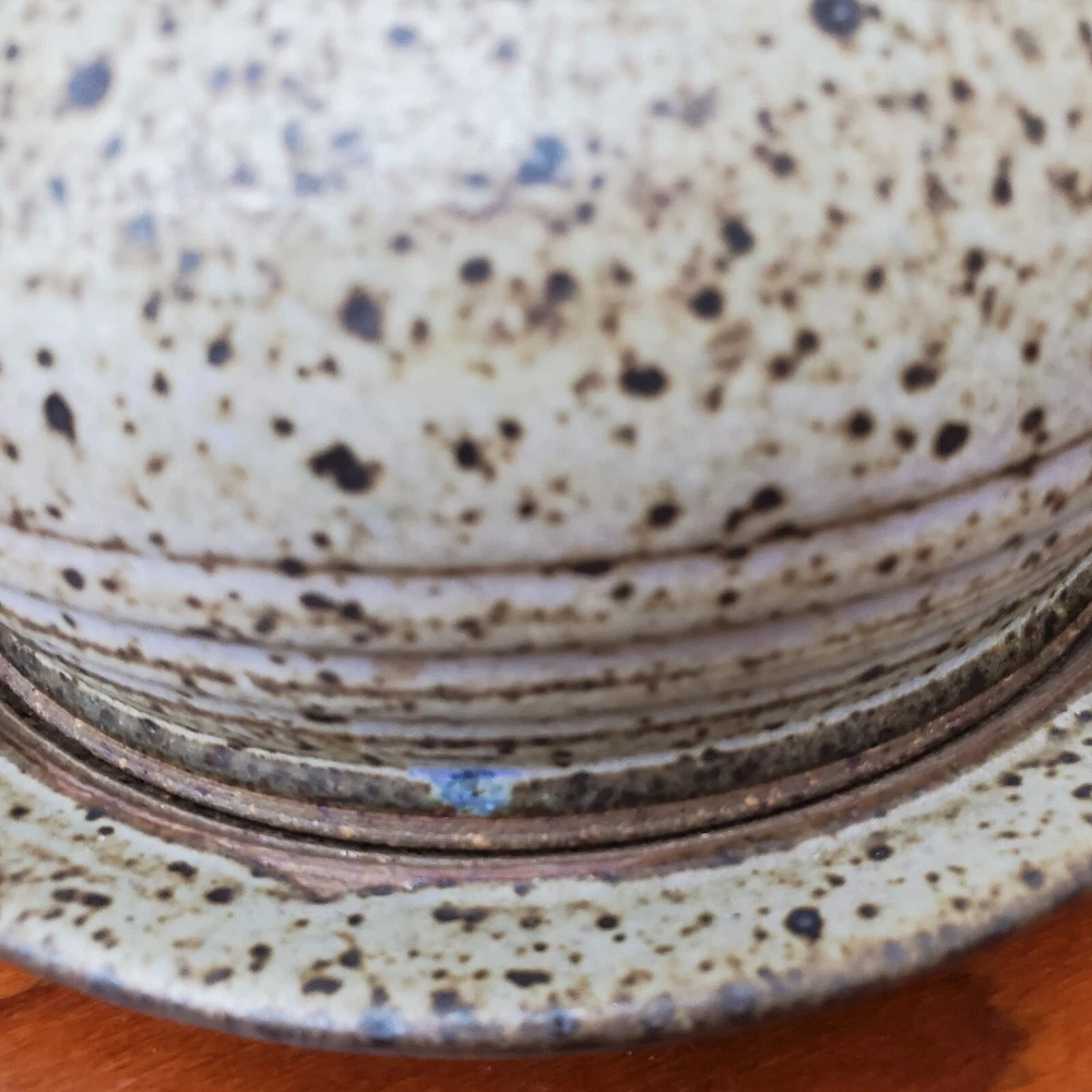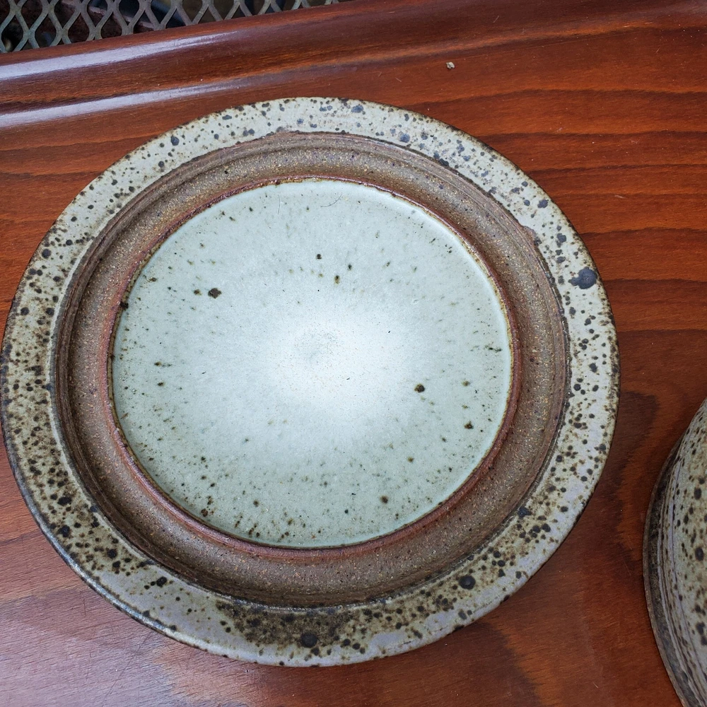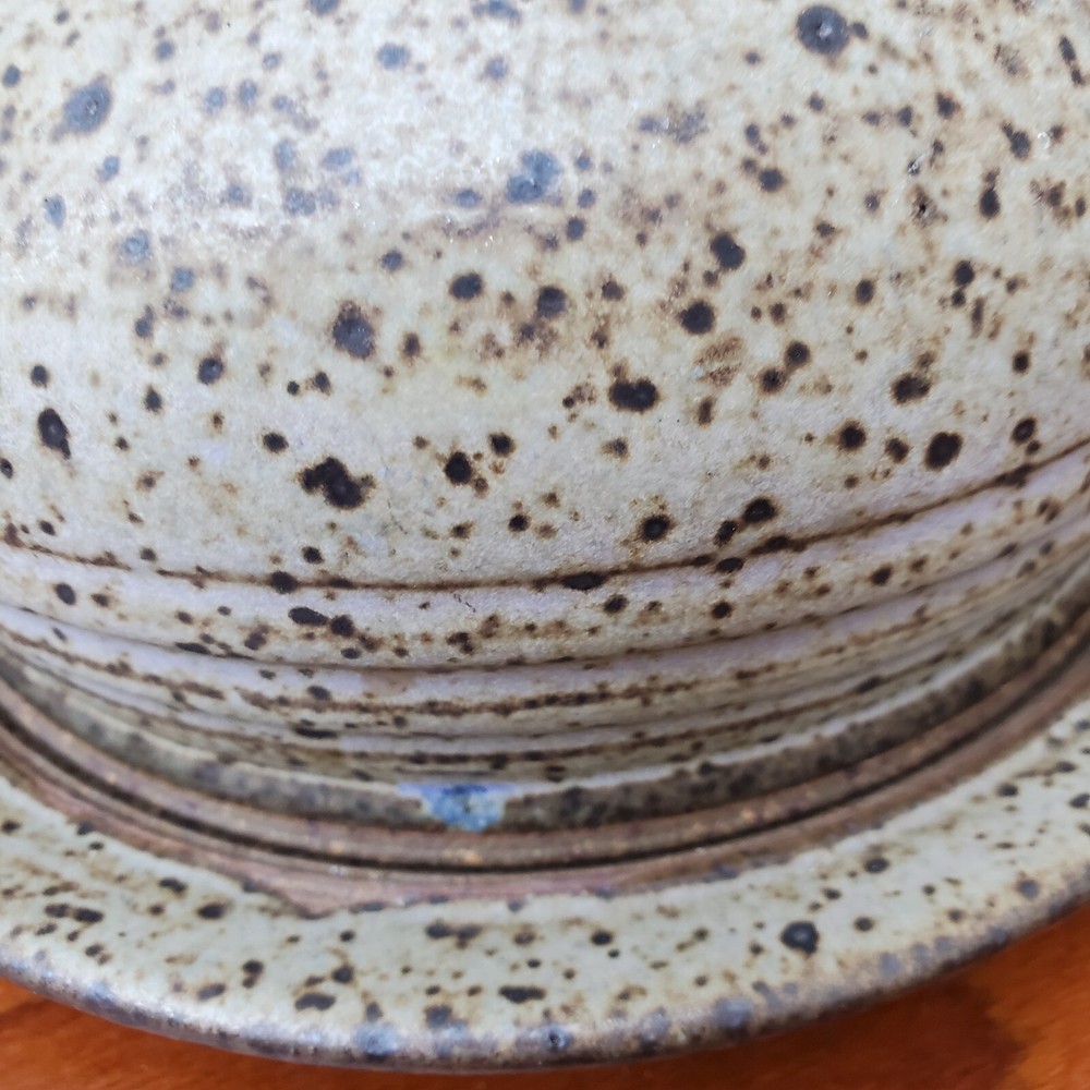 This vintage stoneware cheese dish is a unique addition to any kitchen. The domed shape and speckled pattern give it a rustic, yet elegant look. The dish is 6 inches in diameter and has an impressed backstamp. Made by an unknown origin, this American-themed dish is perfect for serving butter or cheese at a dinner party. The dish is handcrafted and signed, making it a one-of-a-kind piece. Add this decorative cookware to your collection today!