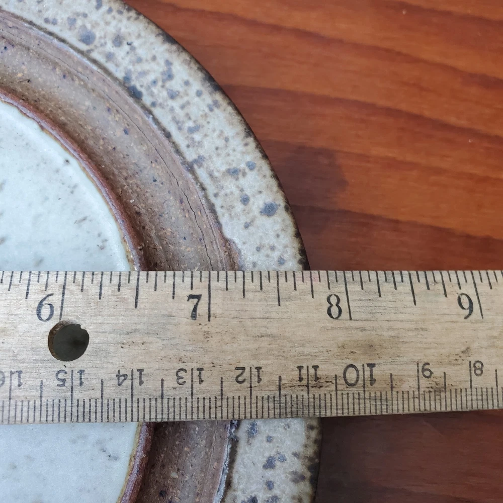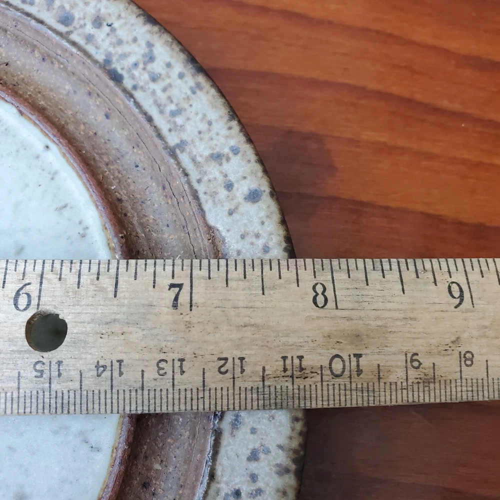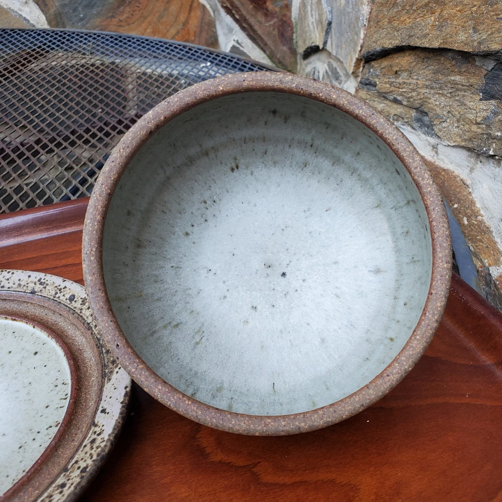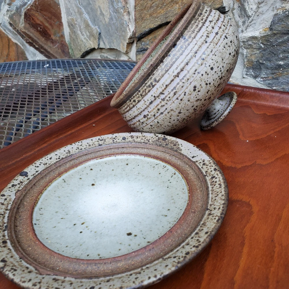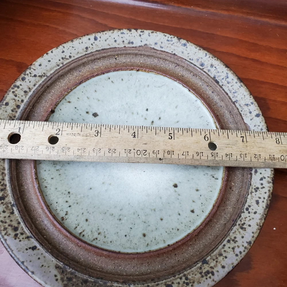This vintage stoneware cheese dish is a unique addition to any kitchen. The domed shape and speckled pattern give it a rustic, yet elegant look. The dish is 6 inches in diameter and has an impressed backstamp. Made by an unknown origin, this American-themed dish is perfect for serving butter or cheese at a dinner party. The dish is handcrafted and signed, making it a one-of-a-kind piece. Add this decorative cookware to your collection today!
