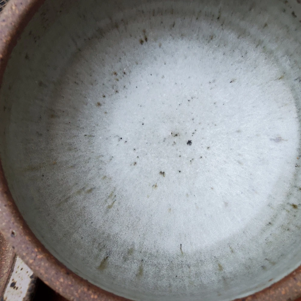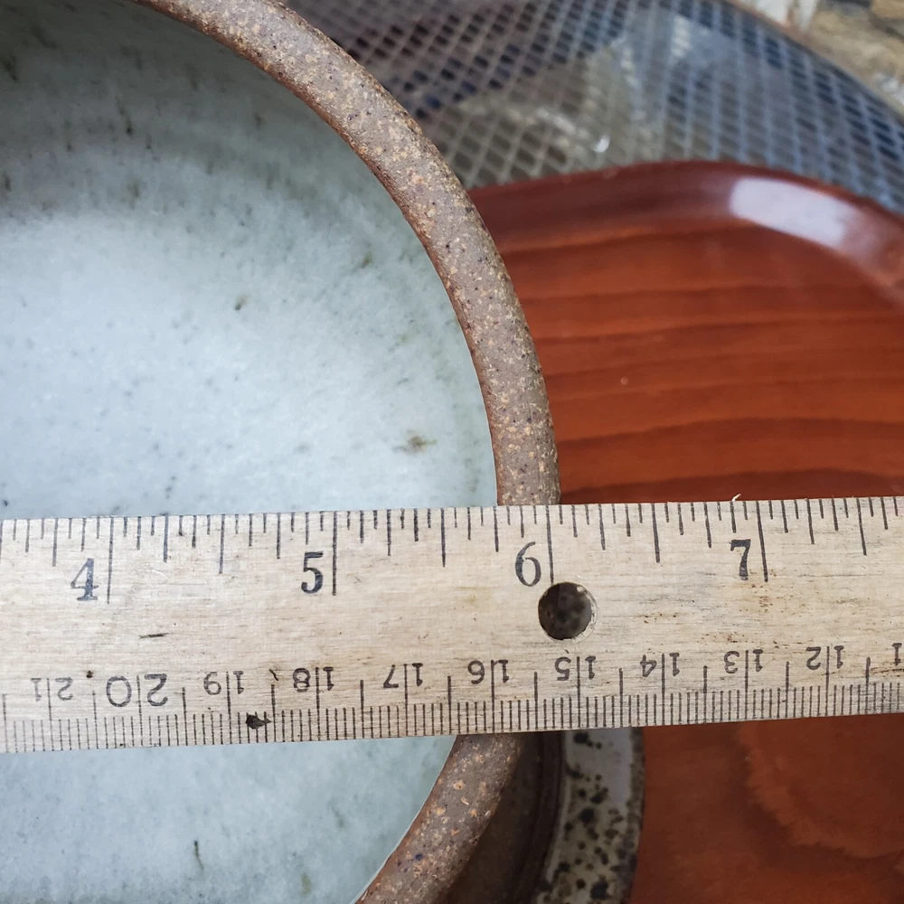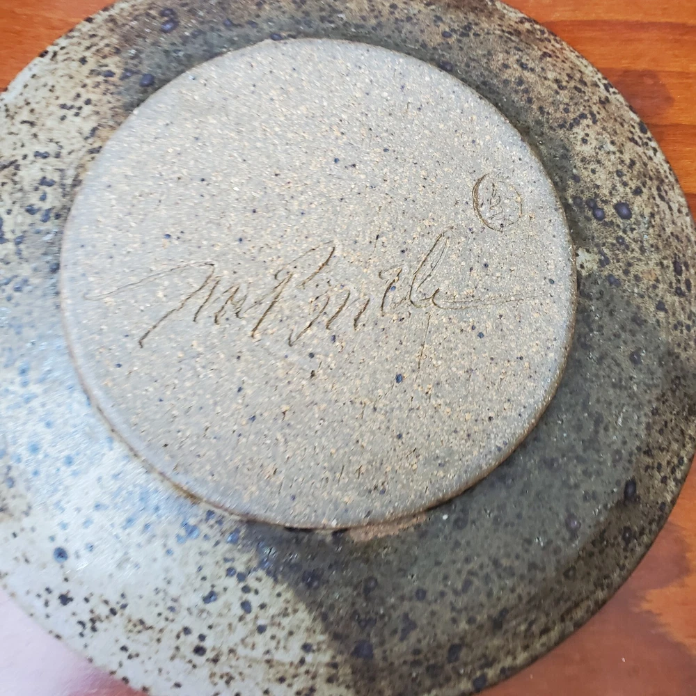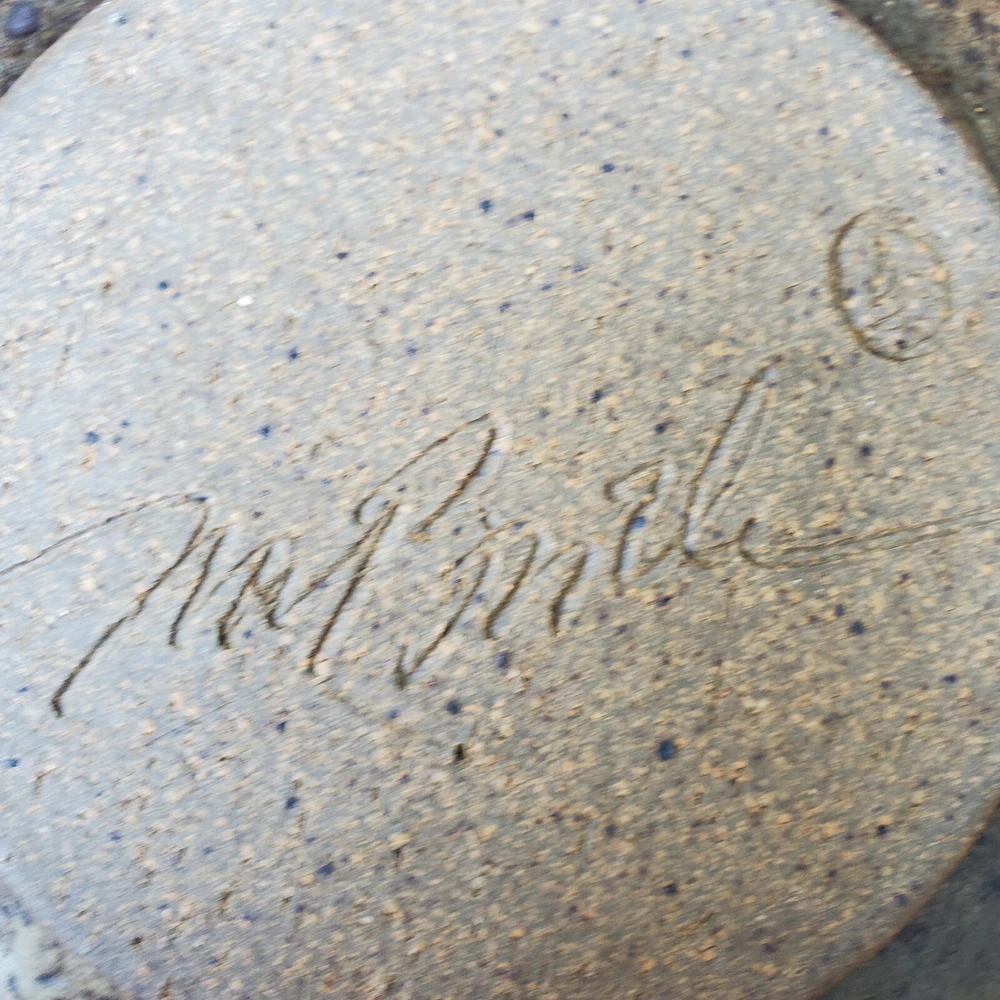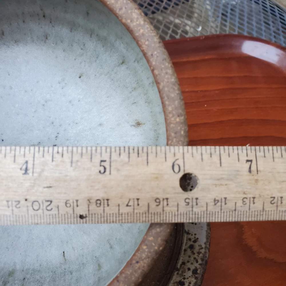 This vintage stoneware cheese dish is a unique addition to any kitchen. The domed shape and speckled pattern give it a rustic, yet elegant look. The dish is 6 inches in diameter and has an impressed backstamp. Made by an unknown origin, this American-themed dish is perfect for serving butter or cheese at a dinner party. The dish is handcrafted and signed, making it a one-of-a-kind piece. Add this decorative cookware to your collection today!