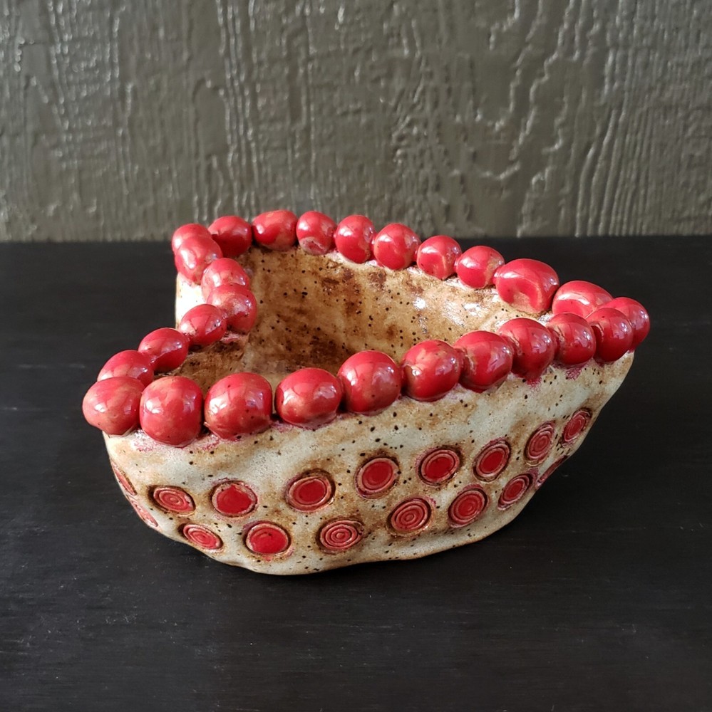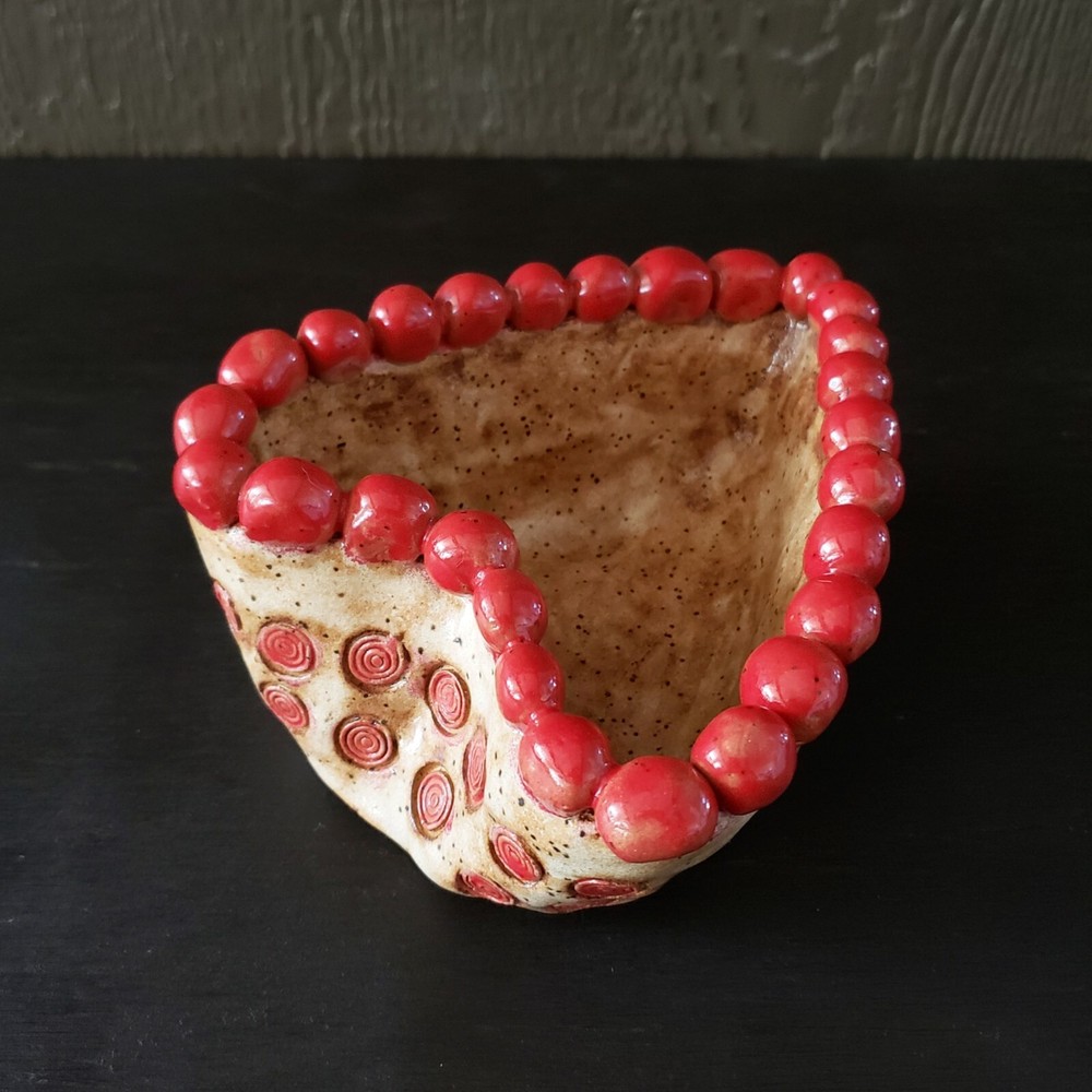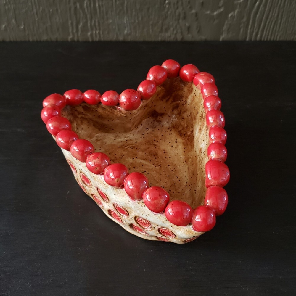 Vintage handmade studio art pottery dish. - Created in a heart shape with a raised rim and indented circular swirl patterns on the sides - Beige base tone hand painted with red highlights - Heavy, high quality construction - Perfect for trinkets, jewelry, or just as an ornament - Excellent condition with no cracks or chips Measurements: 6 1/2" x 5 1/2" x 2 3/4"