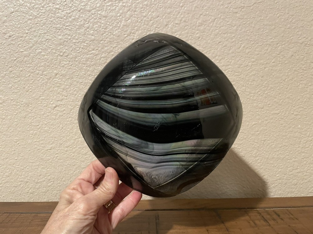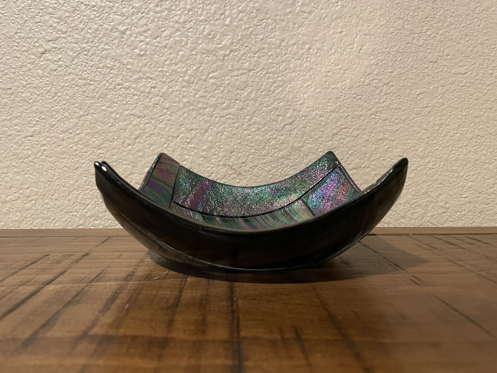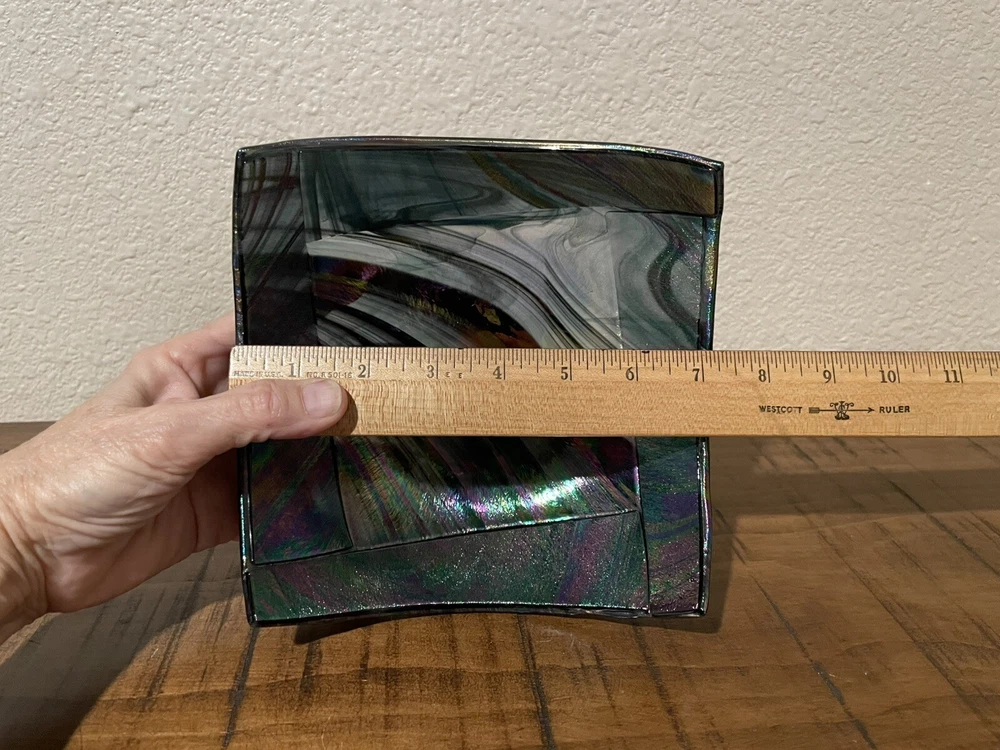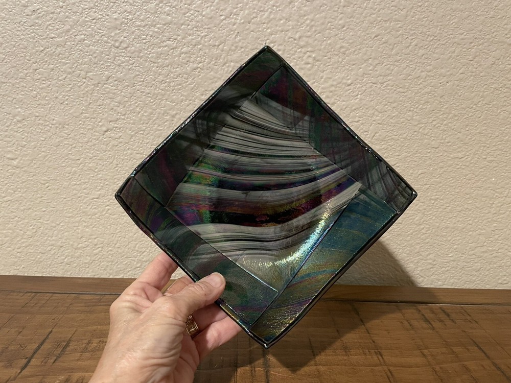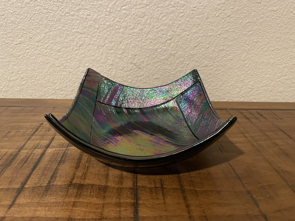 For sale is a handcrafted studio art glass handkerchief bowl. It is a 5” x 5” square and it is 3” deep. The glass is black and it has an iridescent finish on the inside. It has an artist stamp/signature on the bottom. There is minor surface scratching on the bottom, but overall this bowl is in excellent condition with no chips or cracks. It is a stunning piece of art.