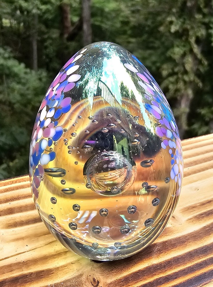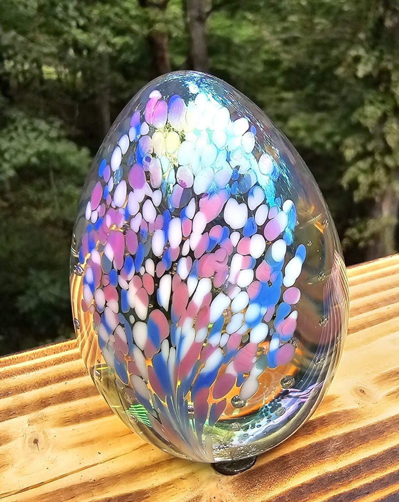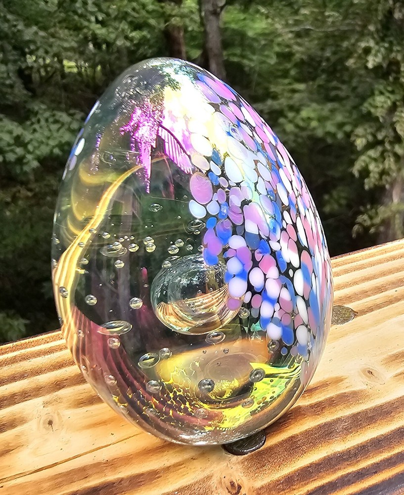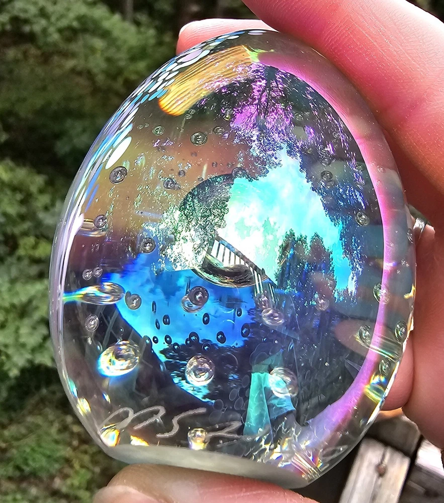 This vintage paperweight is a stunning addition to any collection. The oval shape and iridescent color make it a unique piece that is sure to catch the eye....
