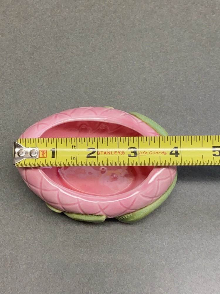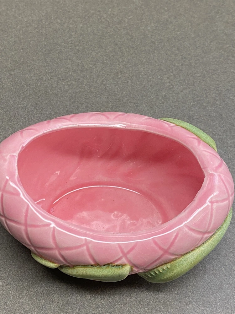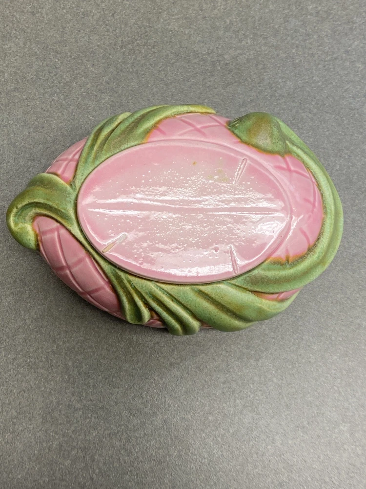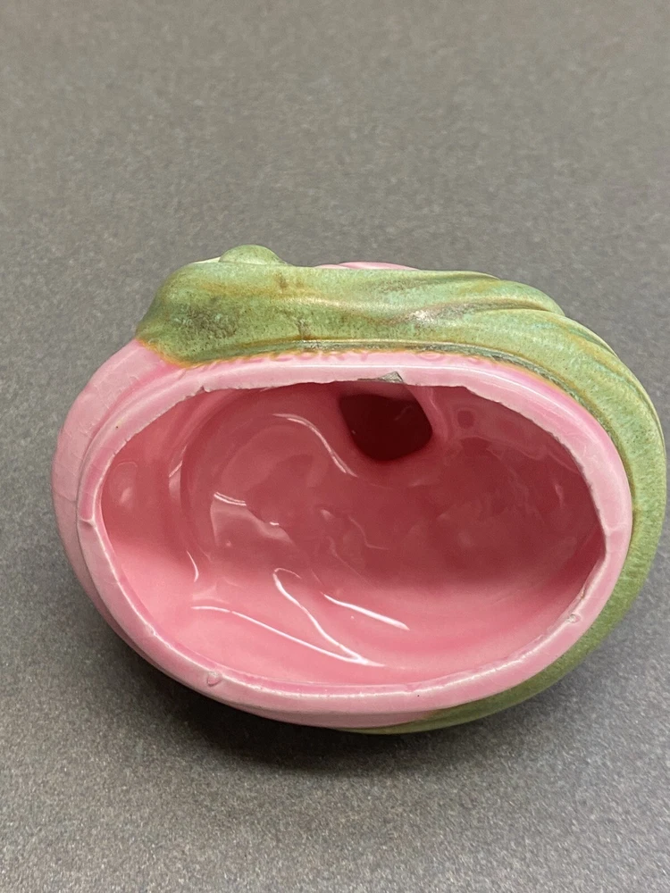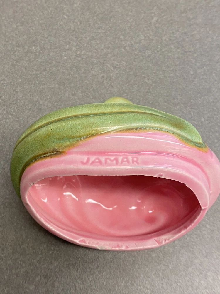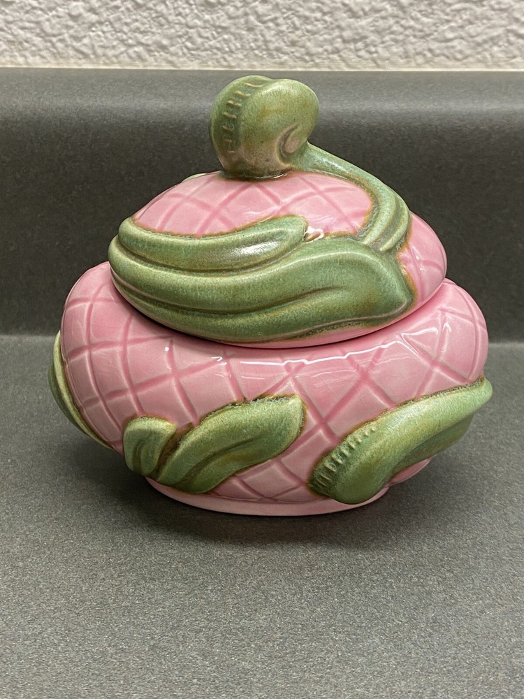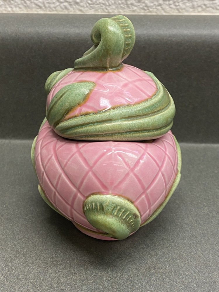 Vintage Jamar Mallory Ceramic Studio Egg Shaped Trinket Box Pink with Green Accents Stamped 1967 Measurements are approximate: 3.5 inches tall 4 inches wide Estate find. There is a small chip on the inside rim of the lid. It is not visible when the lid is on the box. Please see pics where this flaw is highlighted. Carefully packaged and shipped via USPS Parcel Select