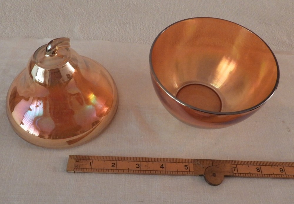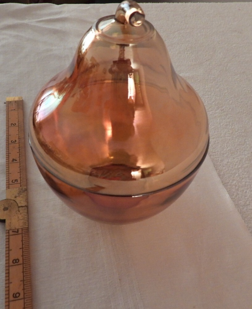This marvelous vintage 1930s pear shaped box was made by Jeannette, a well-known American glass maker in carnival glass in the iridescent marigold color. This candy dish or trinket box is shaped like a pear and even has a stem at the top. Backstamp: there are no apparent backstamps, but this design is known to be made by Jeannette. Measurements for this fabulous creation are: Height from top to bottom=7 inches, Width at widest=5 inches. This marvelous pear shaped box has been well cared for, gently used and is in excellent vintage condition, free from chips, cracks or other imperfections. Please review photos for additional information. It is the perfect addition to your carnival collection, particularly if you admire the whimsical shape.