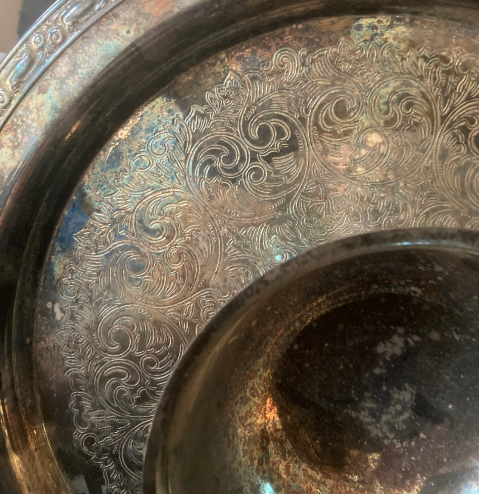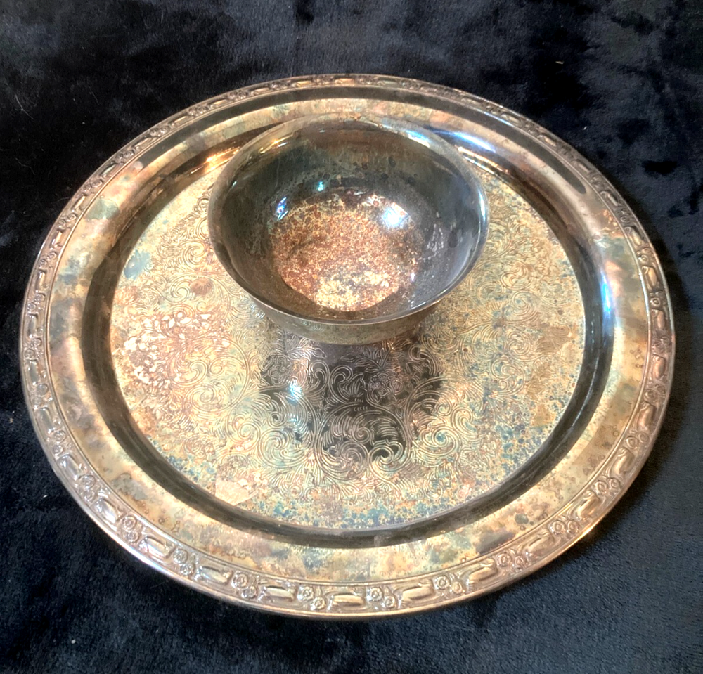 Elevate your hosting elegance with the Vintage Large 12.5" Chip/Veggie & Dip Tray from Oneida Ltd. This timeless piece, crafted from high-quality silverplate, showcases a classic decor pattern that effortlessly complements any table setting. The tray features an attached bowl, perfect for serving a variety of snacks and appetizers. Whether you're entertaining guests or enjoying a casual family dinner, this tray will be a staple in your serving collection. Its intricate design and durable composition reflect the esteemed craftsmanship of Oneida, ensuring both style and longevity. *** WM. A. ROGERS BY ONEIDA LTD. SILVERSMITHS....BEAUTIFUL FLOWER DESIGN AROUND THE PERIMETER.....NO DENTS OR REPAIRS.....IN AS FOUND CONDITION
