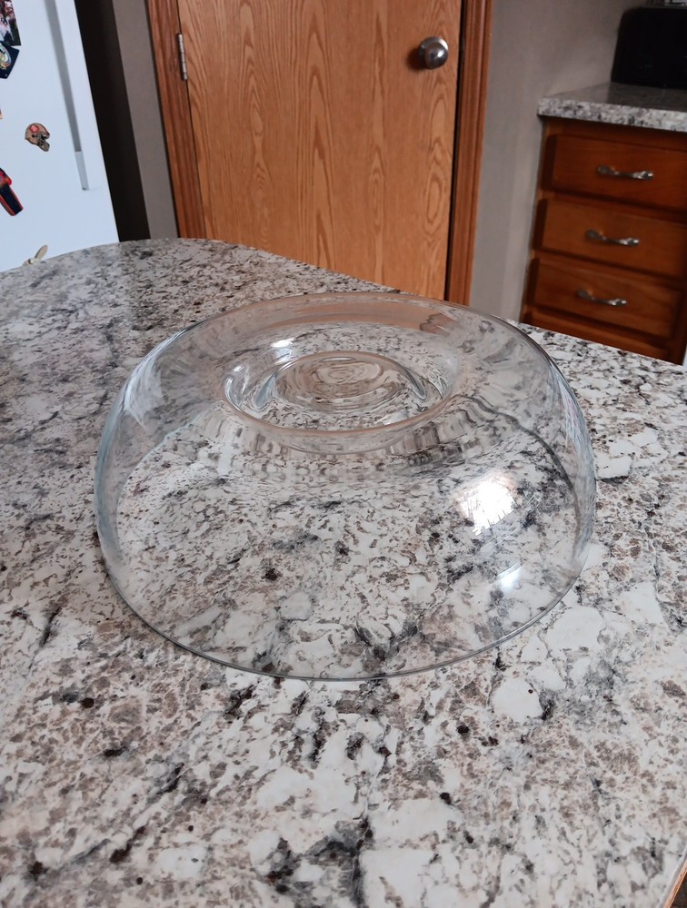 Vintage large clear glass chip and dip serving bowl. 11" diameter, 3 1/4" depth. Has 1 tiny chip on the inside rim, otherwise good condition.