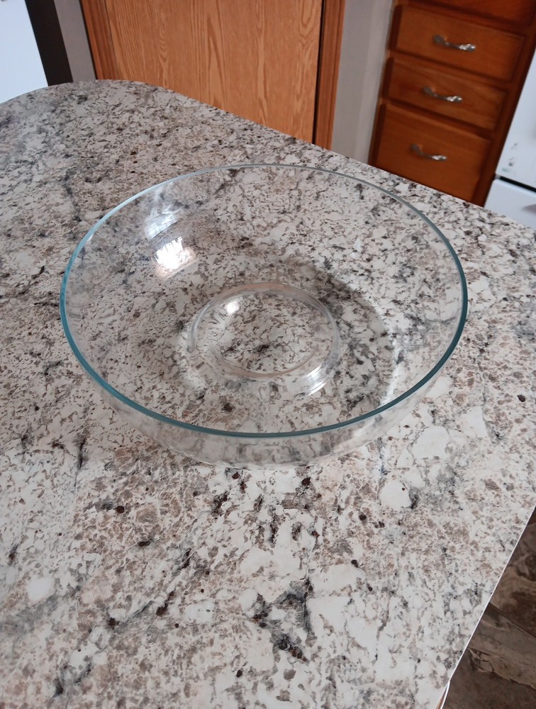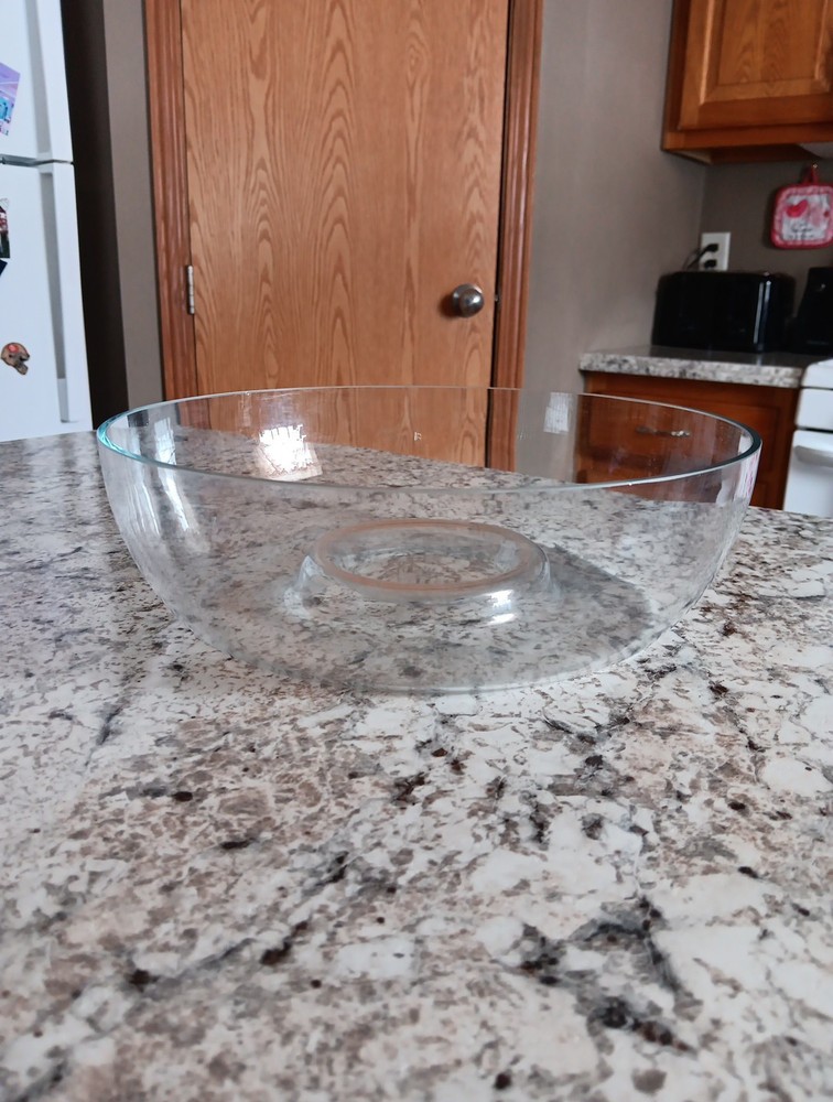 Vintage large clear glass chip and dip serving bowl. 11" diameter, 3 1/4" depth. Has 1 tiny chip on the inside rim, otherwise good condition....