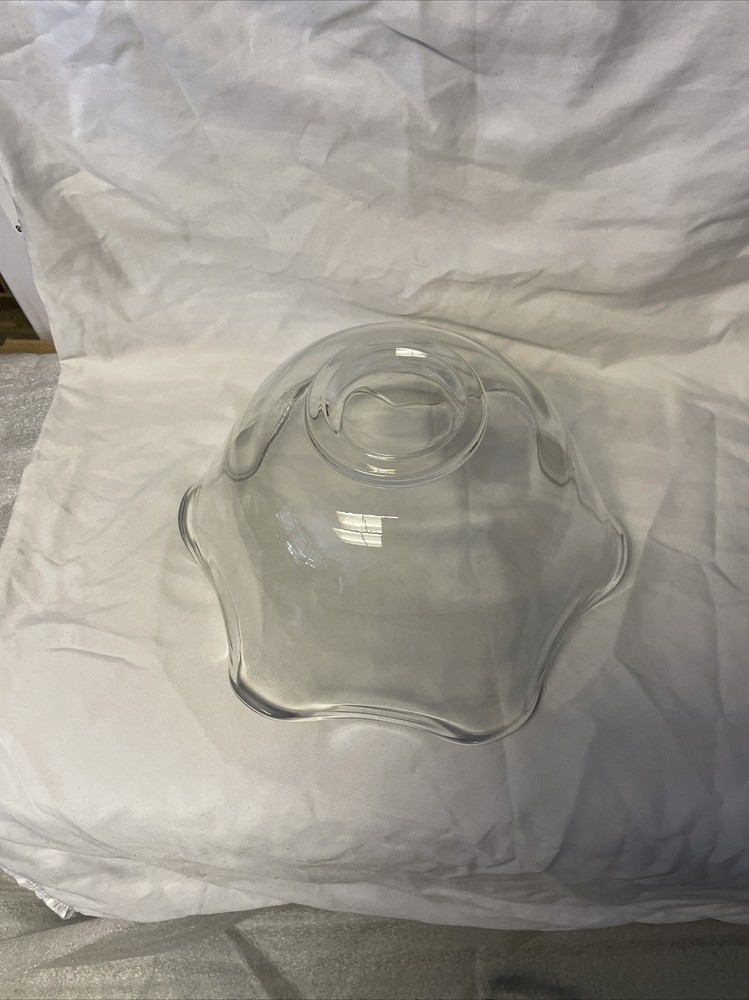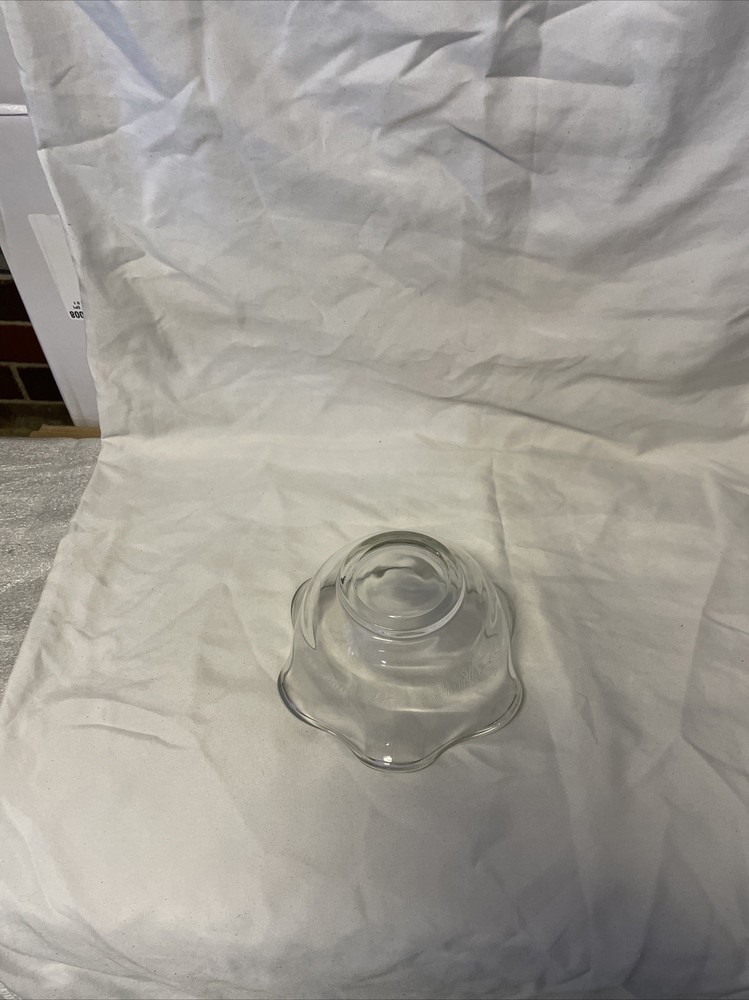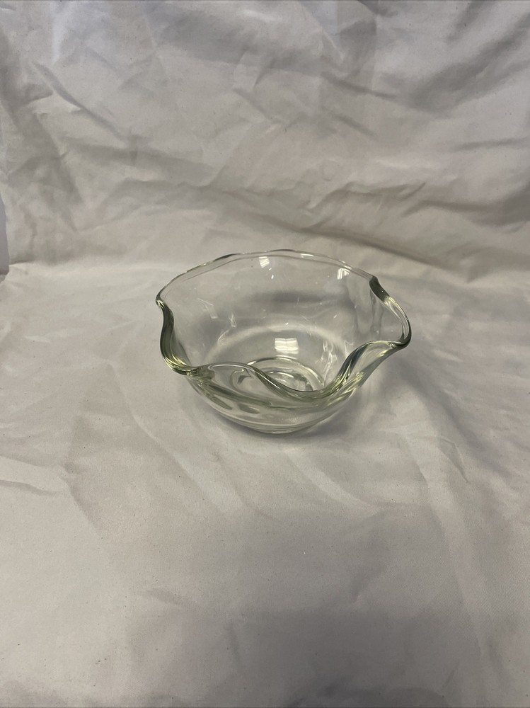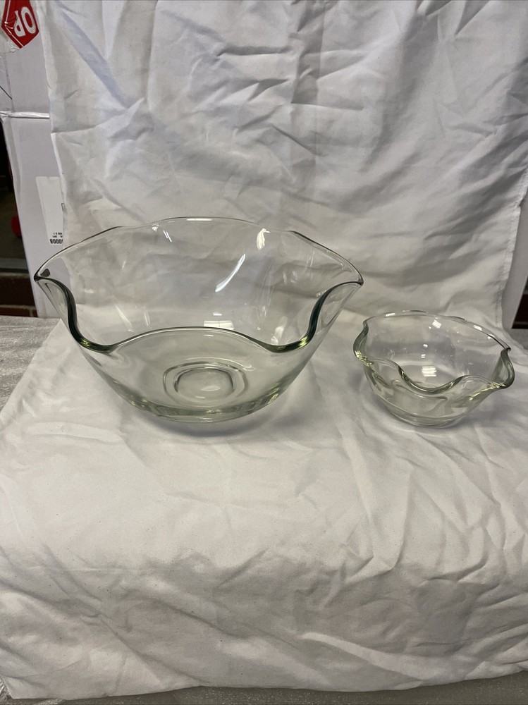 This vintage MCM glass bowl set is perfect for any gathering. The clear glass allows the colorful chips and dips to stand out, and the ruffled wavy edge adds a touch of elegance. The set includes both a large bowl and a smaller dip bowl, perfect for any size party. The glass is in great shape and has been well cared for. It's sure to be a hit at your next event! Does have a small scuff. See pictures.