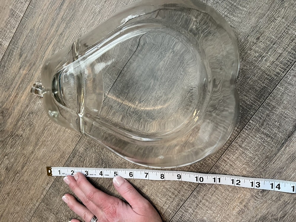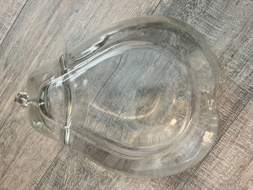 This vintage large pear-shaped serving bowl is a stunning addition to any kitchen or dining room. Crafted from clear glass, it features a beautiful oval shape and a diameter of 13 inches. The dish is perfect for serving chips, dips, or other small appetizers and comes with a set of dipping bowls. The mid-century modern style of this bowl makes it a great choice for all occasions, while its decorative design adds a touch of vintage charm to any space. The bowl is dishwasher safe and weighs 3 pounds and 6 ounces. It measures 3.5 inches in height and depth, and 9.5 inches in width. Add this unique and stylish piece to your collection today!