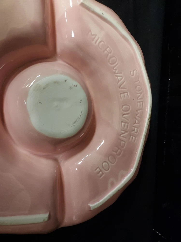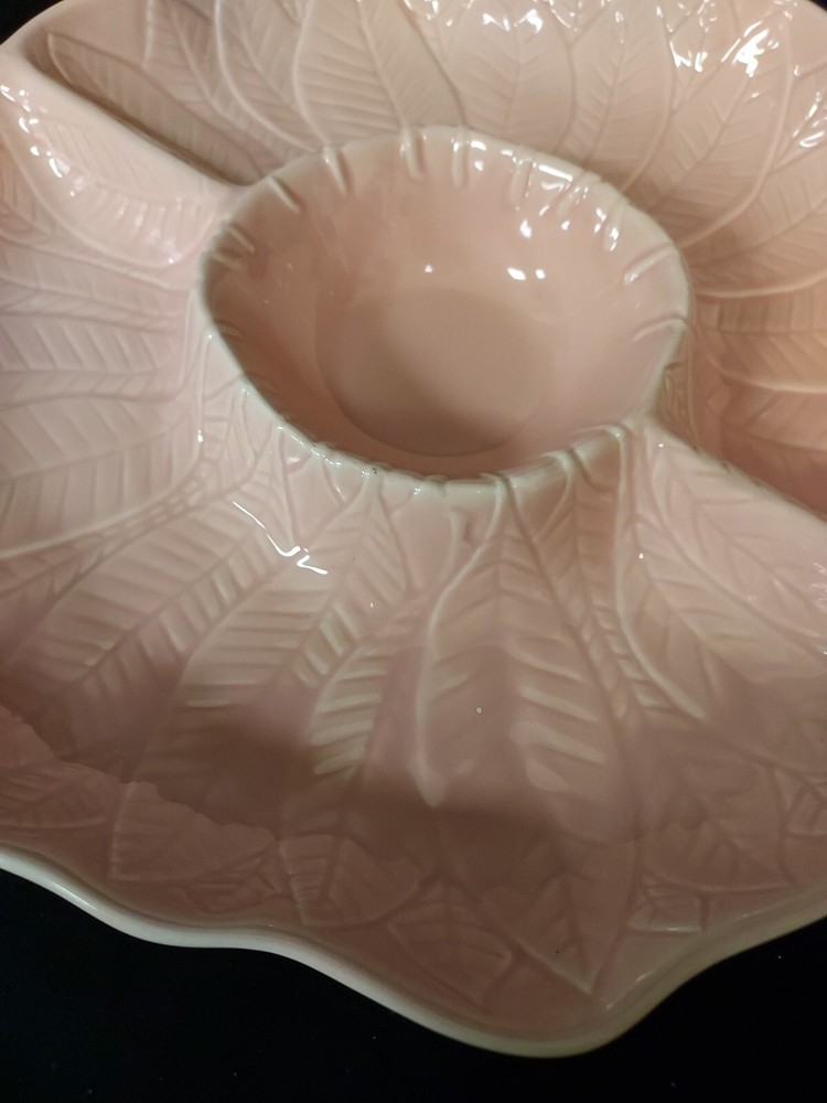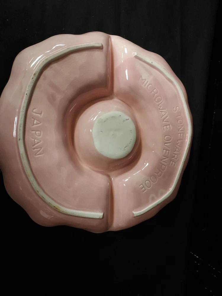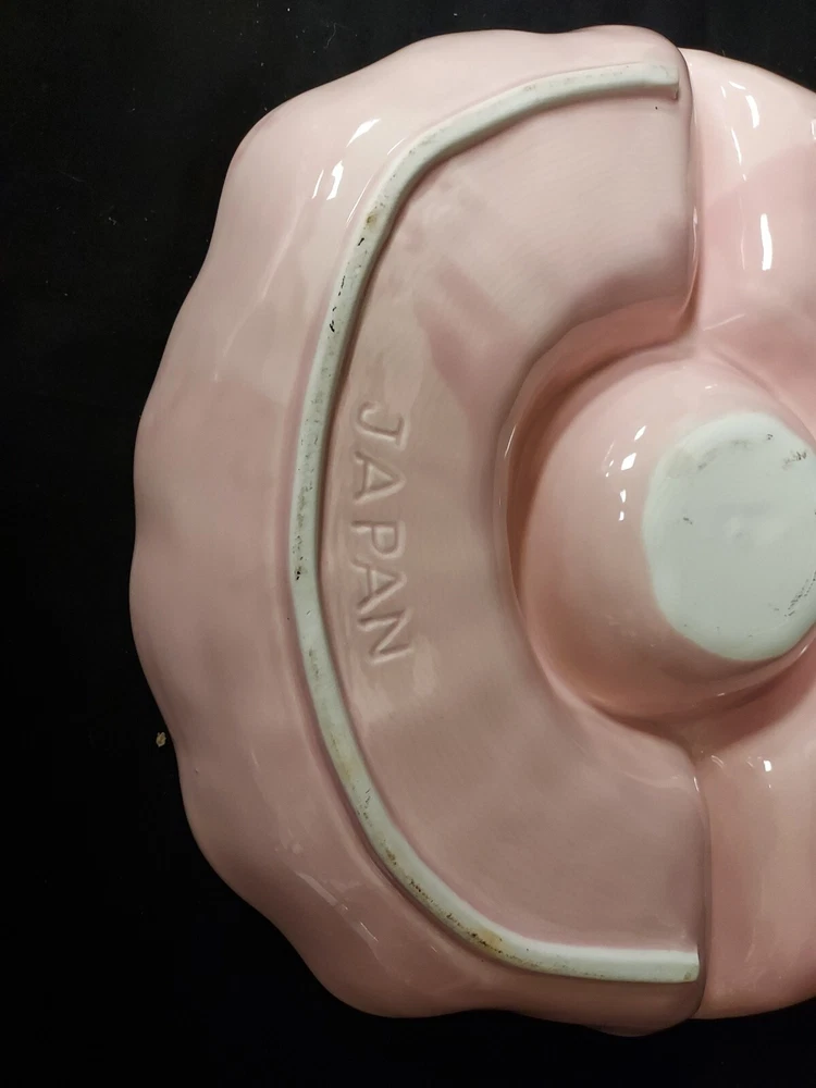 IThis vintage stoneware chip holder features a large square shape with a pink leaf pattern, perfect for all occasions. With three compartments, it measures 11.5 inches in length and width, with a depth of 1.5 inches. The design reflects a floral and garden theme, ideal for a cottage-style setting. Made in Japan, this glossy chip/dip holder is not only oven and microwave safe but also adds a touch of elegance to any dining experience.
